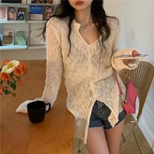 白い日焼け止めブラウス女性の夏の薄いアイスシルクトップデザイン不規則なスリットニットVネック長袖Tシャツ ロング ホワイト サマー 夏物 7460066774886058