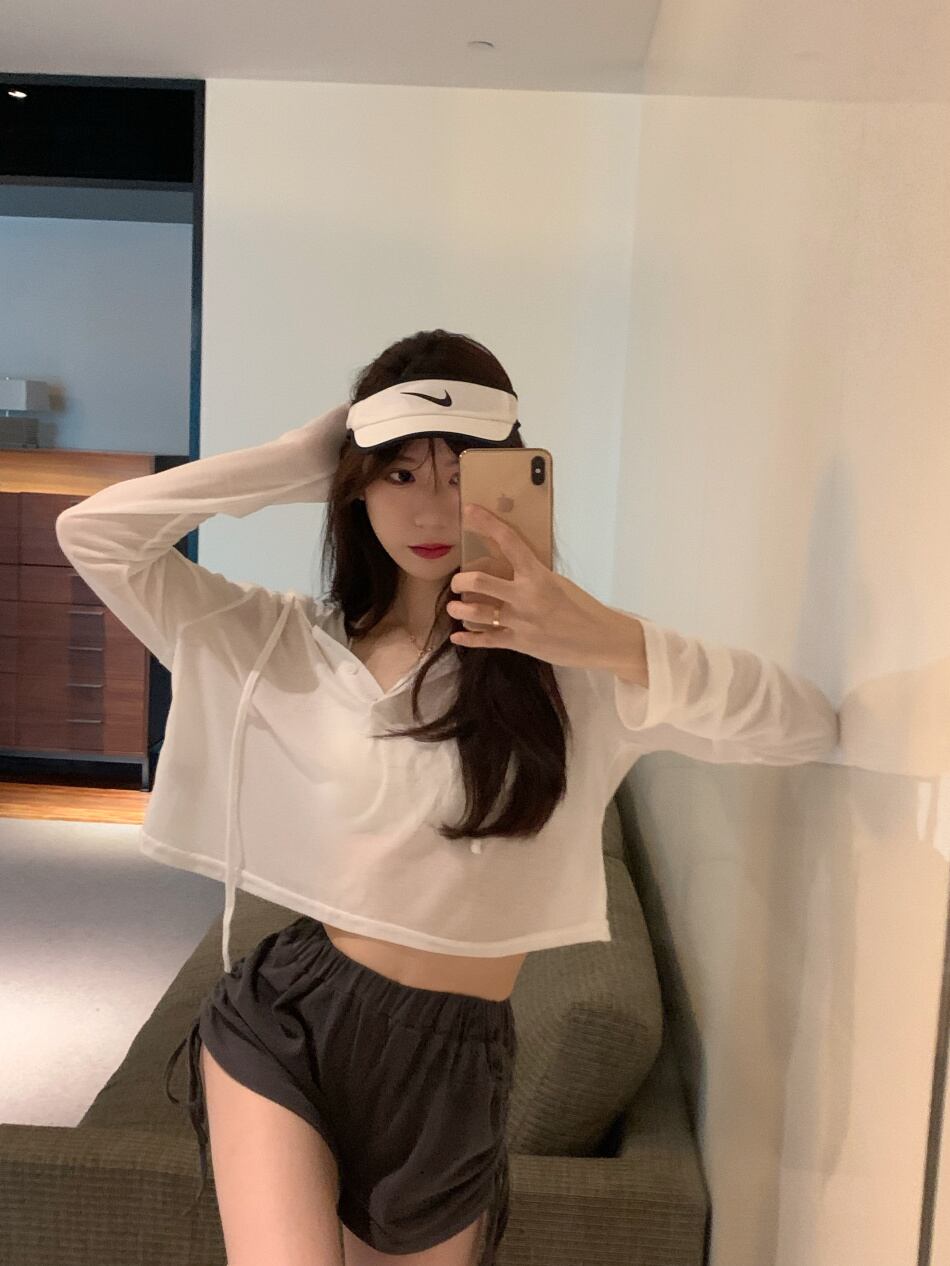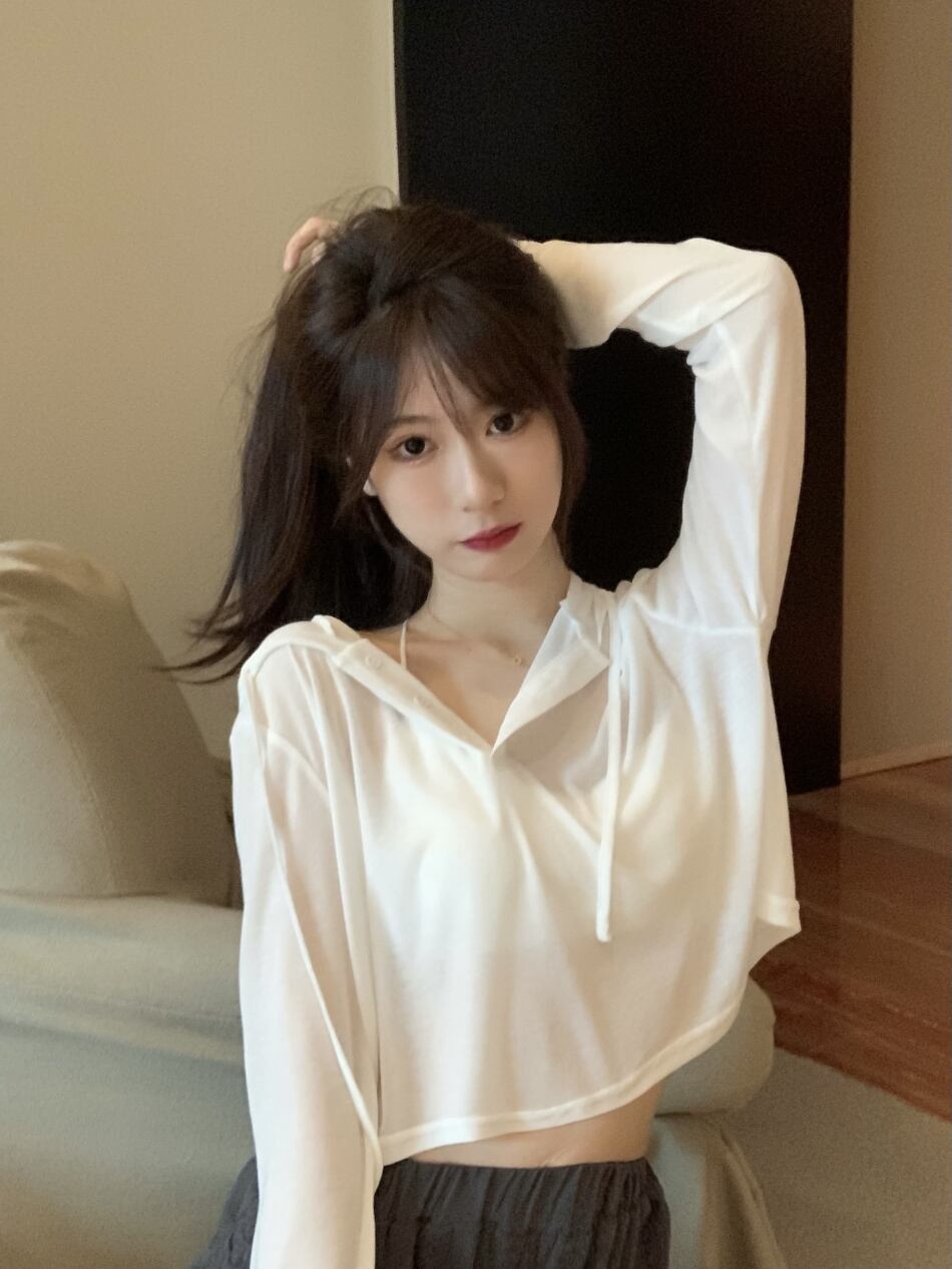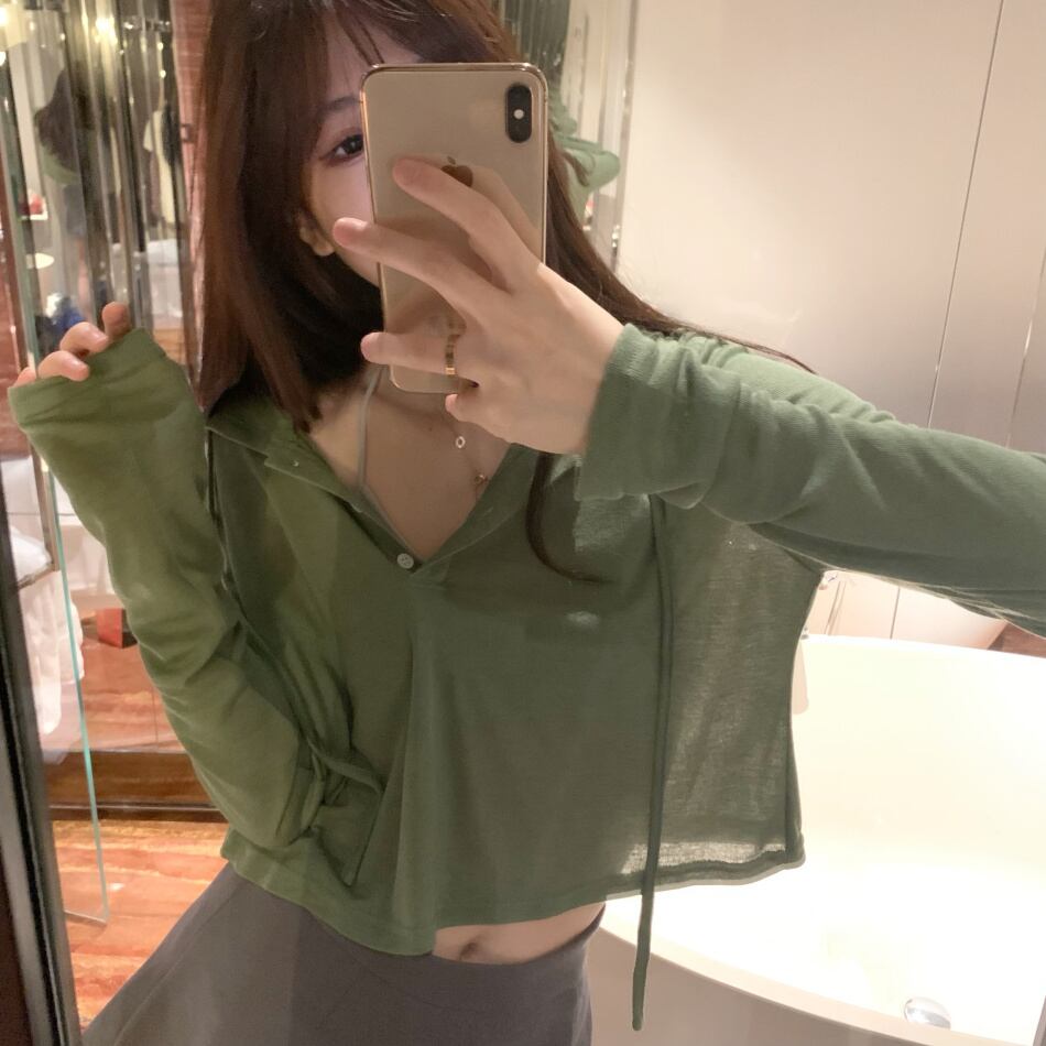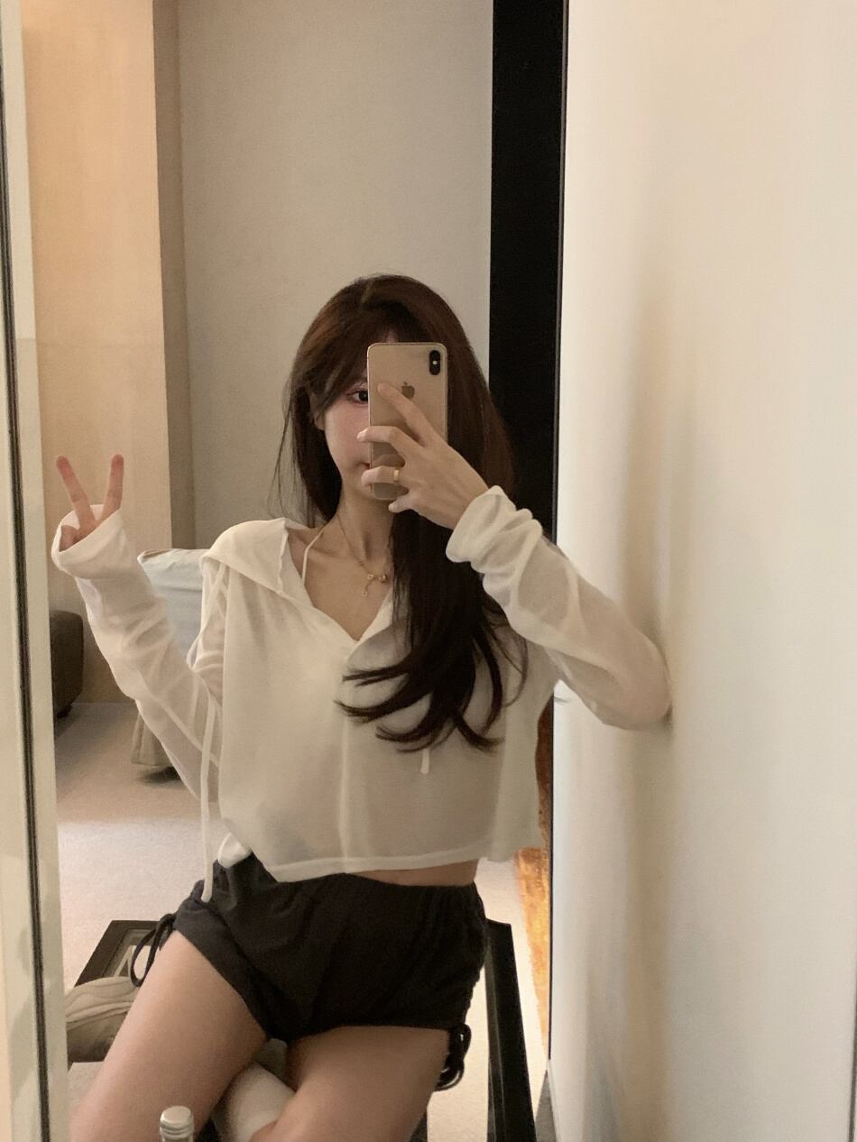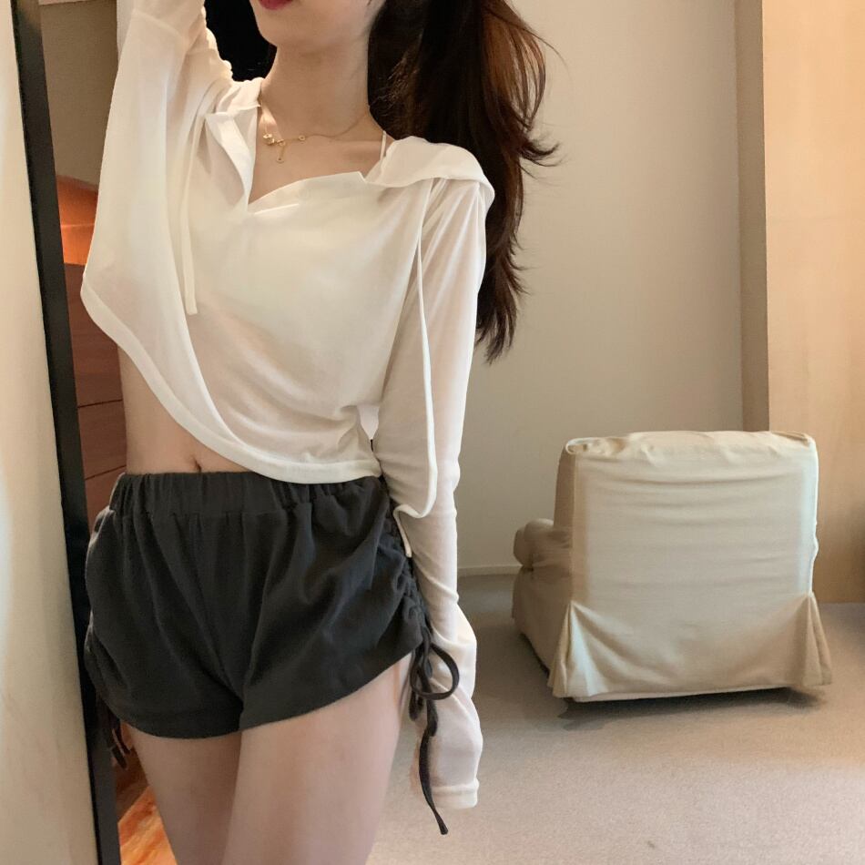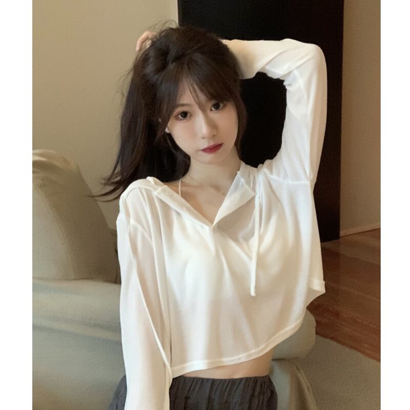 白の長袖日焼け止めTシャツ女性の夏のルーズな薄いアイスシルクニットブラウスフード付きショートハイウエストトップ ハイウェスト ロング ホワイト サマー 夏物 7460036317908494 | framboise21