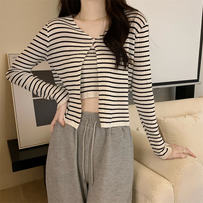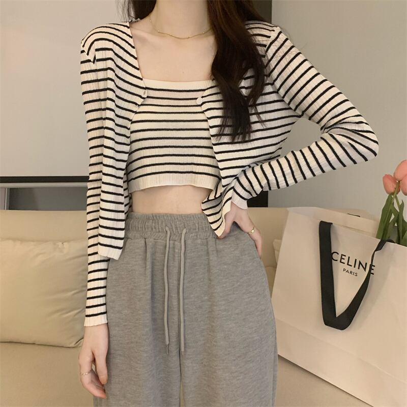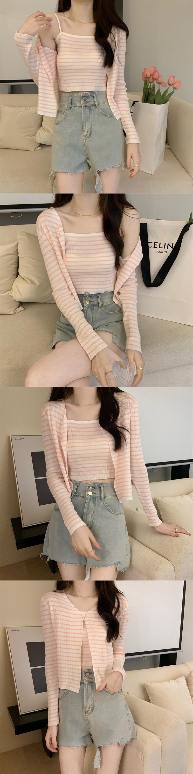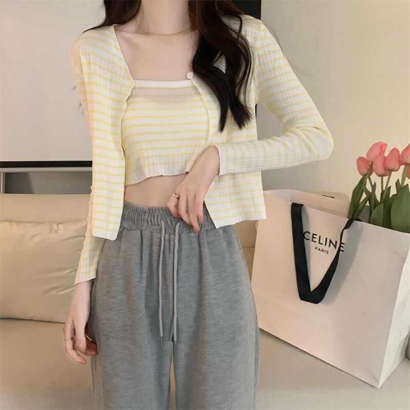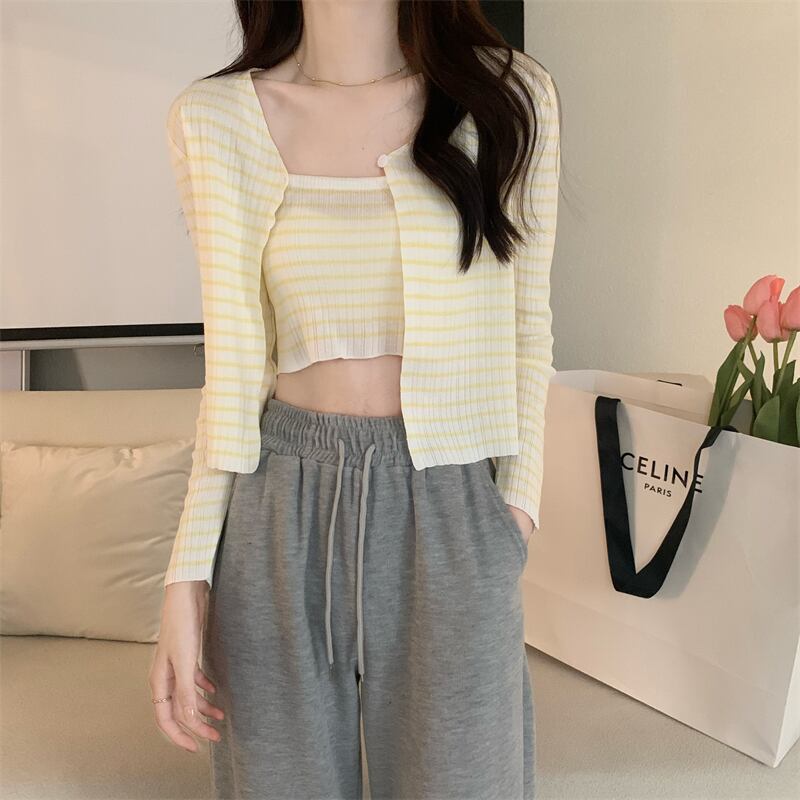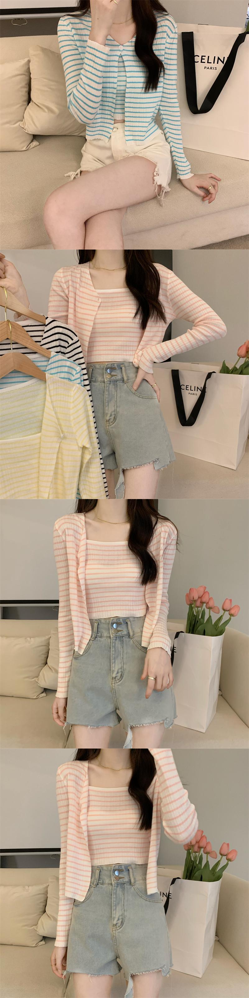 アイスシルクサンスクリーンカーディガンレディースサマー薄手ニットブラウススモールコート、ショートストライプサスペンダーツーピーススーツ 夏物 7460082650147879 | framboise21