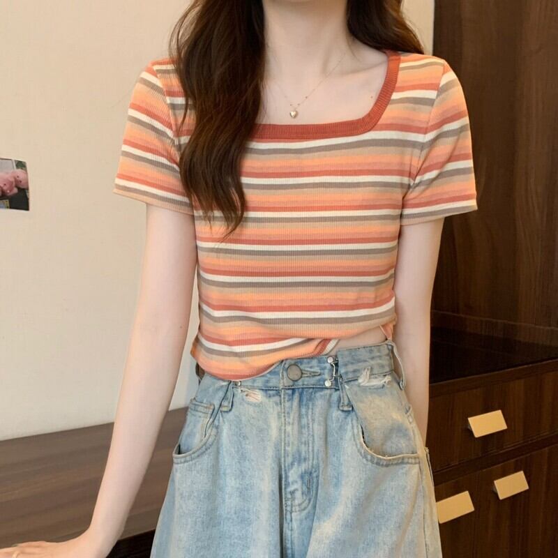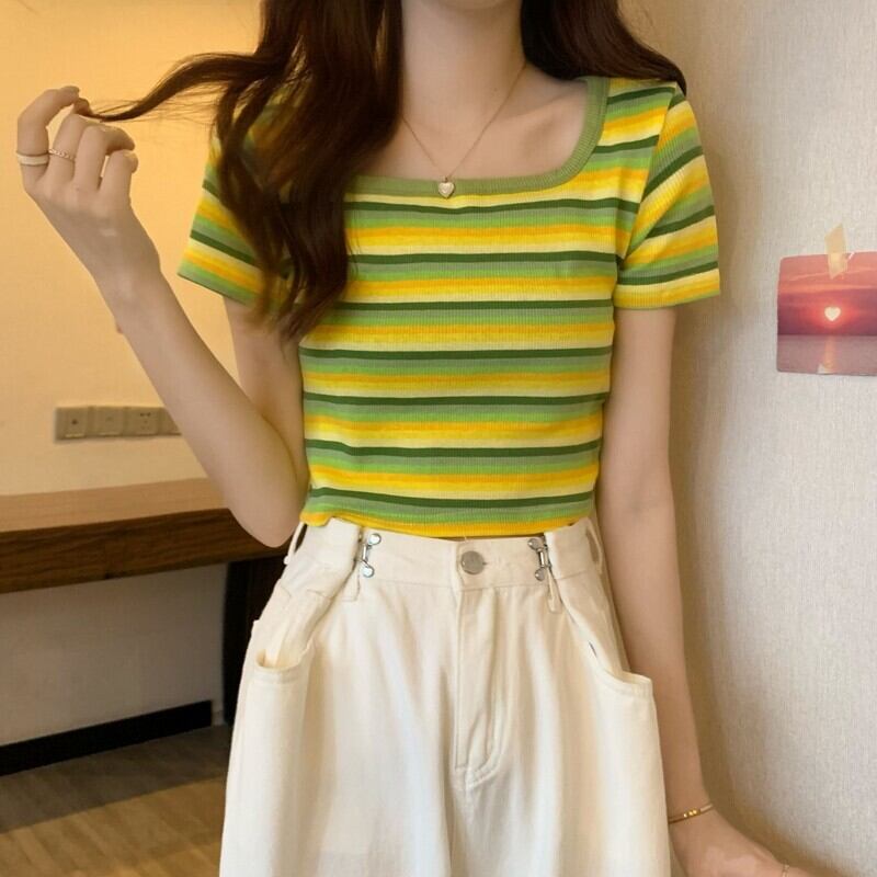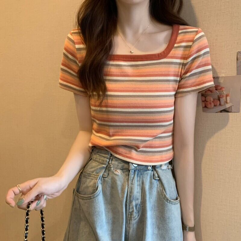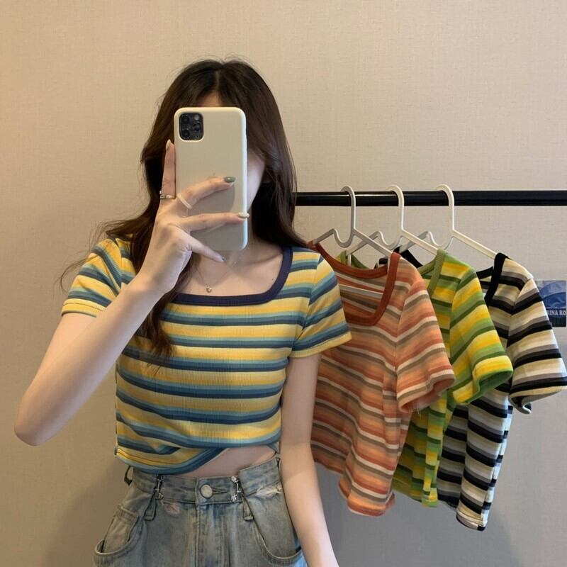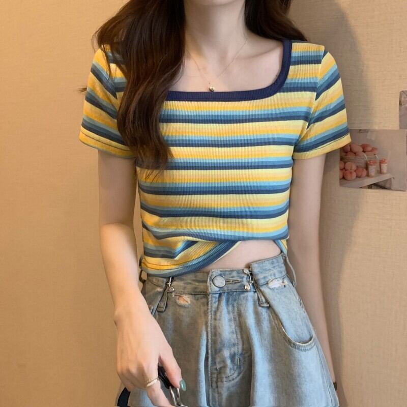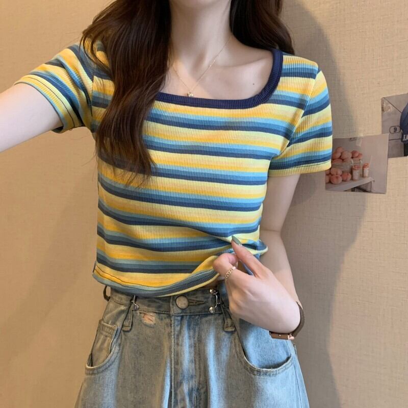 フロントショルダースクエアネック半袖ストライプTシャツレディースサマーデザインセンスニッチスモールボディスリム&シンショートシャツトップ 夏物 スクウェア 7460027428713036 | framboise21