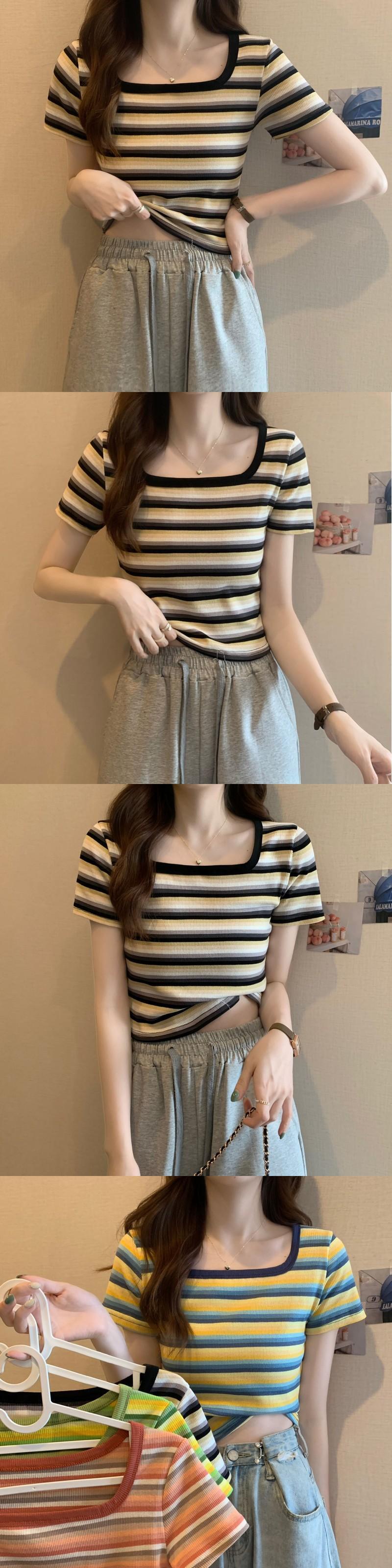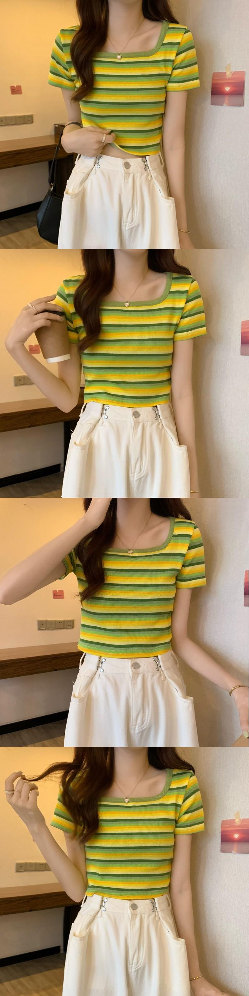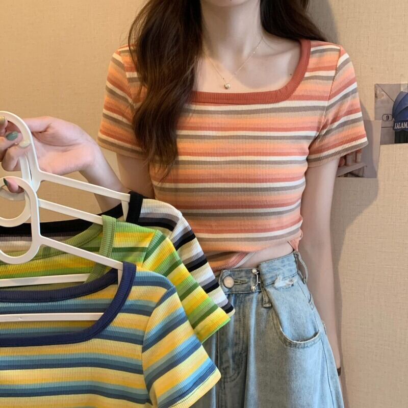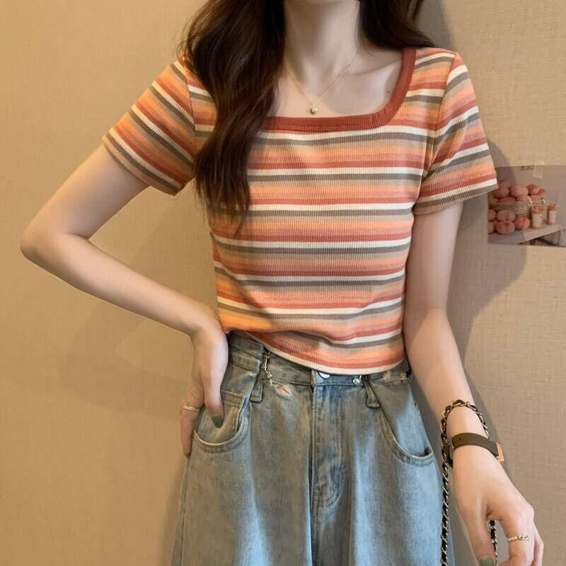 フロントショルダースクエアネック半袖ストライプTシャツレディースサマーデザインセンスニッチスモールボディスリム&シンショートシャツトップ 夏物 スクウェア 7460027428713036 | framboise21