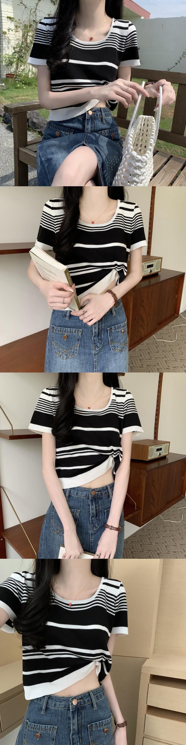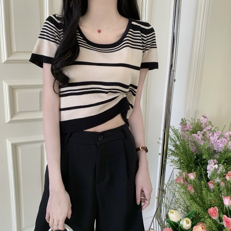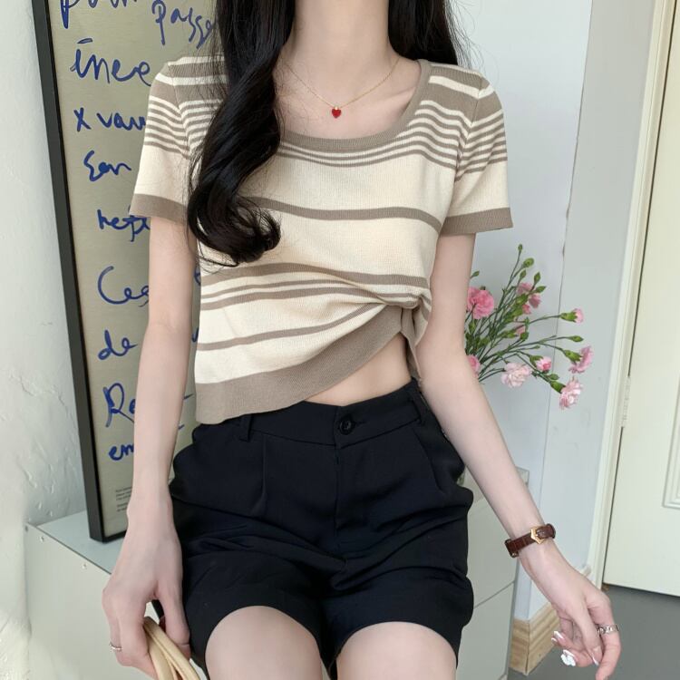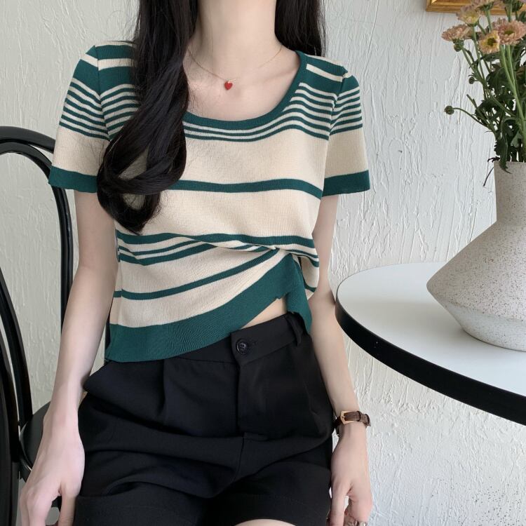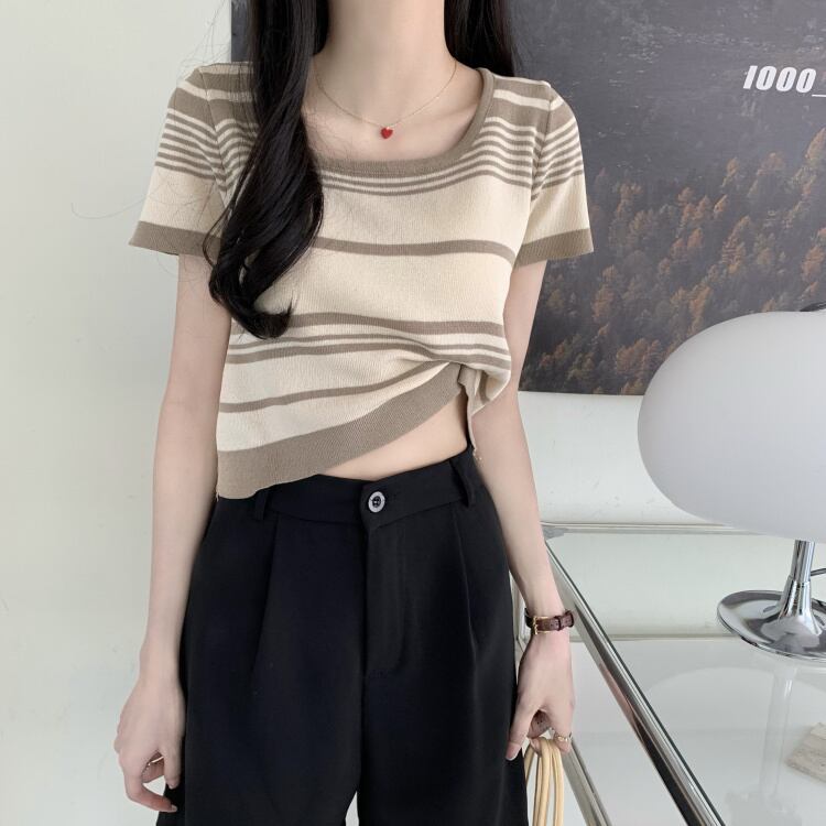 コントラストカラーのストライプスクエアカラーフロントショルダー半袖ニットTシャツレディース2022年夏新作デザインショートトップイン サマー 夏物 スクウェア 7460027437036808 | framboise21