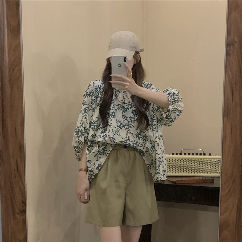 色:フラワーシャツ,カーキショートパンツ