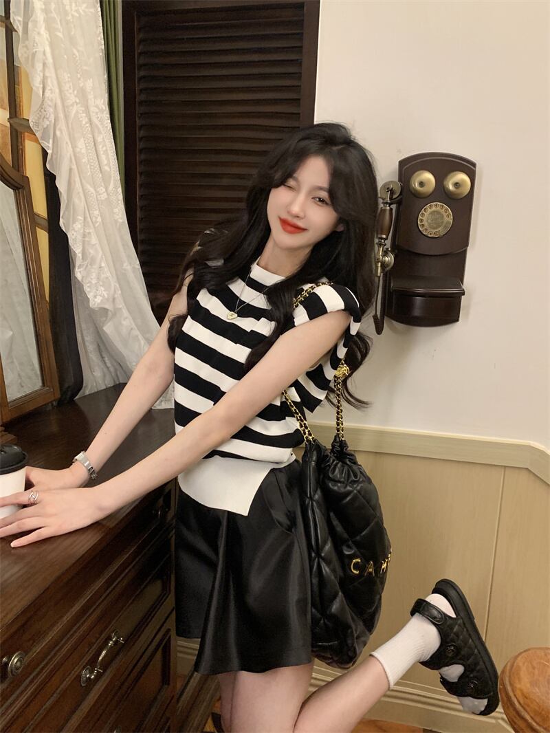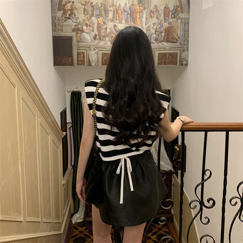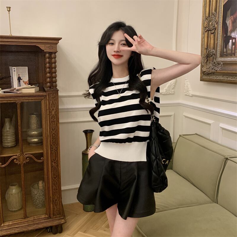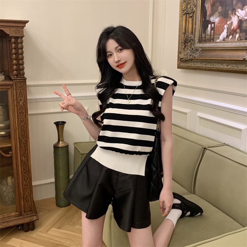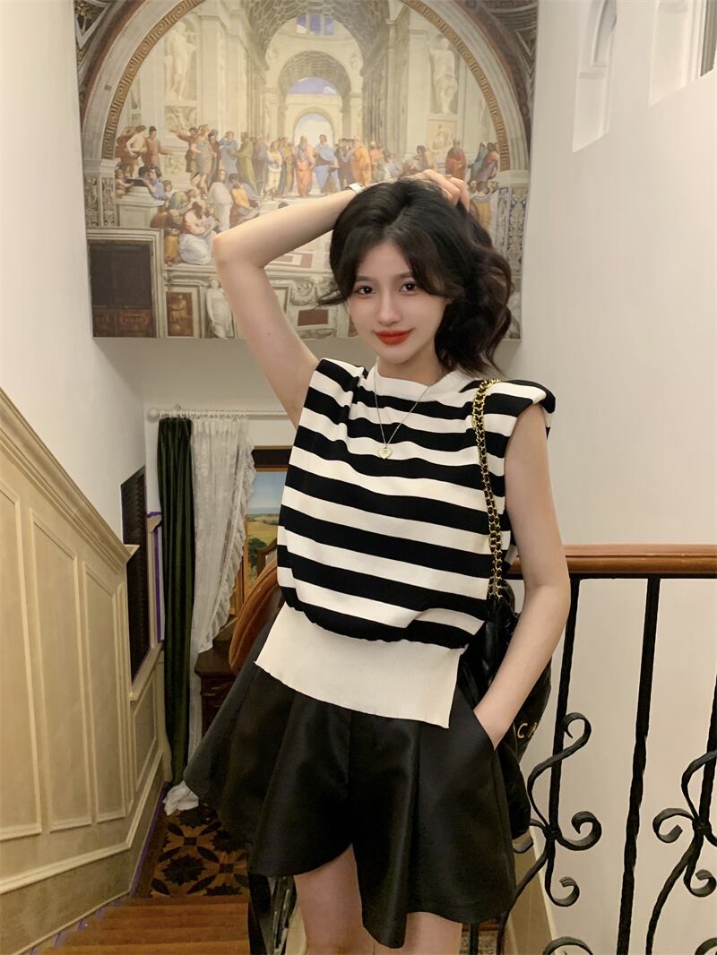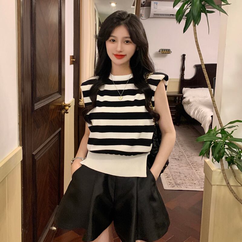 ノースリーブショルダーパッドTシャツレディースサマーライトアングルショルダーニットベストデザインセンスブラック&ホワイトストライプアイスシルクラウンドネックトップス 夏物 Oネック 7460089666354102 | framboise21