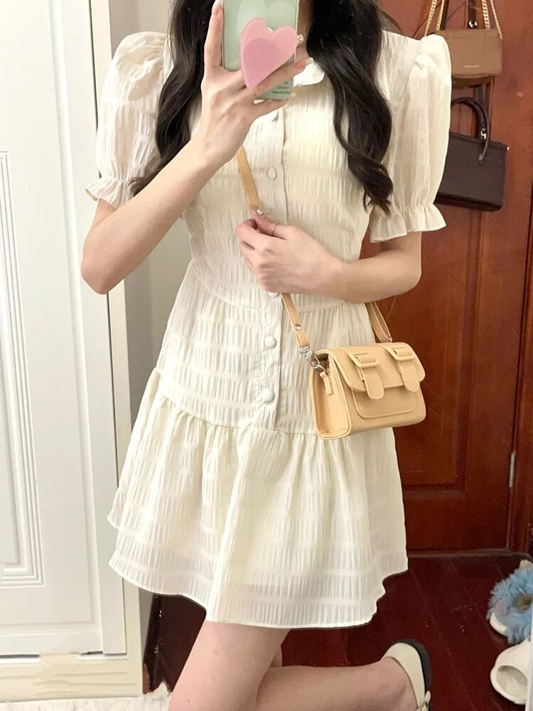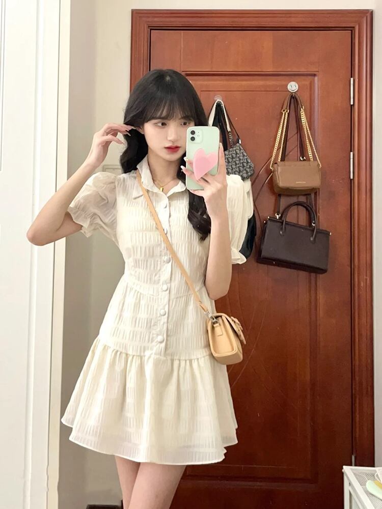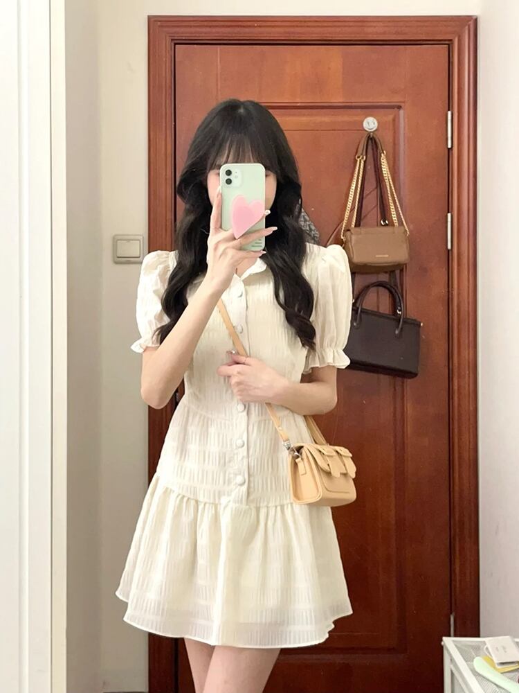 甘いポロカラードレス、パフスリーブ、シフォン、女性の夏のデザイン、スモールウエスト、ハイウエスト、気質、ショートスカート ハイウェスト 大人ガーリー スウィート キュート カジュアル サマー 夏物 7460056080319773 | framboise21