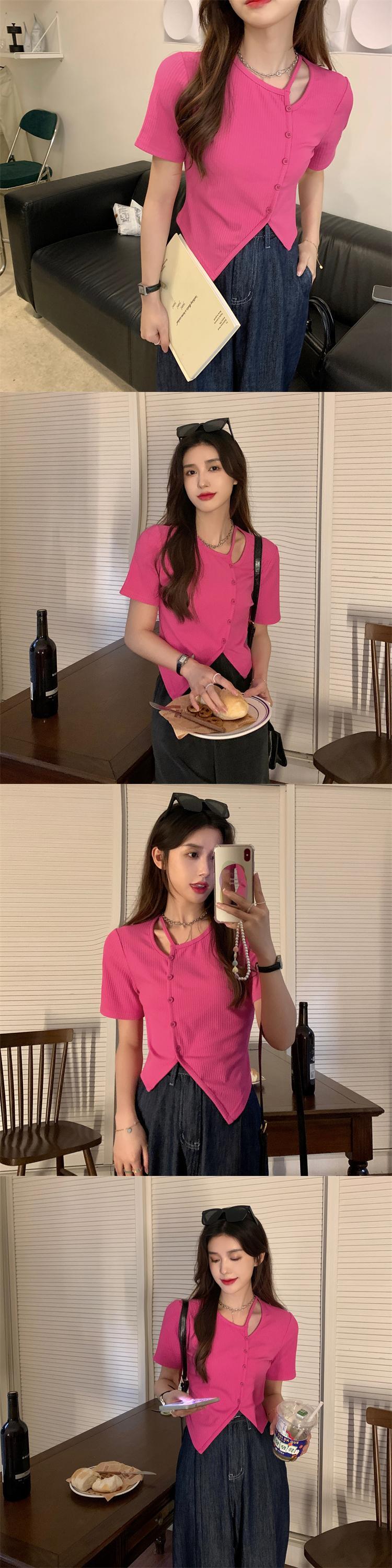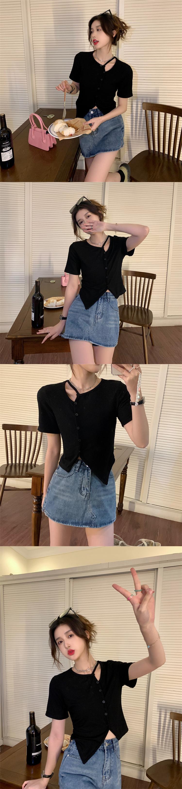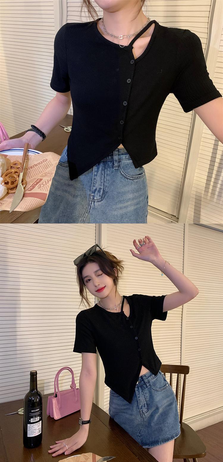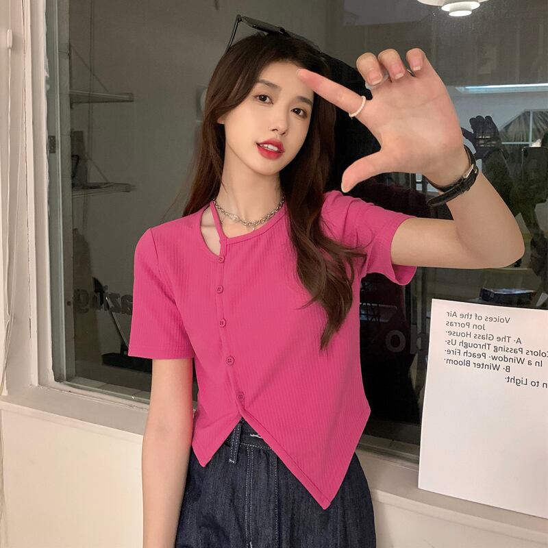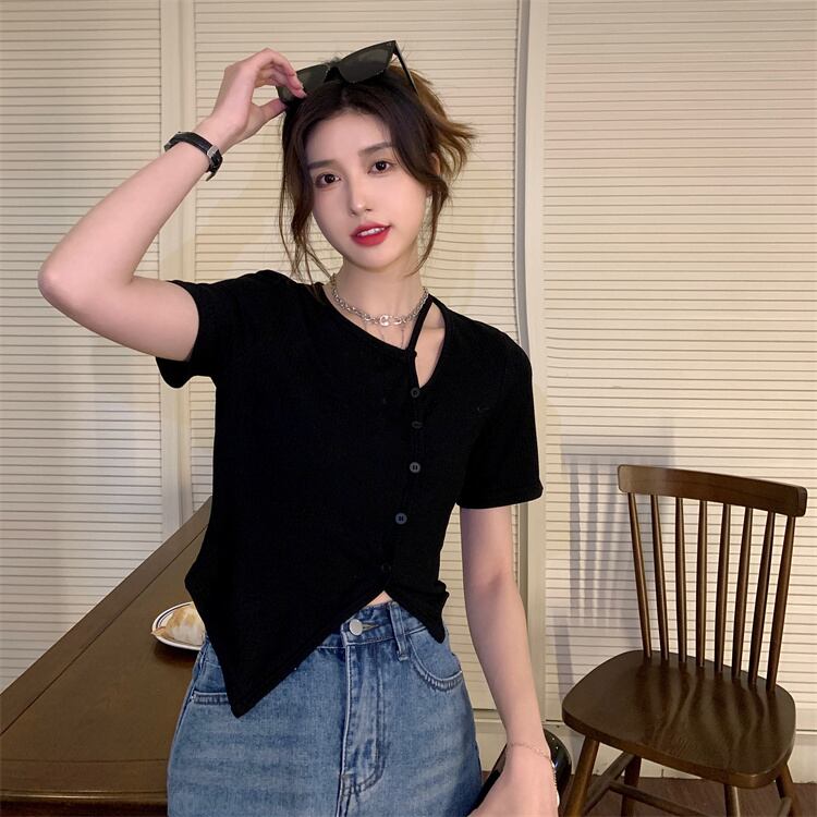 フロントショルダー半袖Tシャツレディースサマーデザインセンスニッチスウィートでスパイシーなショートイレギュラーユニークフレンチシックトップイン 大人ガーリー キュート カジュアル 夏物 7460015283669861 | framboise21