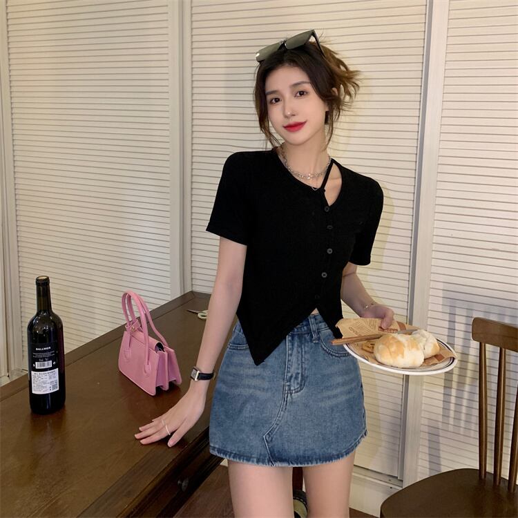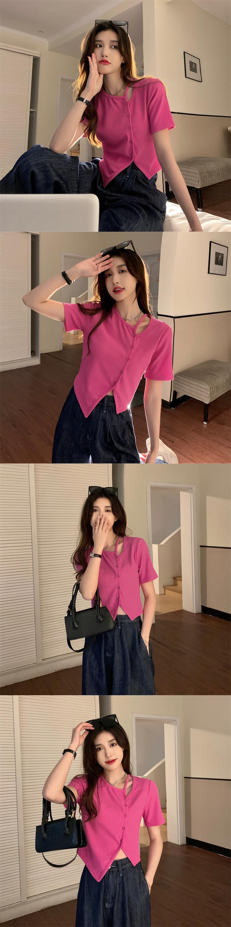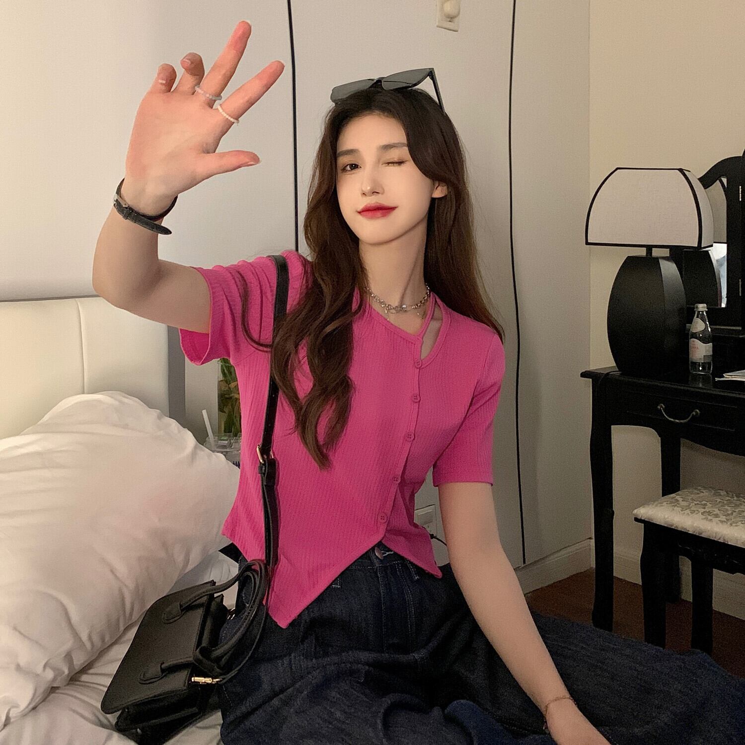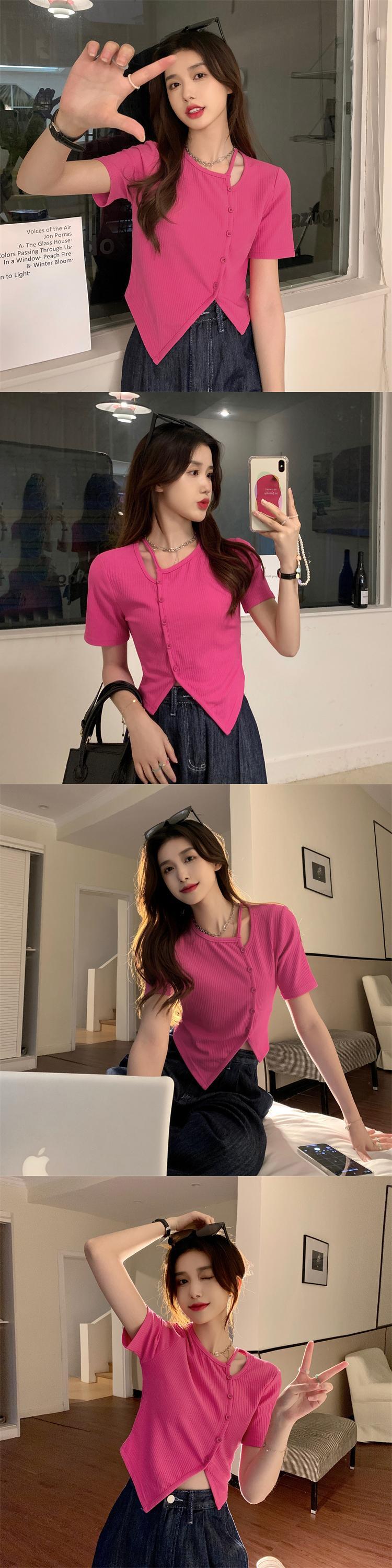 フロントショルダー半袖Tシャツレディースサマーデザインセンスニッチスウィートでスパイシーなショートイレギュラーユニークフレンチシックトップイン 大人ガーリー キュート カジュアル 夏物 7460015283669861 | framboise21