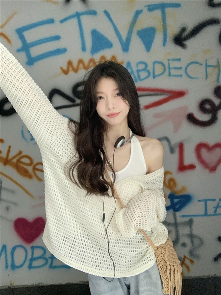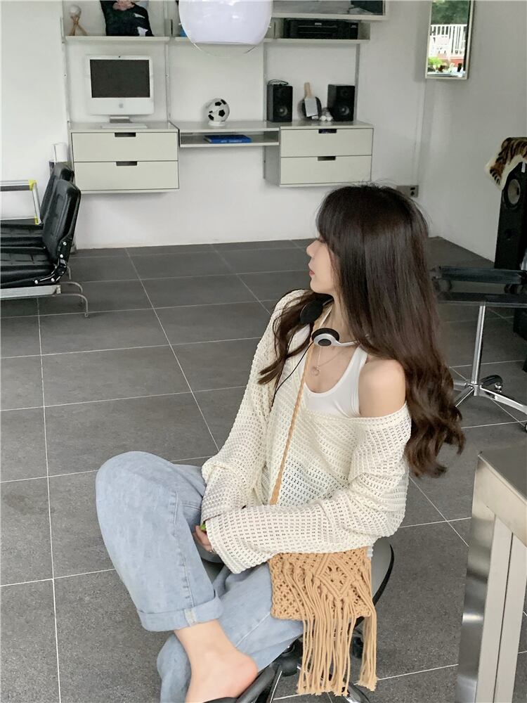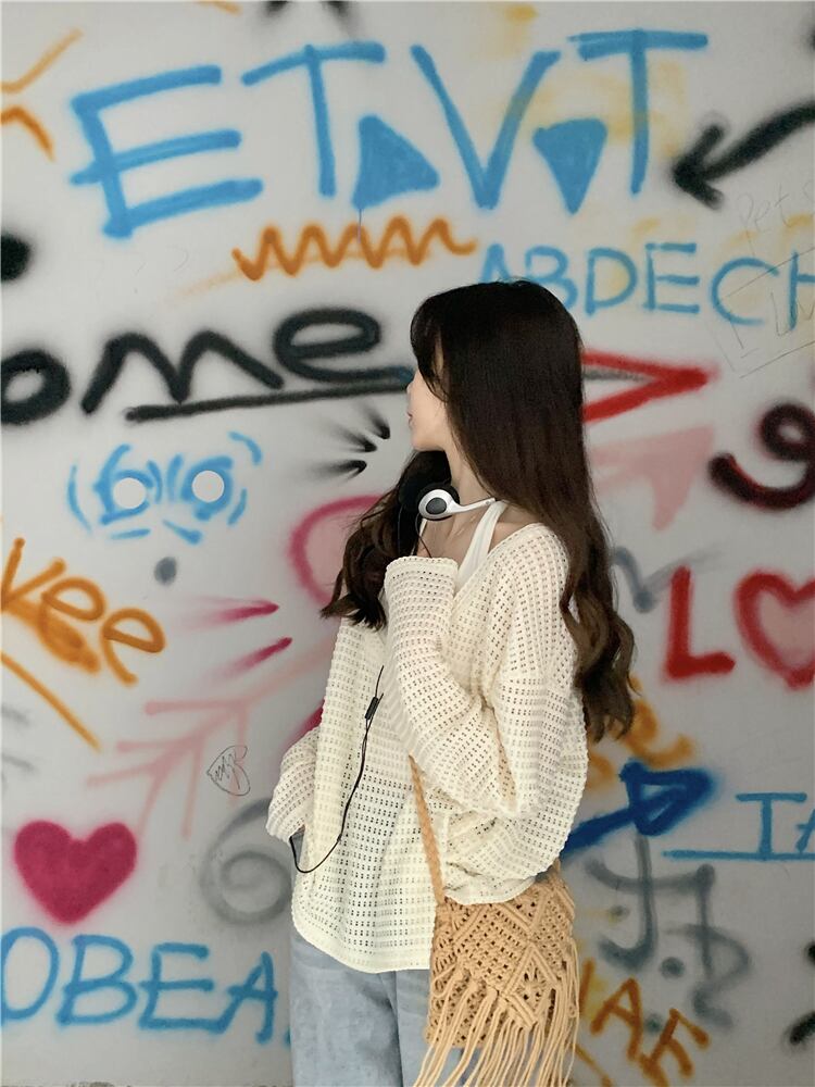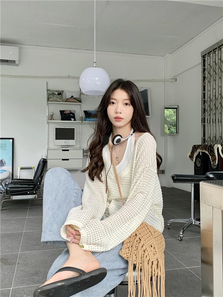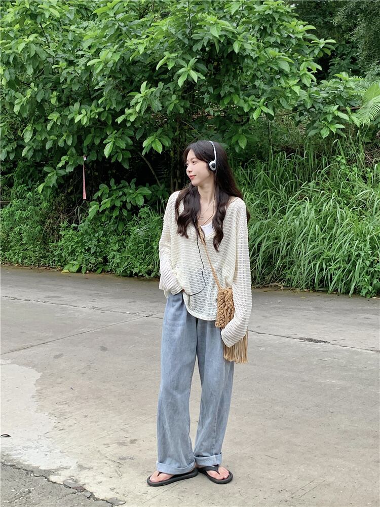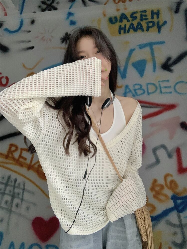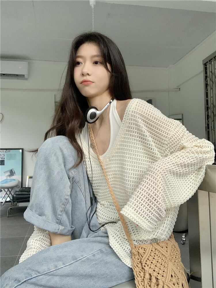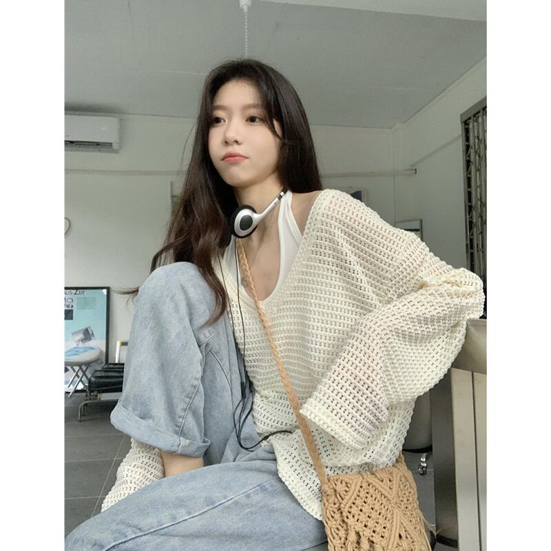 中空日焼け止めブラウス女性の夏の薄いニットトップルーズアウターフォールドシースルーファッション長袖シャツアプリコット ロング サマー 夏物 7460050840744682 | framboise21