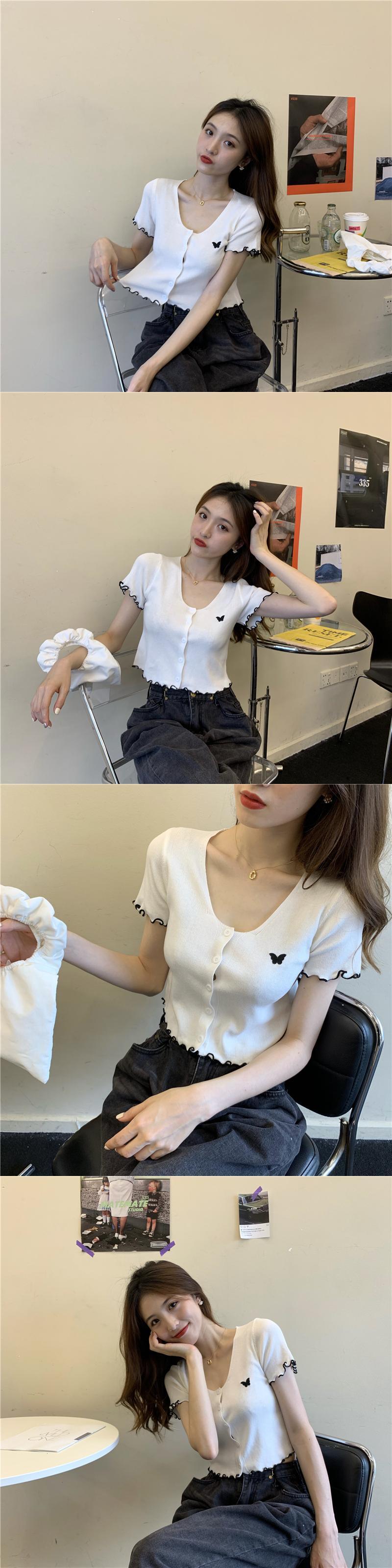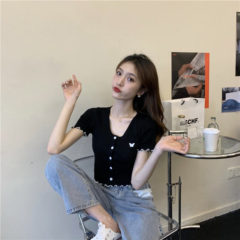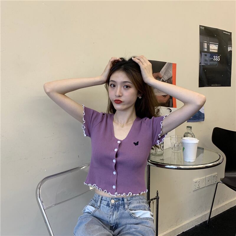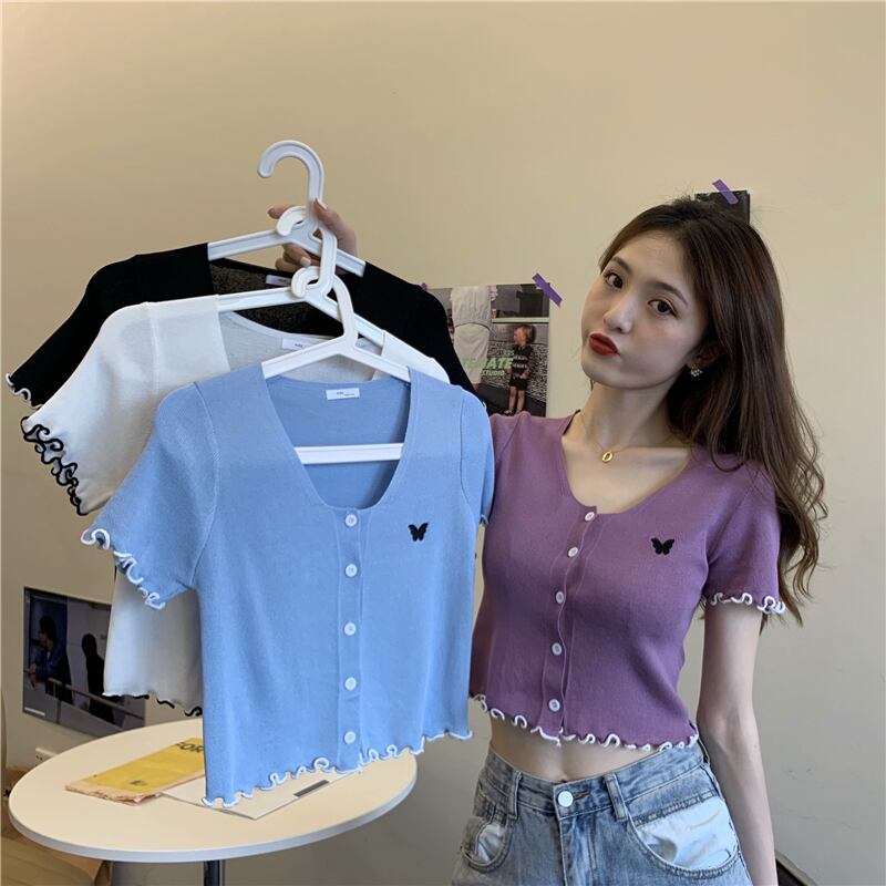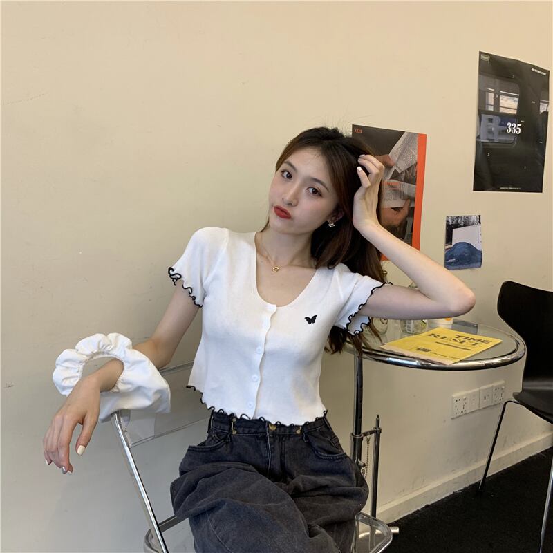 2022年夏のドレス穏やかな風の甘い蝶の刺繍ニットカーディガン半袖Tシャツ女性シックなハイウエストショートトップ ハイウェスト 大人ガーリー スウィート キュート カジュアル サマー 夏物 7460067705666857 | framboise21