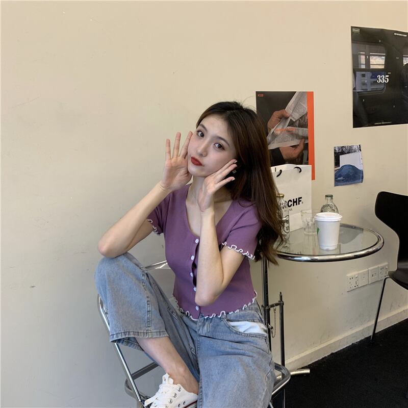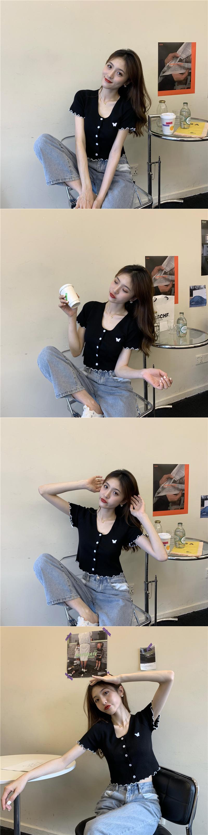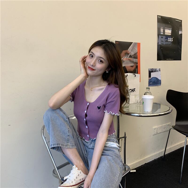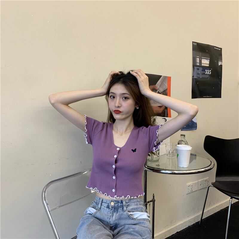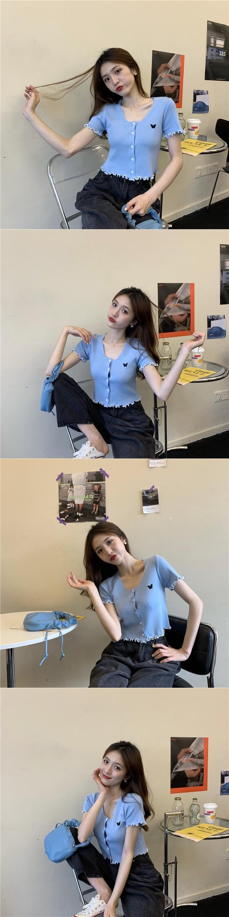 2022年夏のドレス穏やかな風の甘い蝶の刺繍ニットカーディガン半袖Tシャツ女性シックなハイウエストショートトップ ハイウェスト 大人ガーリー スウィート キュート カジュアル サマー 夏物 7460067705666857 | framboise21