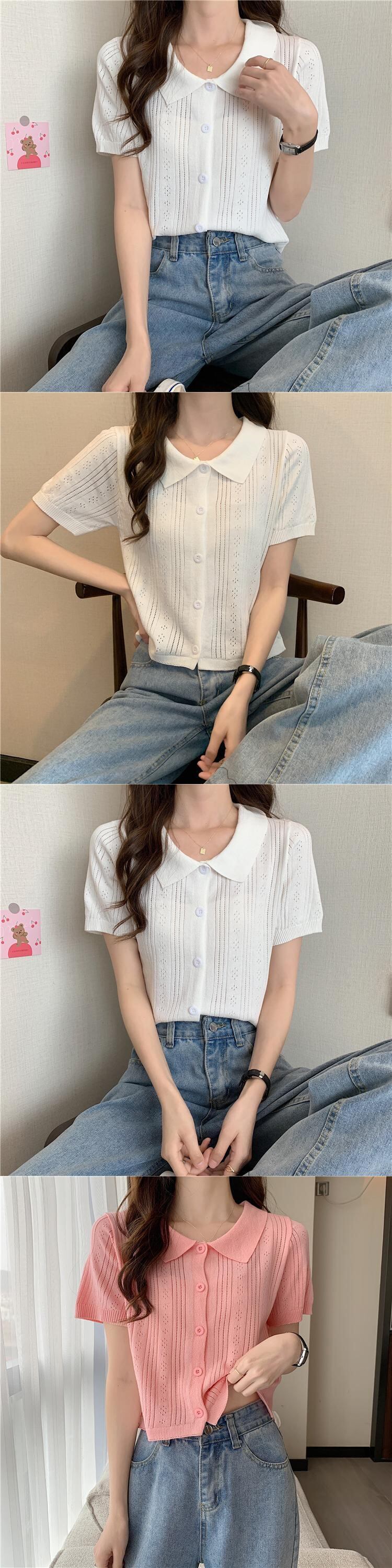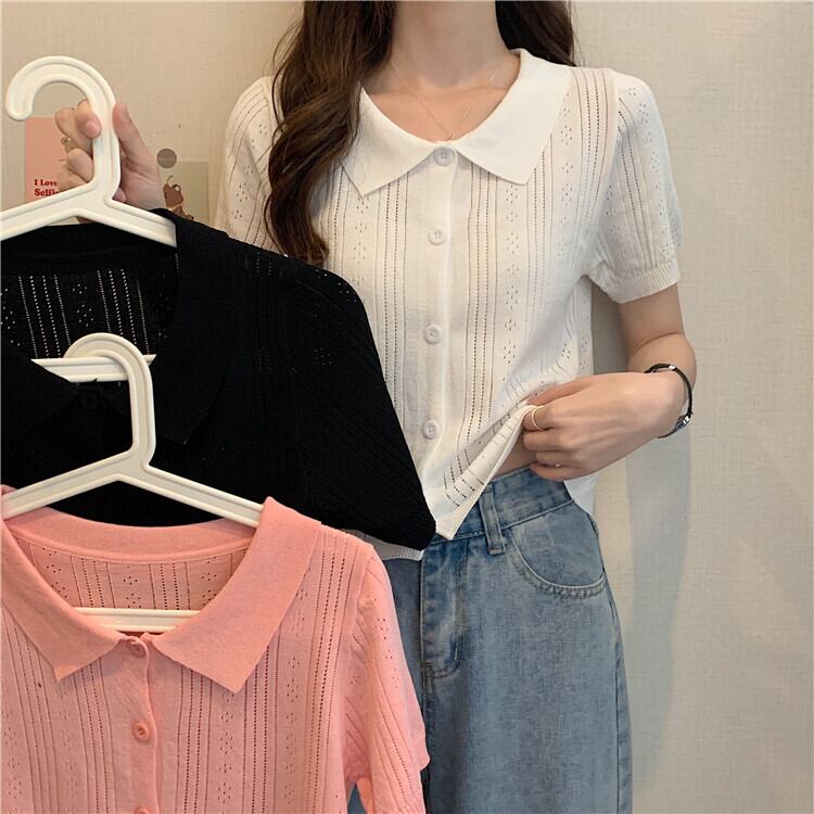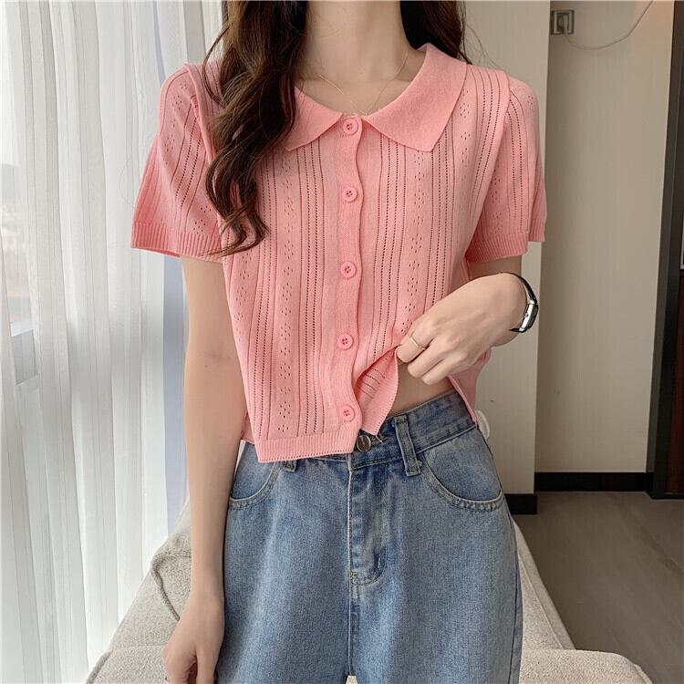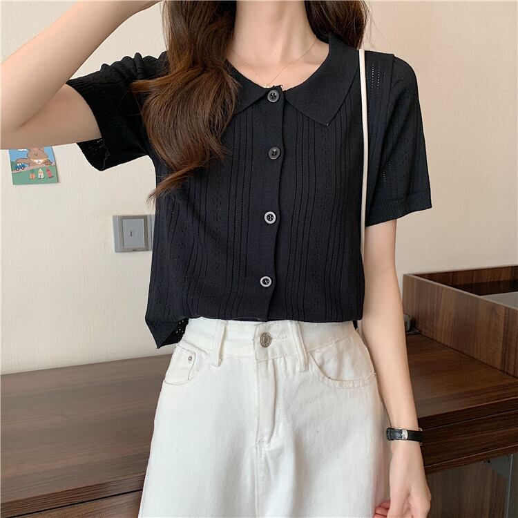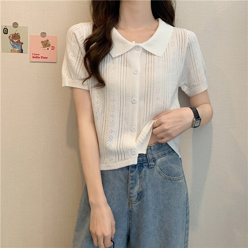 ホワイトショートトップレディース初春夏デザイン中空ポロカラー半袖アイスシルクニットカーディガンハイウエストTシャツ ハイウェスト スプリング 春物 サマー 夏物 7460040078658080 | framboise21