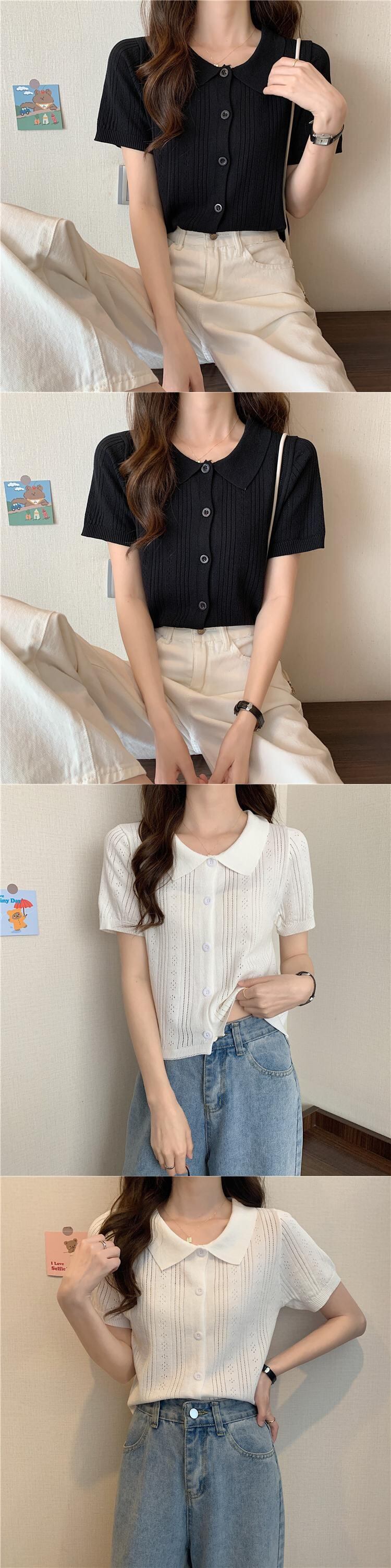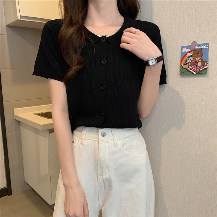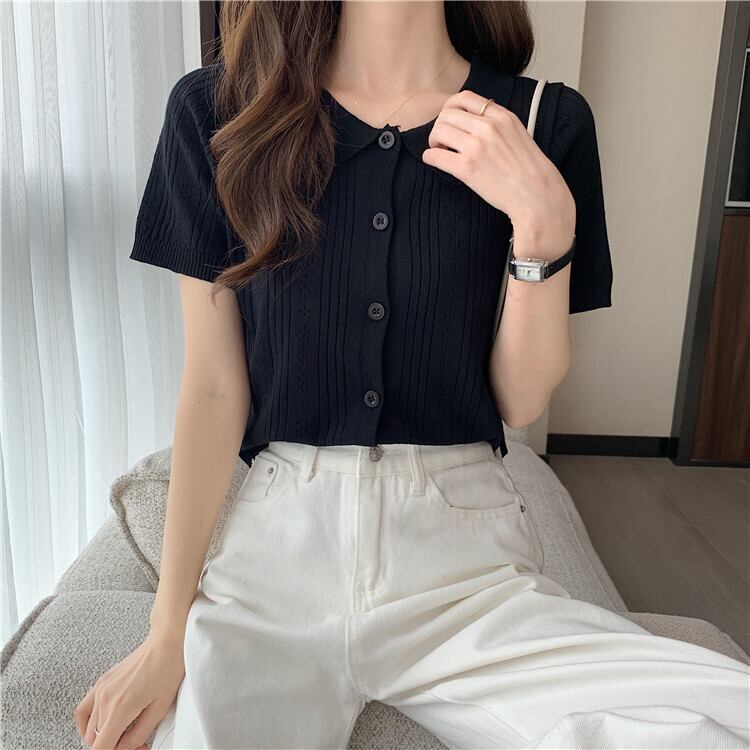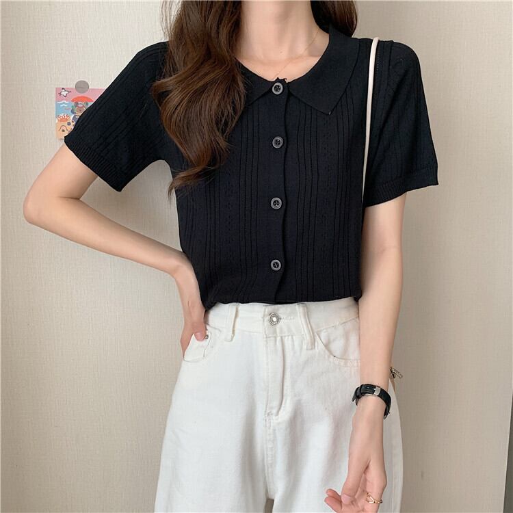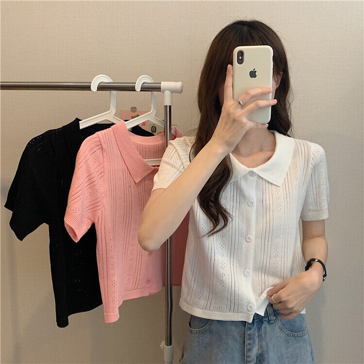 ホワイトショートトップレディース初春夏デザイン中空ポロカラー半袖アイスシルクニットカーディガンハイウエストTシャツ ハイウェスト スプリング 春物 サマー 夏物 7460040078658080 | framboise21
