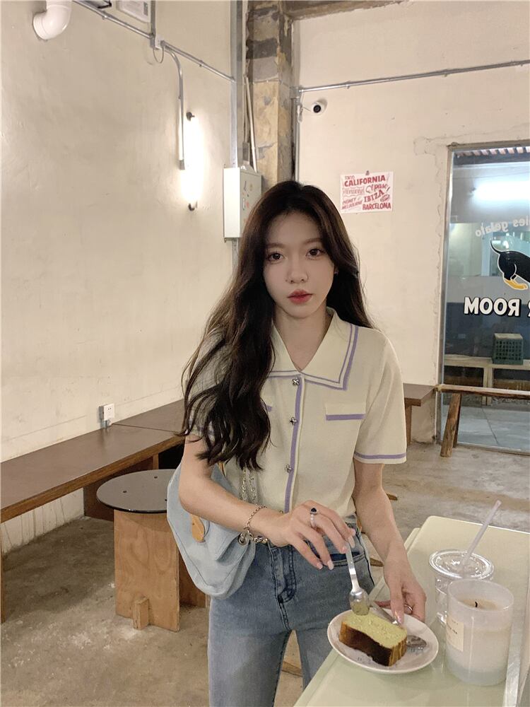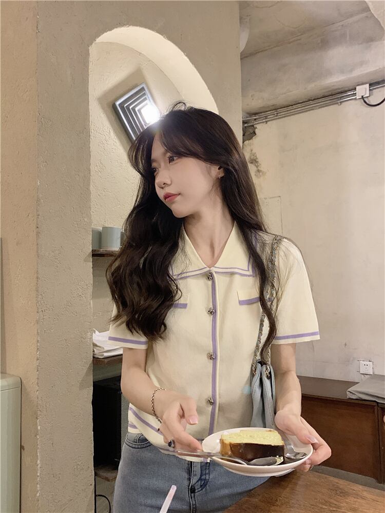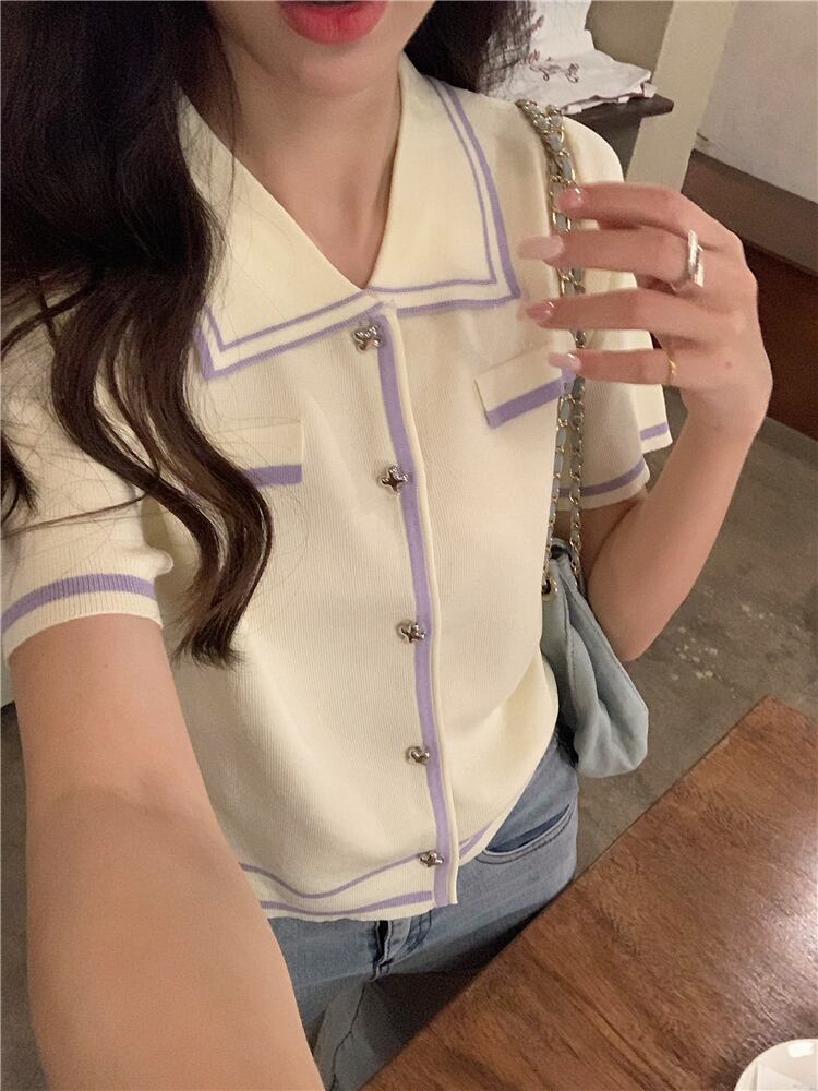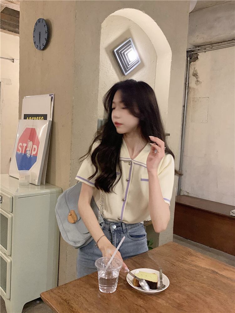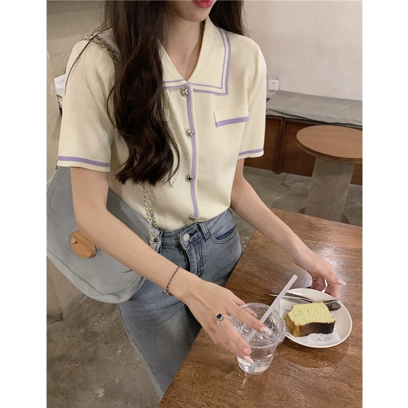 コントラストカラーの薄手のアイスシルクポロカラー半袖ニットカーディガンTシャツ気質優しいスモールフレグランスウィンドトップコート女性夏 サマー 夏物 7460024656255989 | framboise21