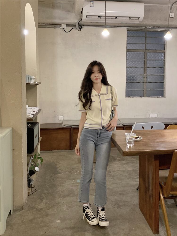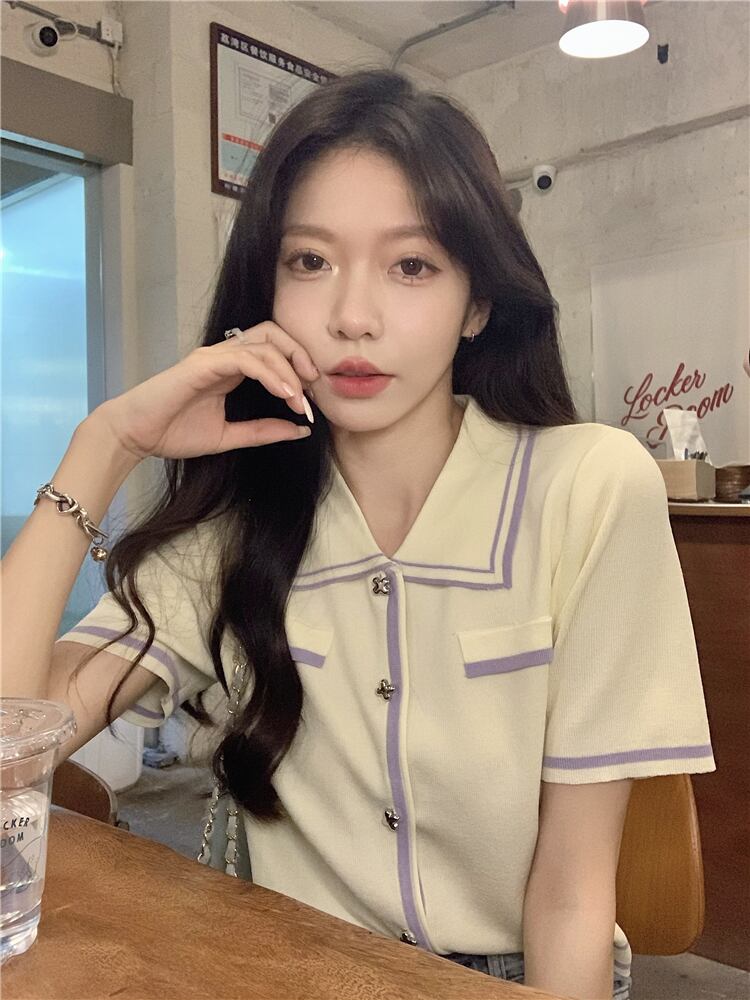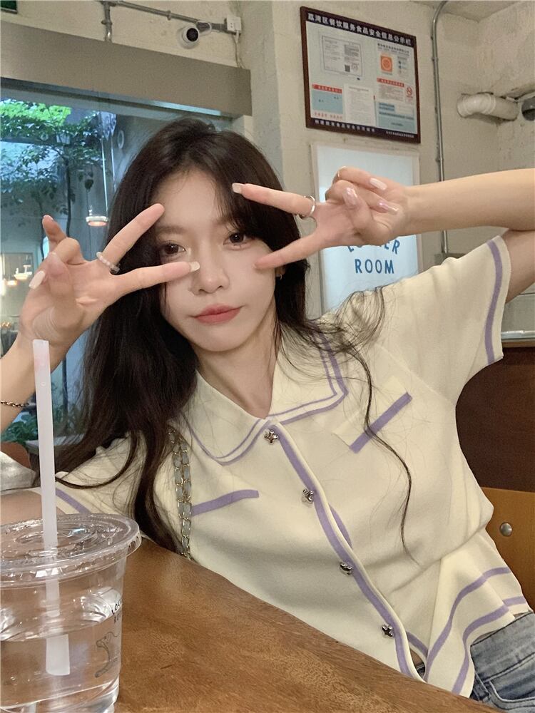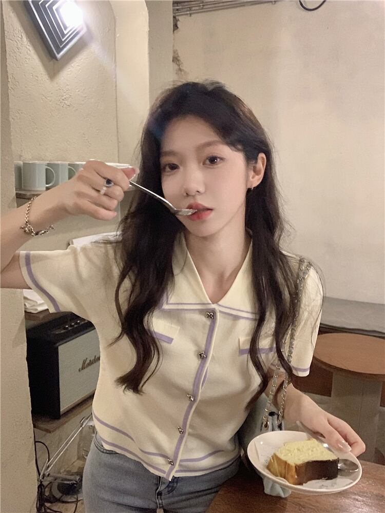 コントラストカラーの薄手のアイスシルクポロカラー半袖ニットカーディガンTシャツ気質優しいスモールフレグランスウィンドトップコート女性夏 サマー 夏物 7460024656255989 | framboise21