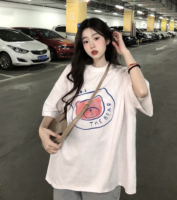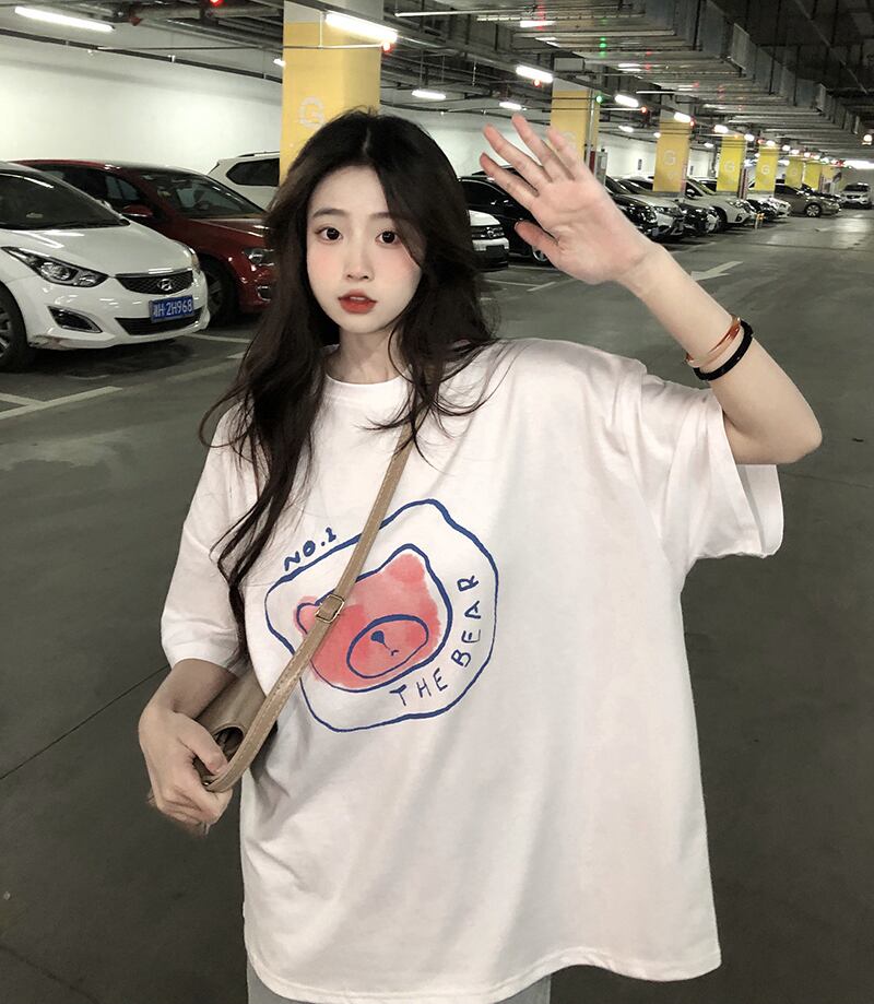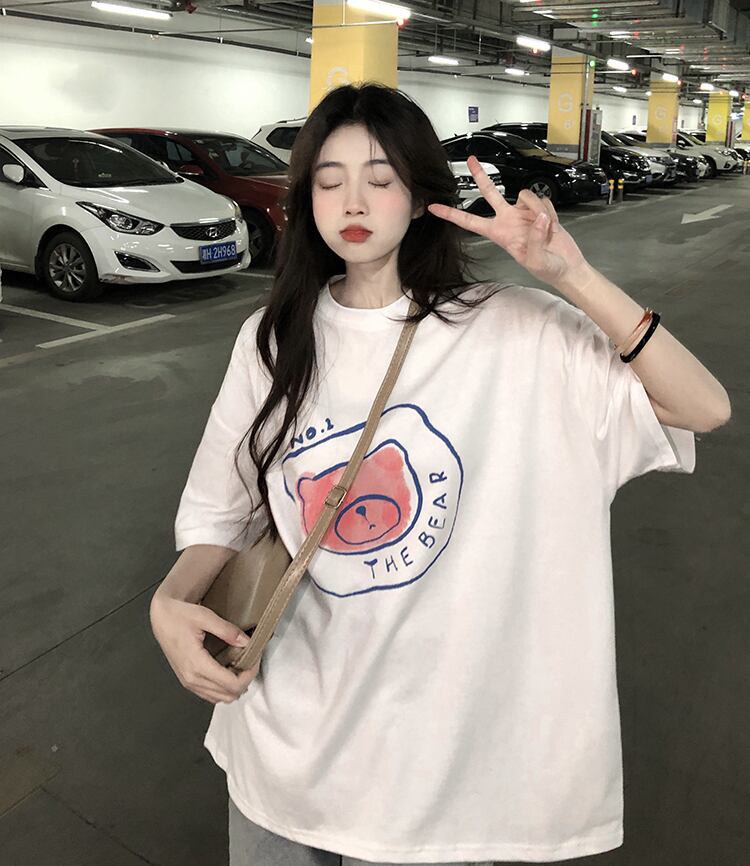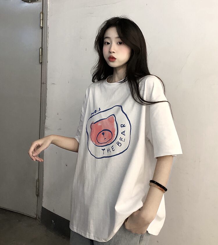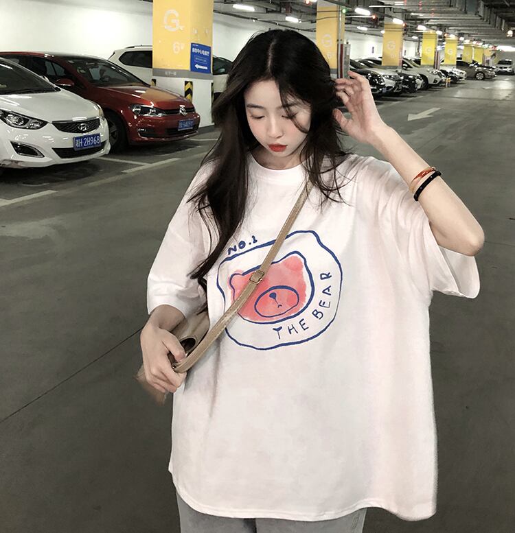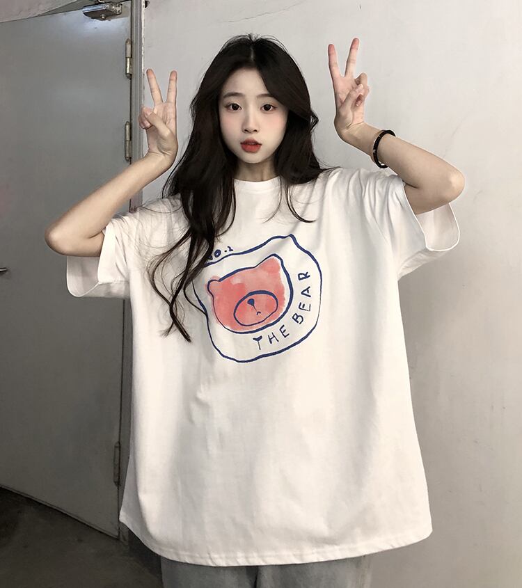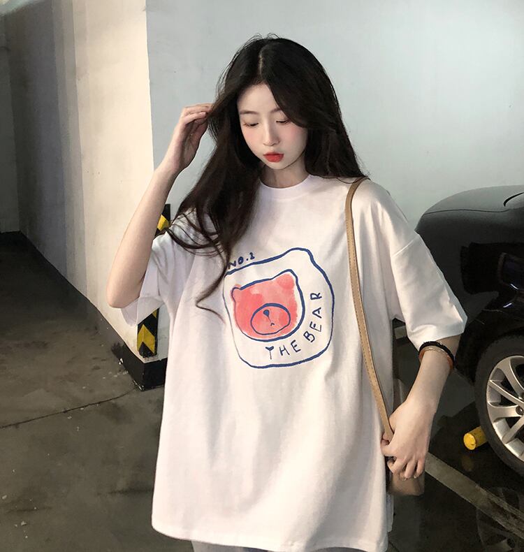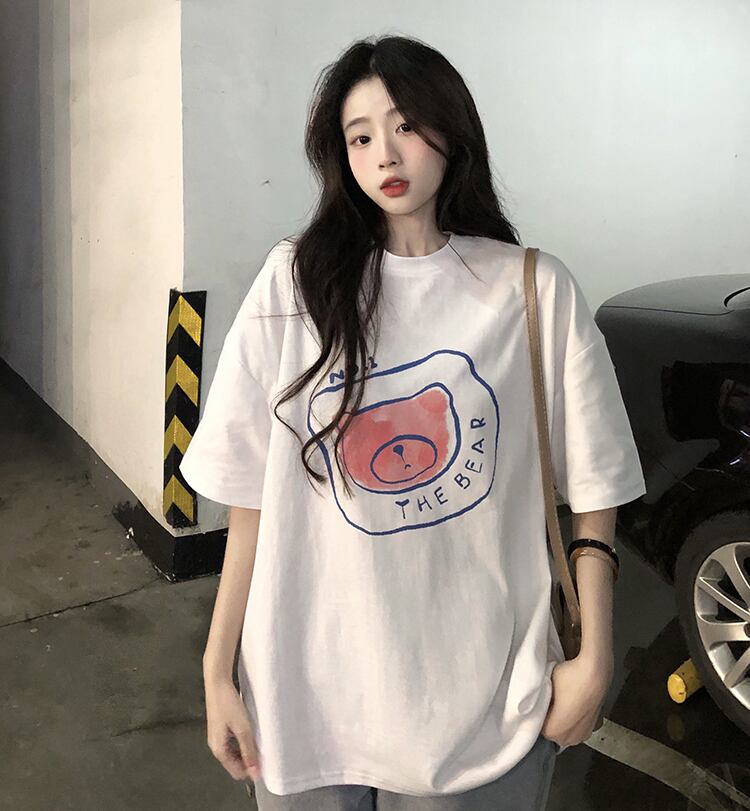 ベアプリントホワイトTシャツレディースサマーキュートウエスタンスタイルルーズミドル丈ボトムスミッシングスーパートップインタイド 大人ガーリー スウィート カジュアル 夏物 7460044416470988 | framboise21