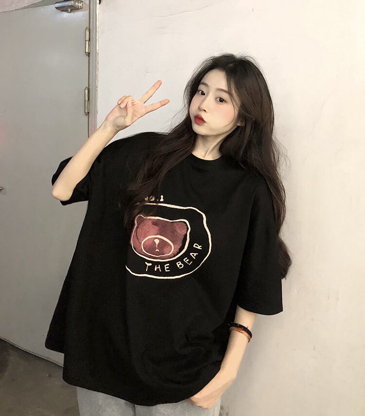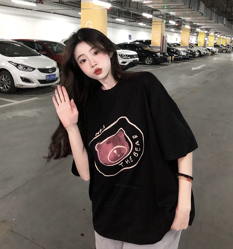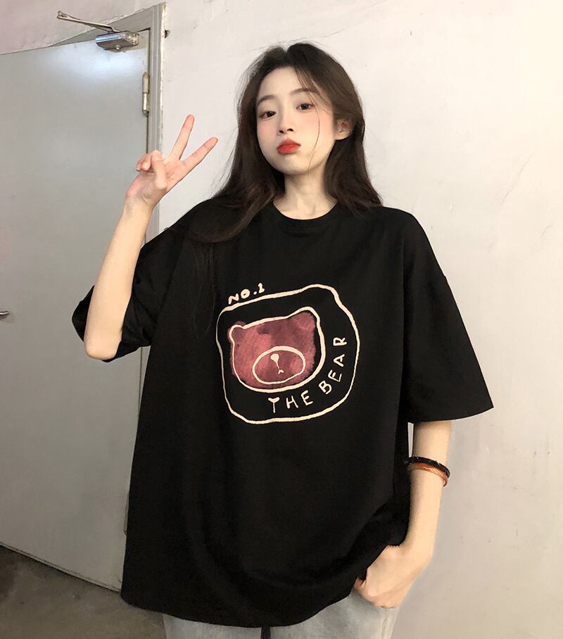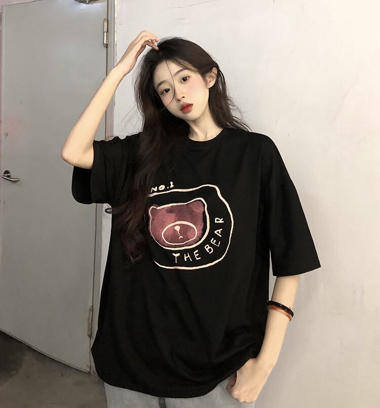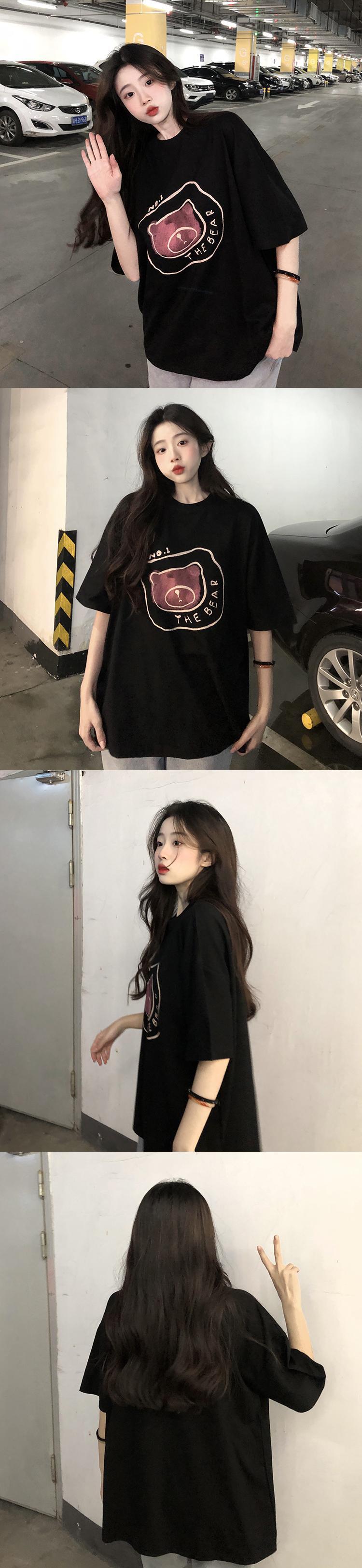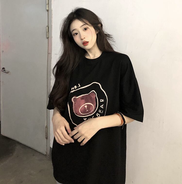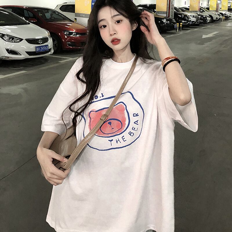ベアプリントホワイトTシャツレディースサマーキュートウエスタンスタイルルーズミドル丈ボトムスミッシングスーパートップインタイド 大人ガーリー スウィート カジュアル 夏物 7460044416470988 | framboise21