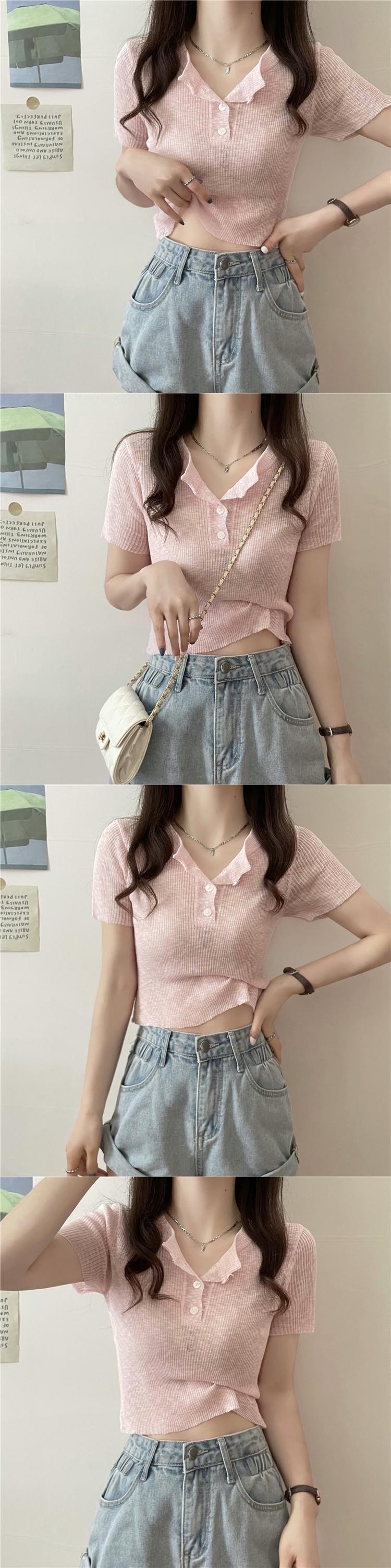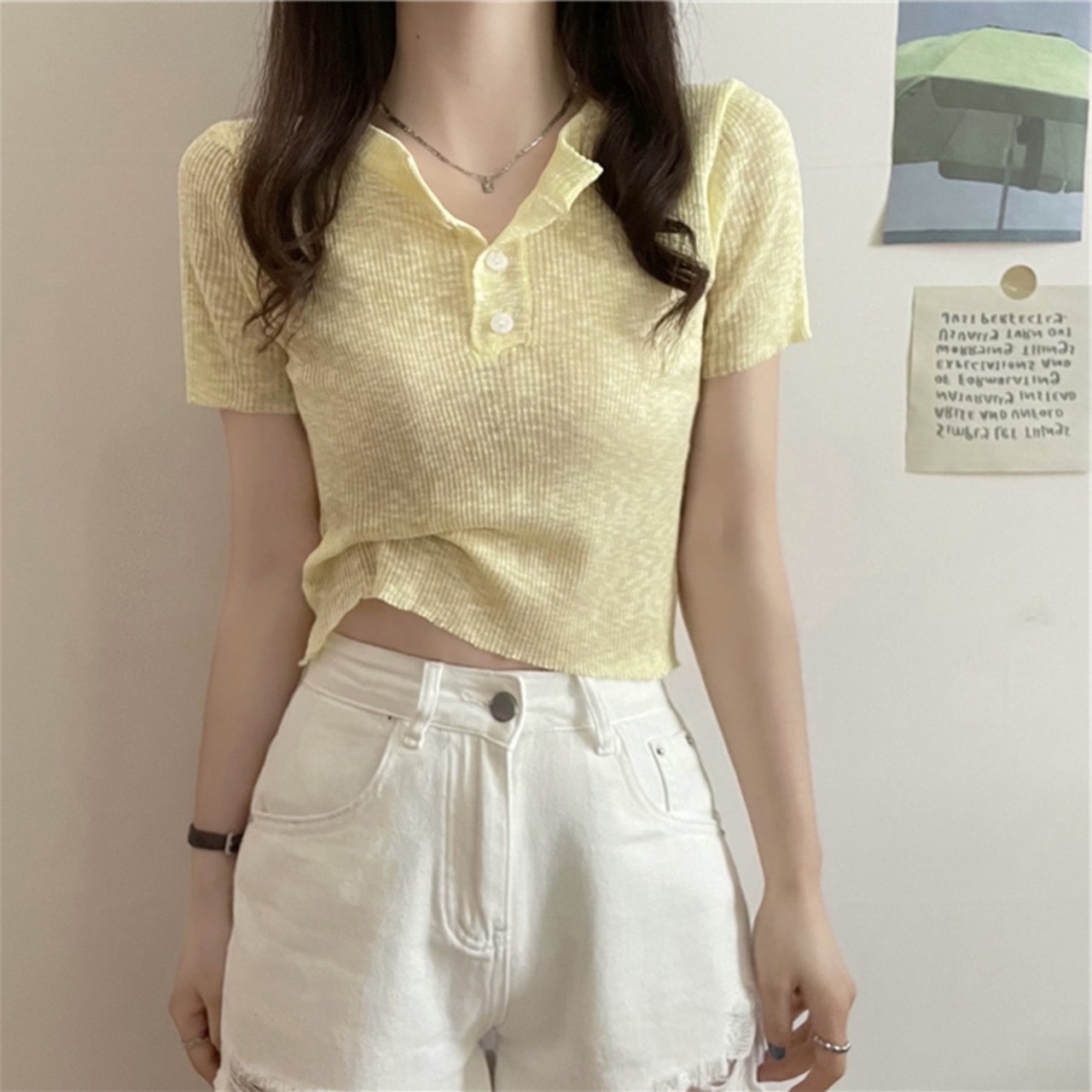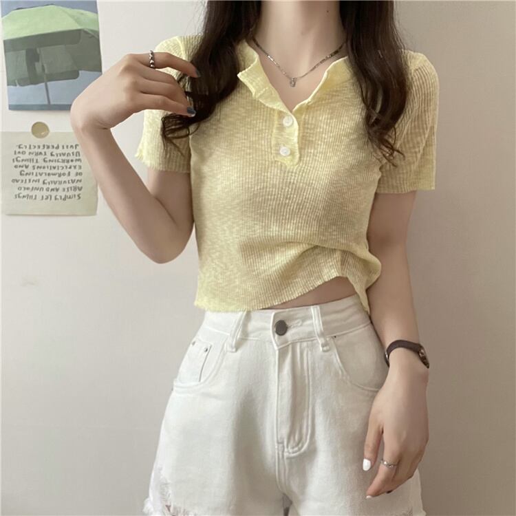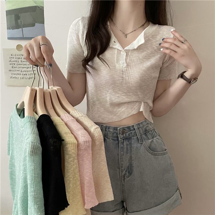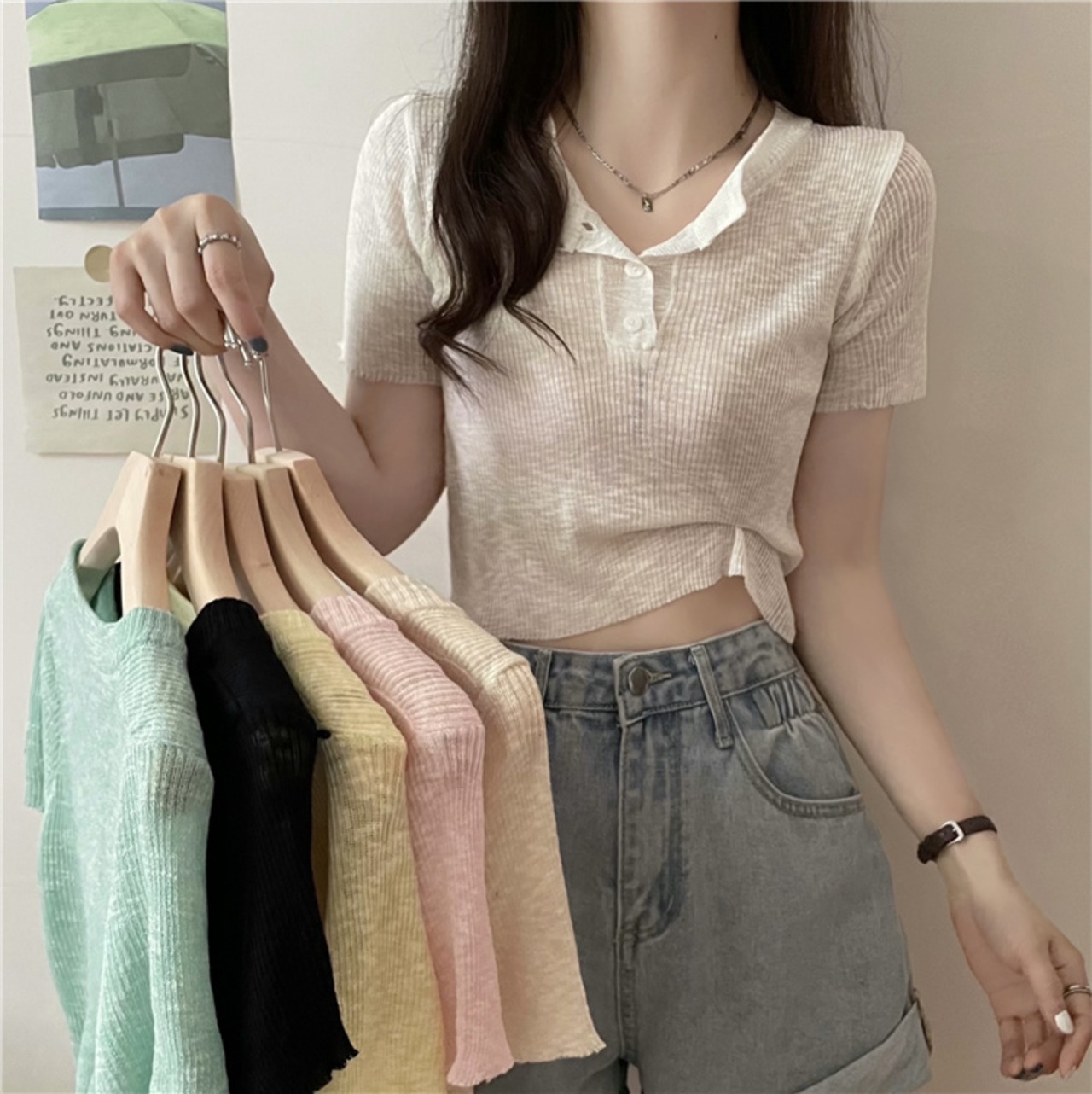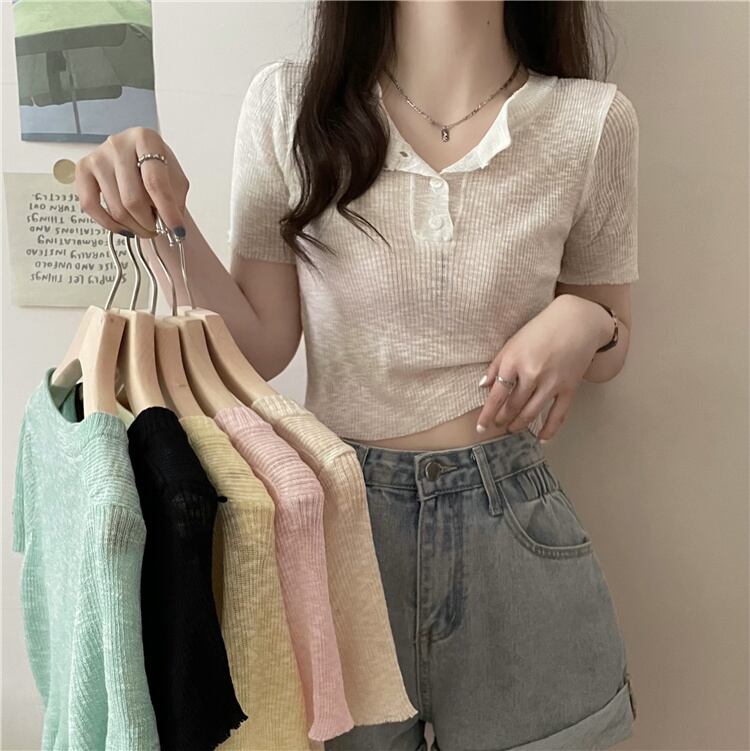 夏のユニークで特別なVネック半袖フロントショルダーTシャツ薄手のニットショートセクションウエスタンスタイルのカードウエストスモールシャツクロップドトップレディース サマー 夏物 7460059843977472 | framboise21