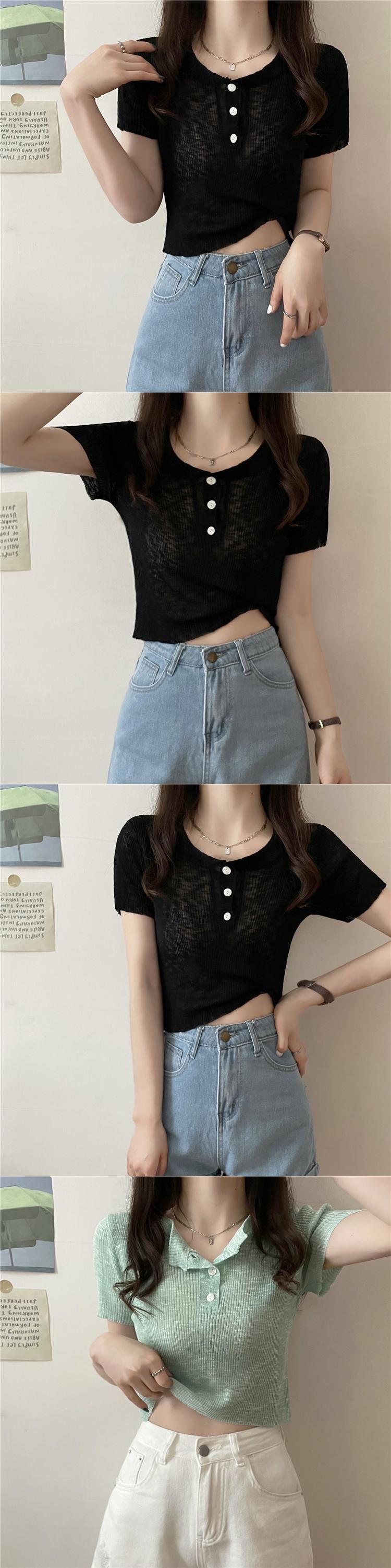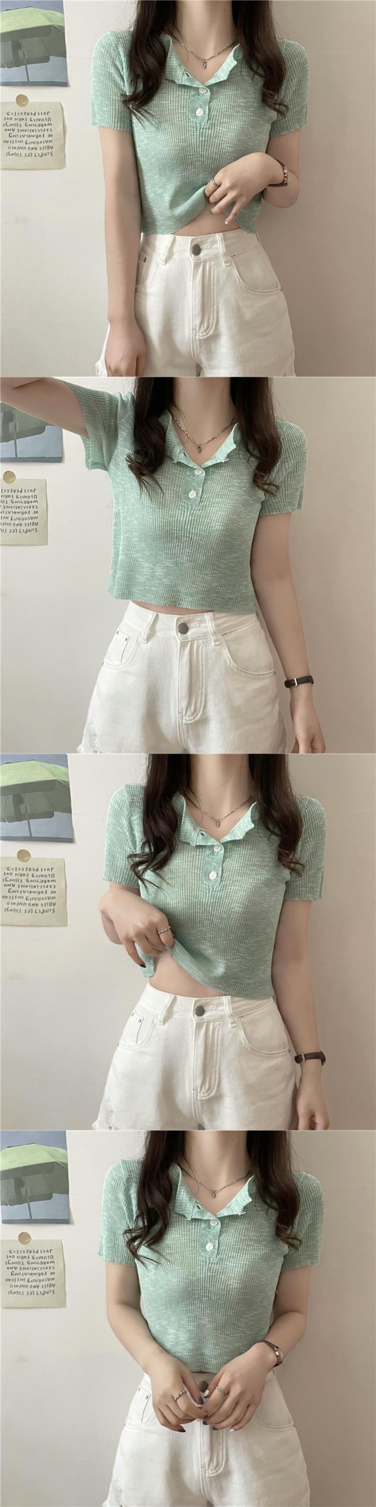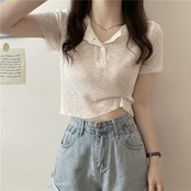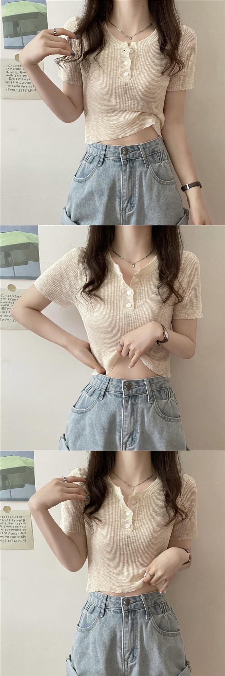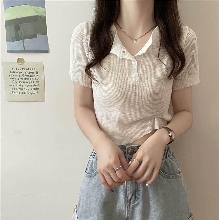 夏のユニークで特別なVネック半袖フロントショルダーTシャツ薄手のニットショートセクションウエスタンスタイルのカードウエストスモールシャツクロップドトップレディース サマー 夏物 7460059843977472 | framboise21