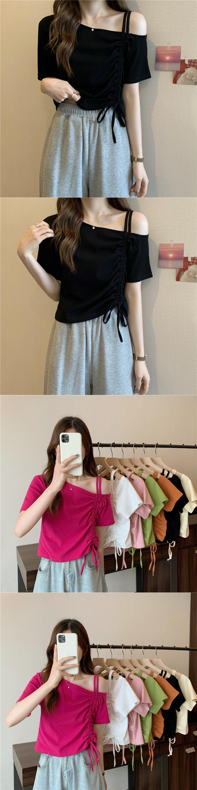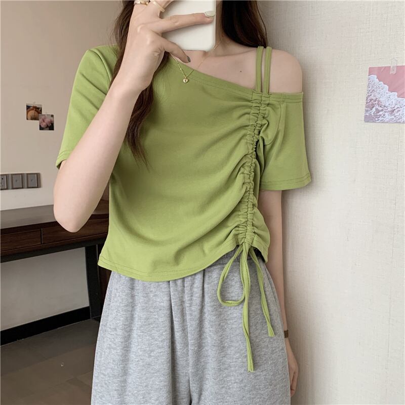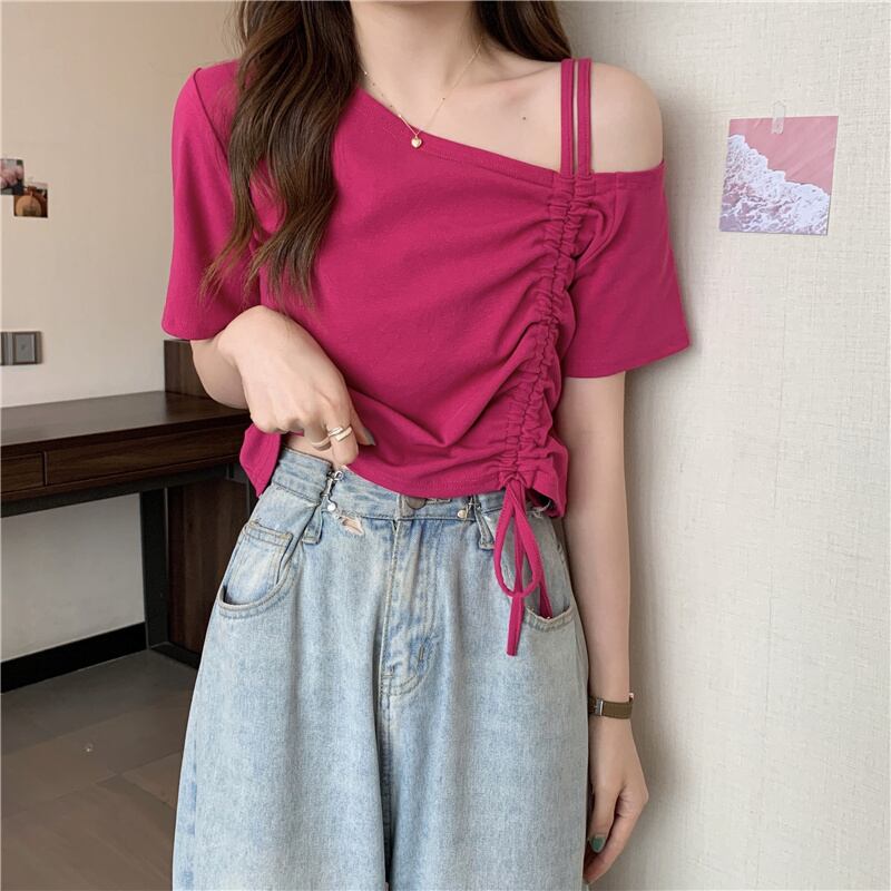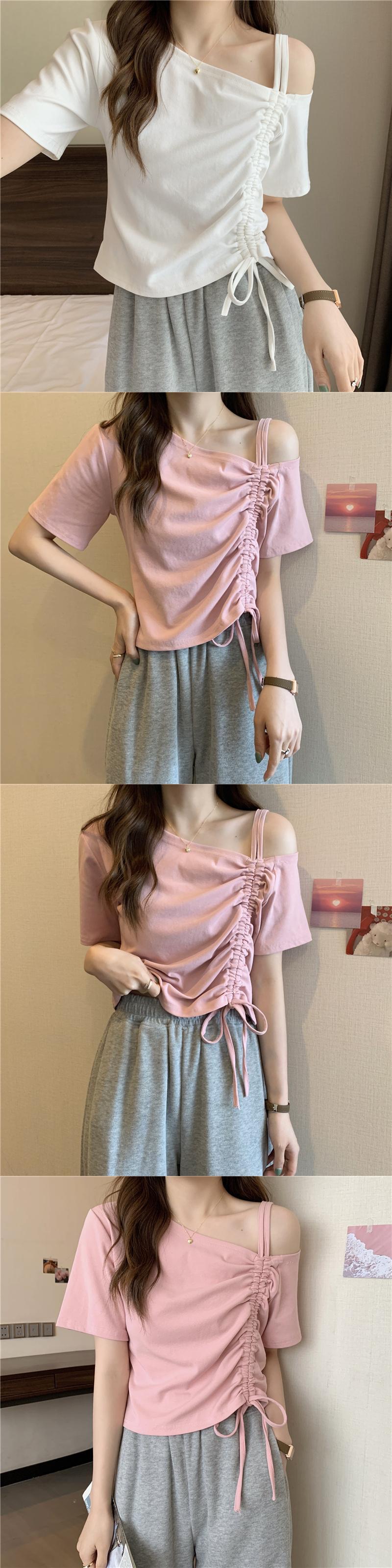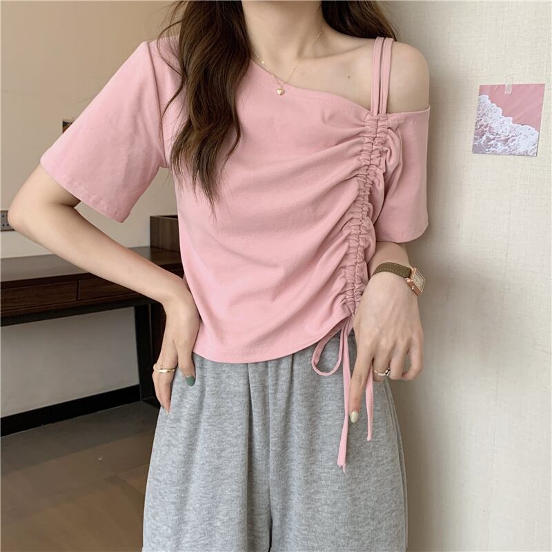 センスドローストリングオフショルダーホワイト半袖Tシャツ女性の夏のスリムフィットと薄い純粋な欲望ニッチショートトップ サマー 夏物 ピュア 7460068610442528 | framboise21
