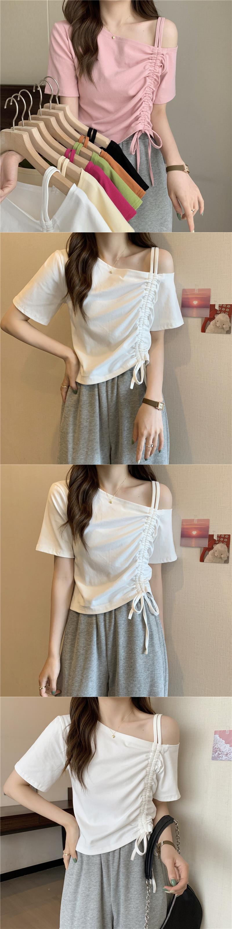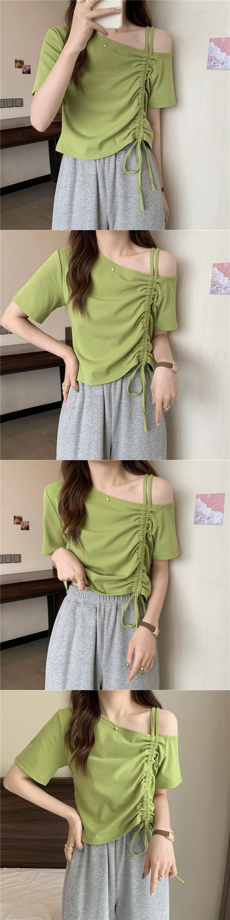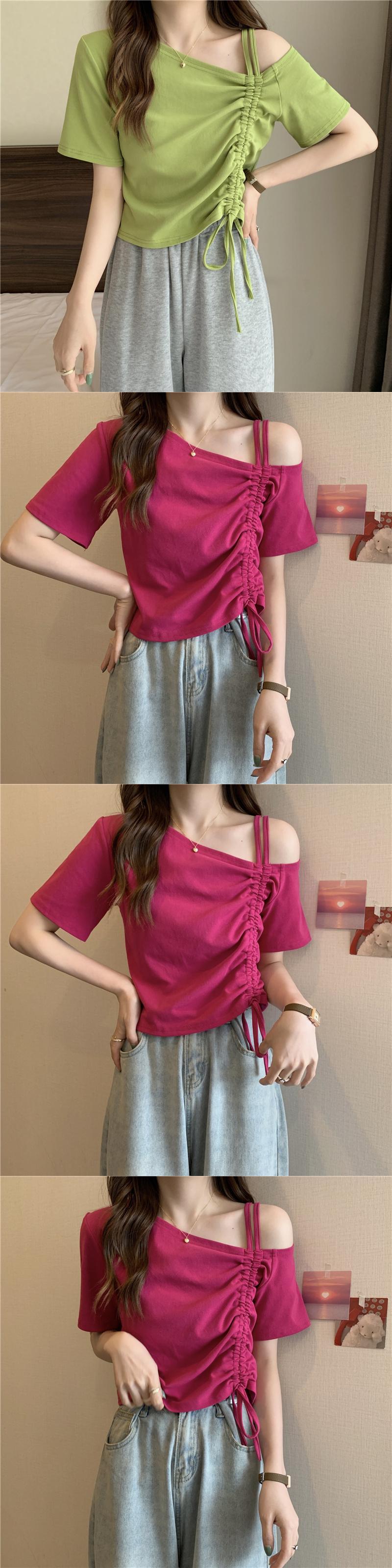 センスドローストリングオフショルダーホワイト半袖Tシャツ女性の夏のスリムフィットと薄い純粋な欲望ニッチショートトップ サマー 夏物 ピュア 7460068610442528 | framboise21