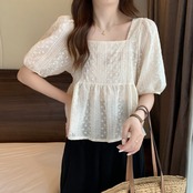 フレンチスクエアネック半袖レースシフォンシャツレディースサマー気質シックスモールシャツパフスリーブベビーシャツスカートトップ 夏物 スクウェア 7460055902638327