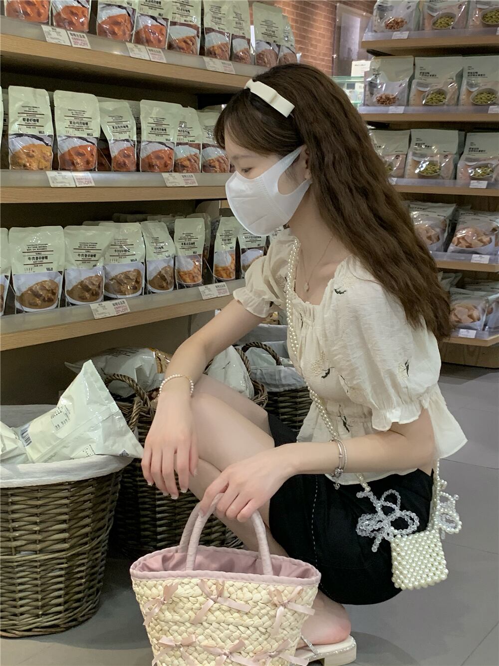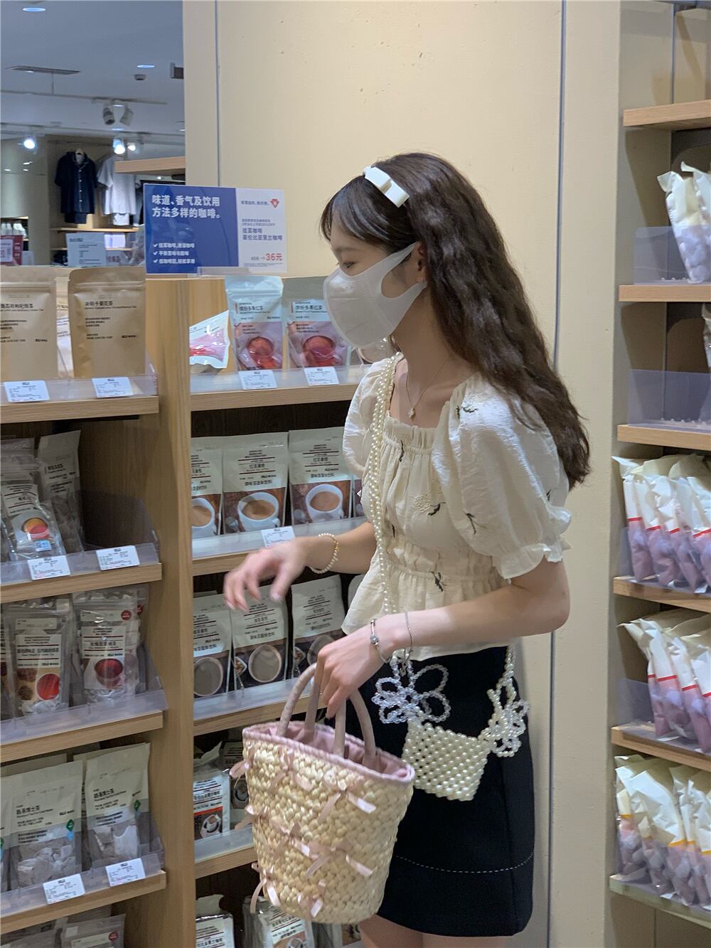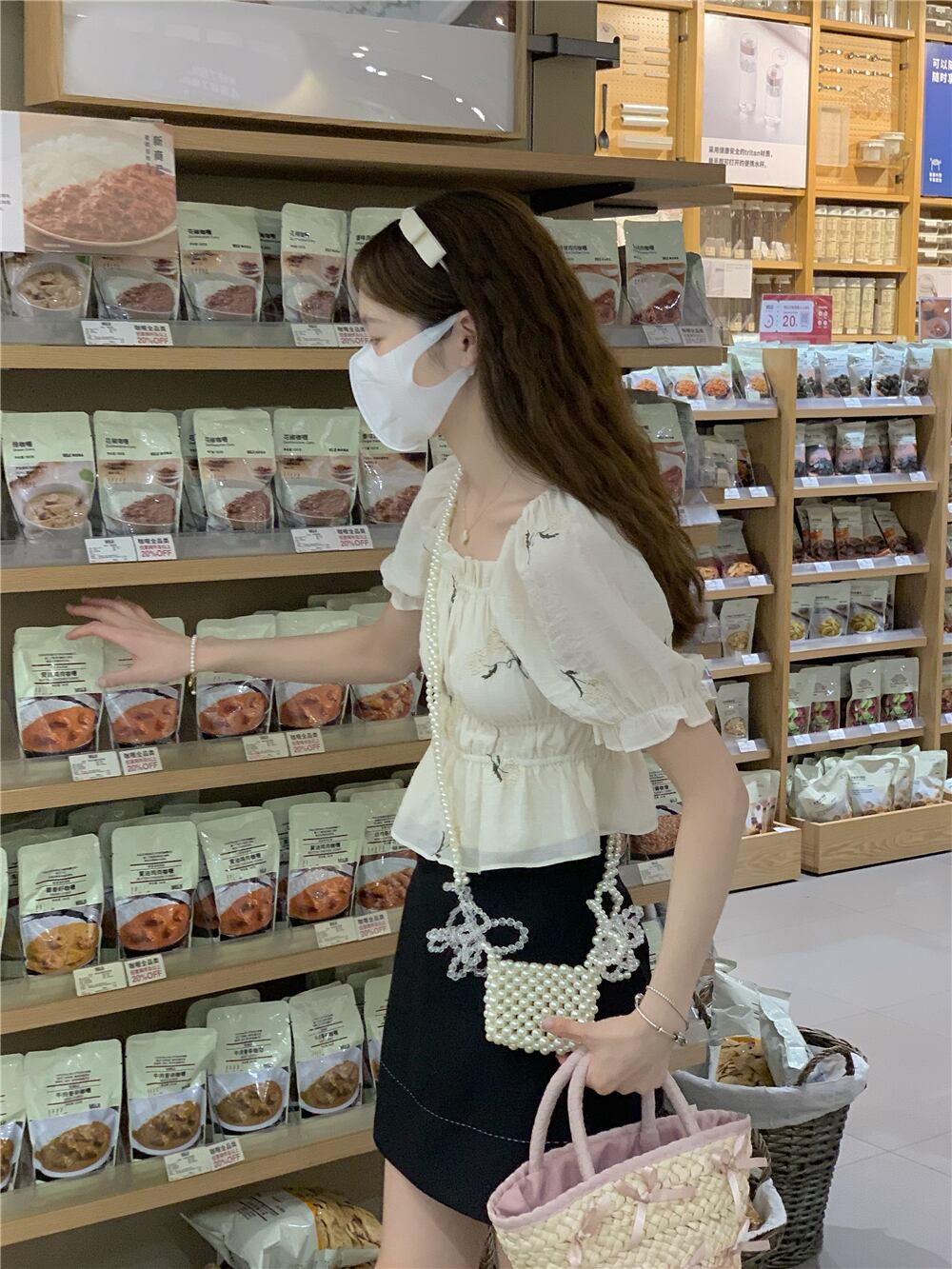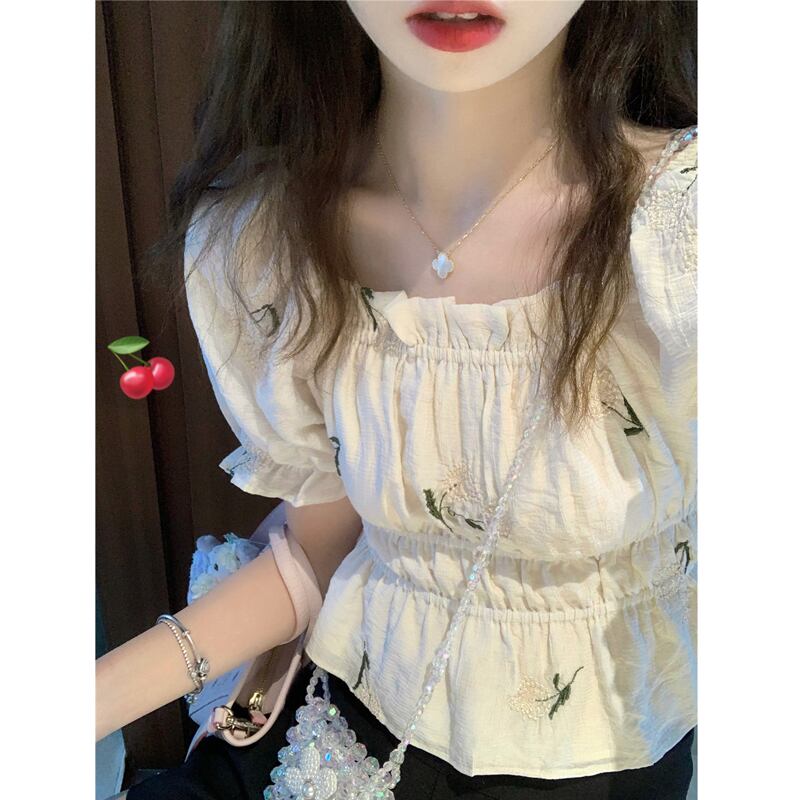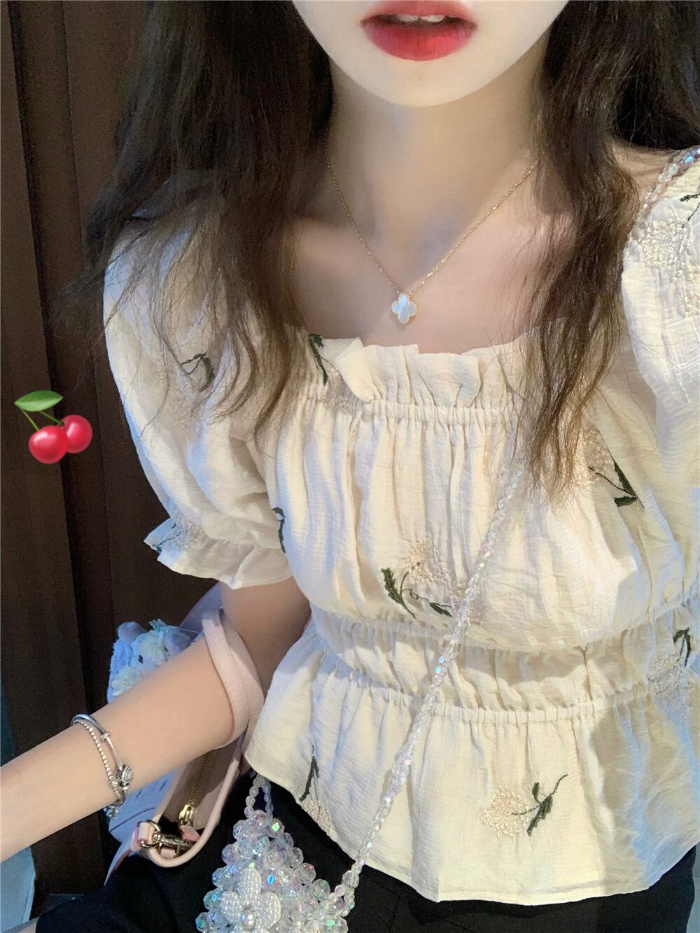 スクエアネックバブル半袖刺繍フローラルトップサマースタイルフレッシュで優しいスモールシャツワンショルダーシャツシャツ レッド 夏物 花柄 スクウェア 7460096873195361 | framboise21