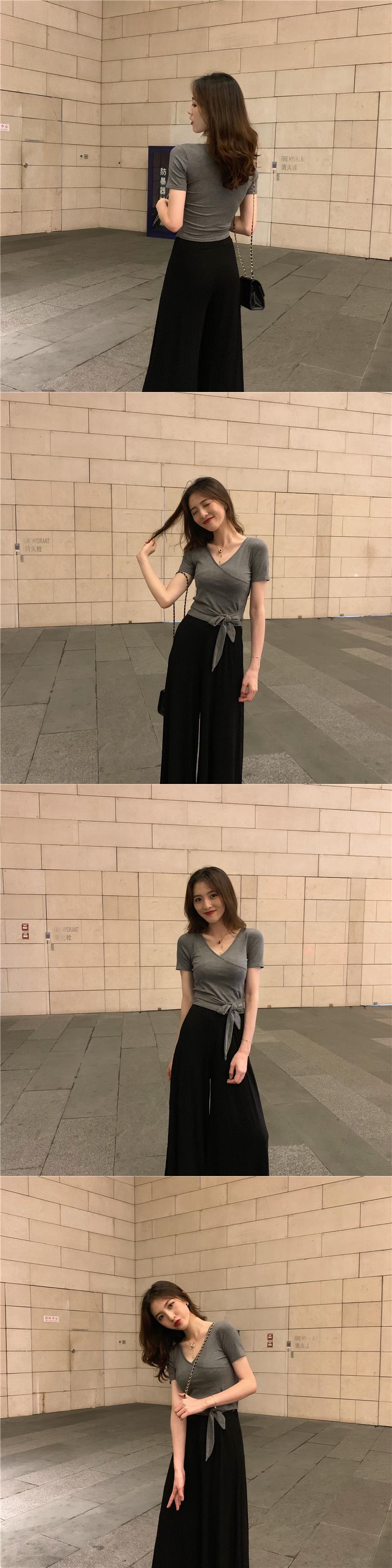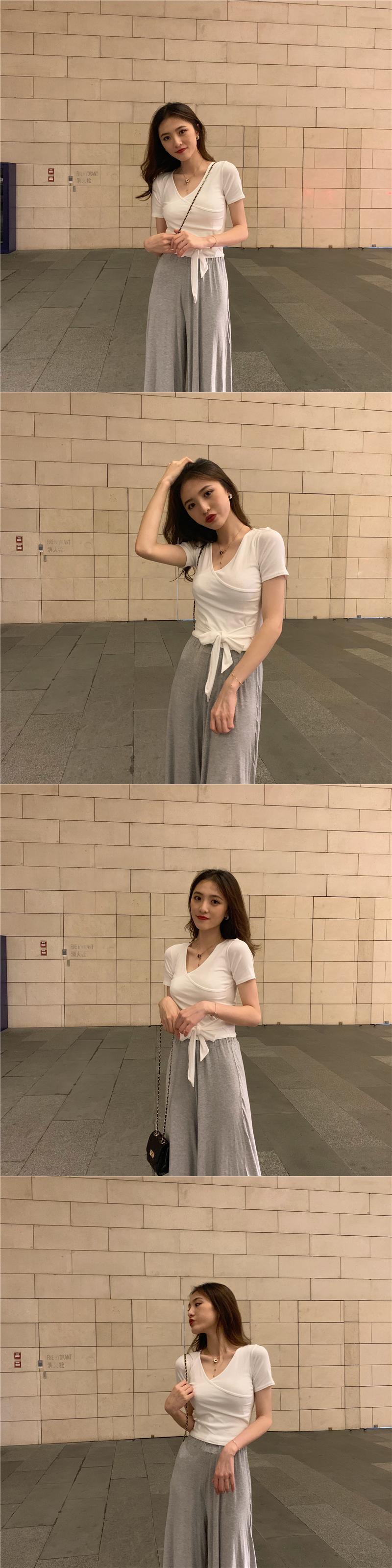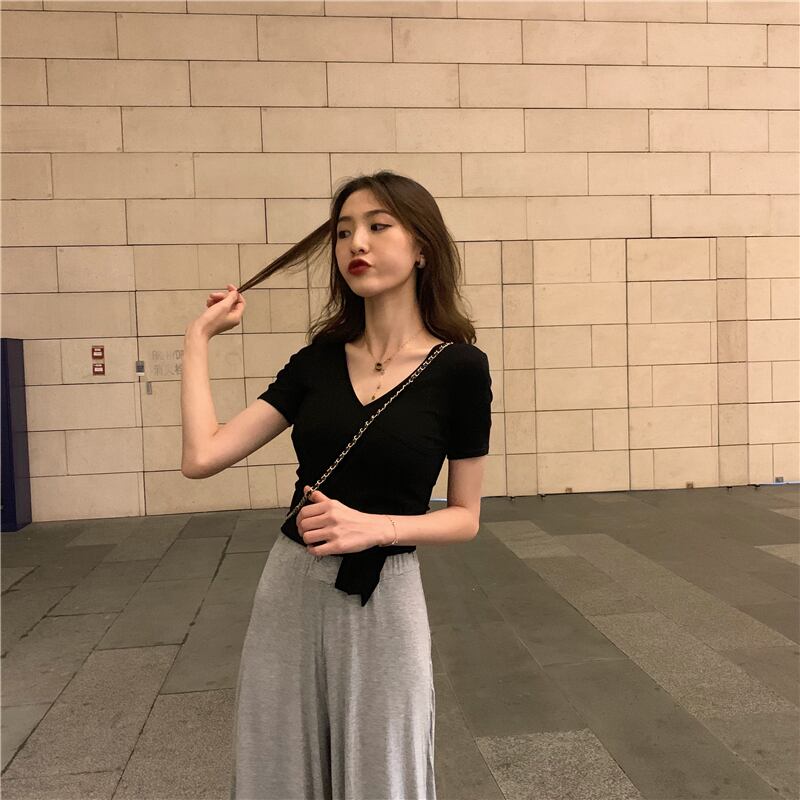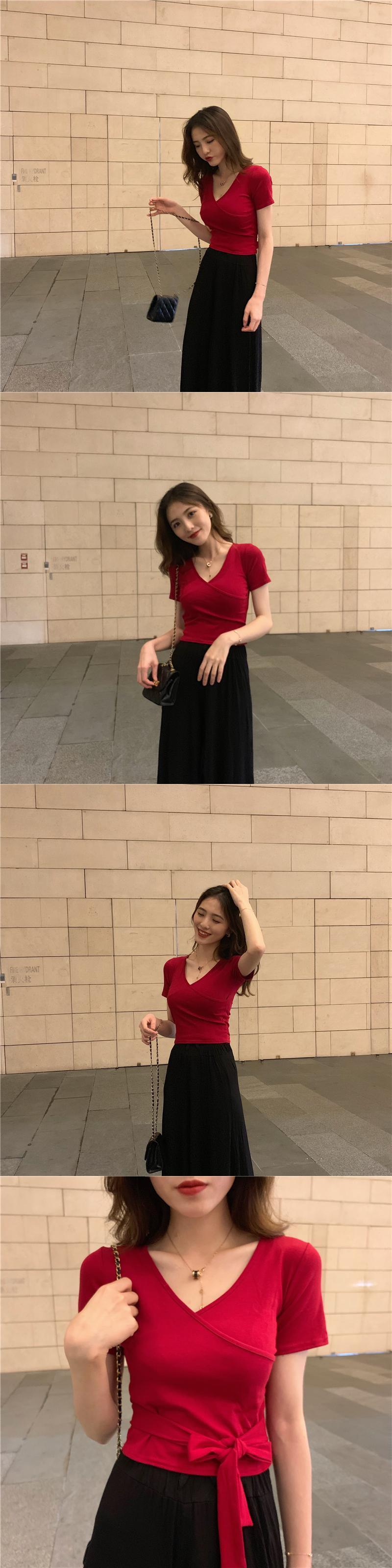 半袖Tシャツレディース2022年夏の新しいスリムフィットと薄いデザインセンス注意深いマシンカラーボーンクロスVネックショートトップ サマー 夏物 7460037350532336 | framboise21