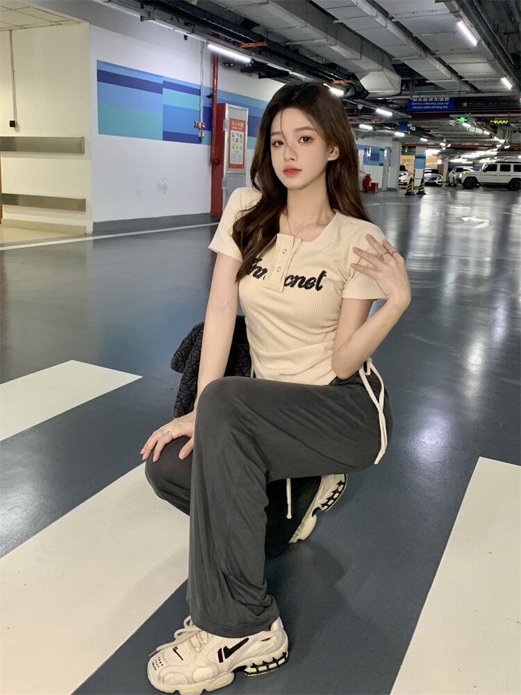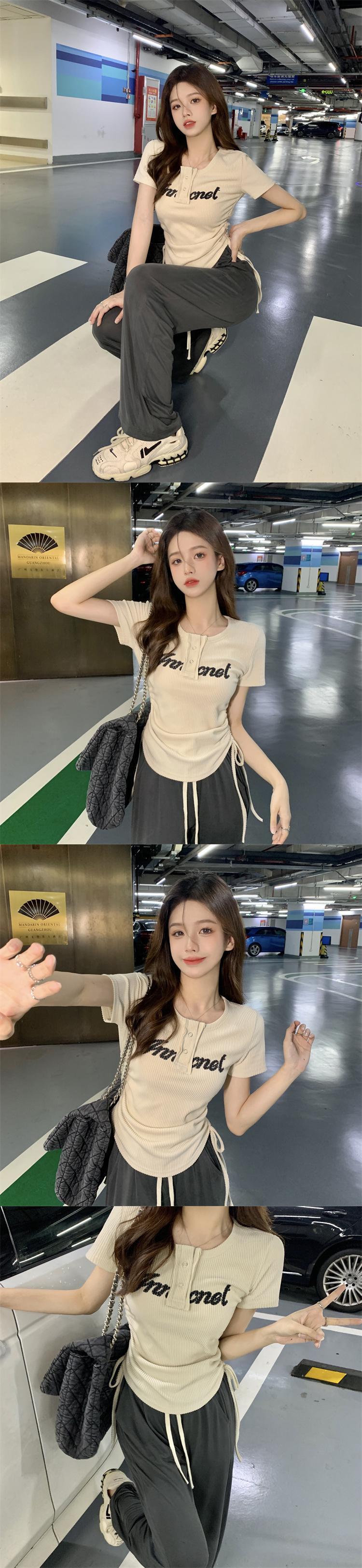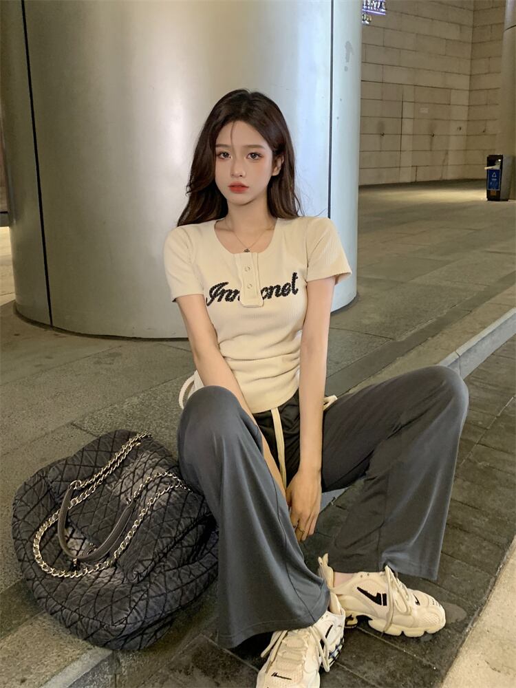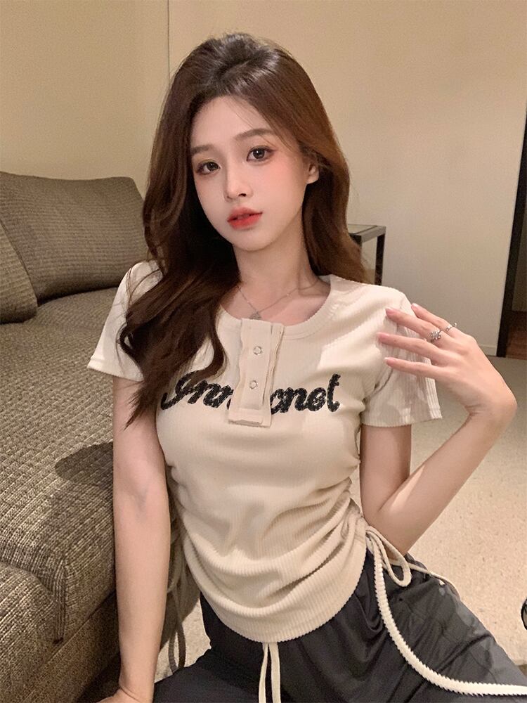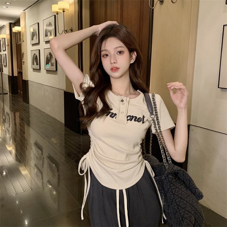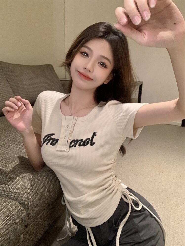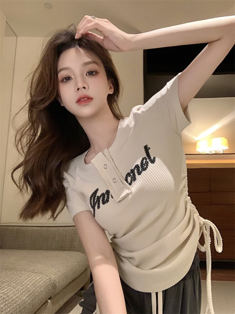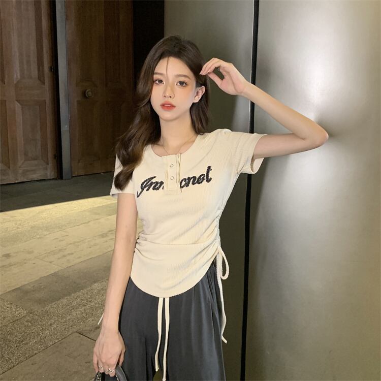 フロントショルダー半袖Tシャツ女性の2022年夏新しいレトロなデザインセンスハイウエストショートアイスシルクニットトップス ハイウェスト サマー 夏物 7460034901181678 | framboise21