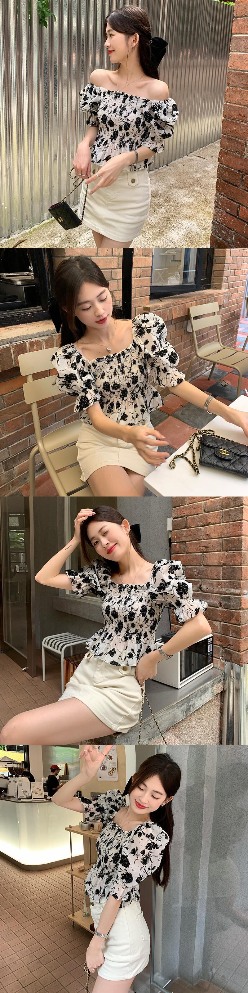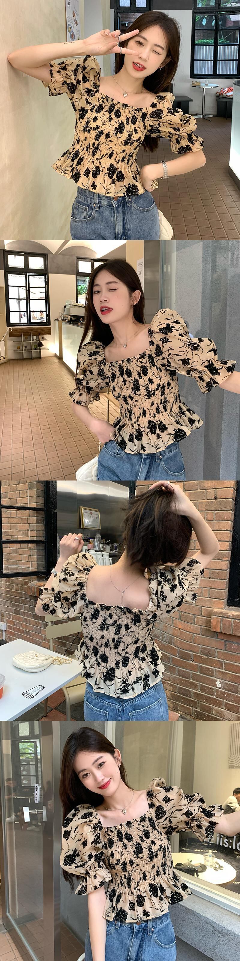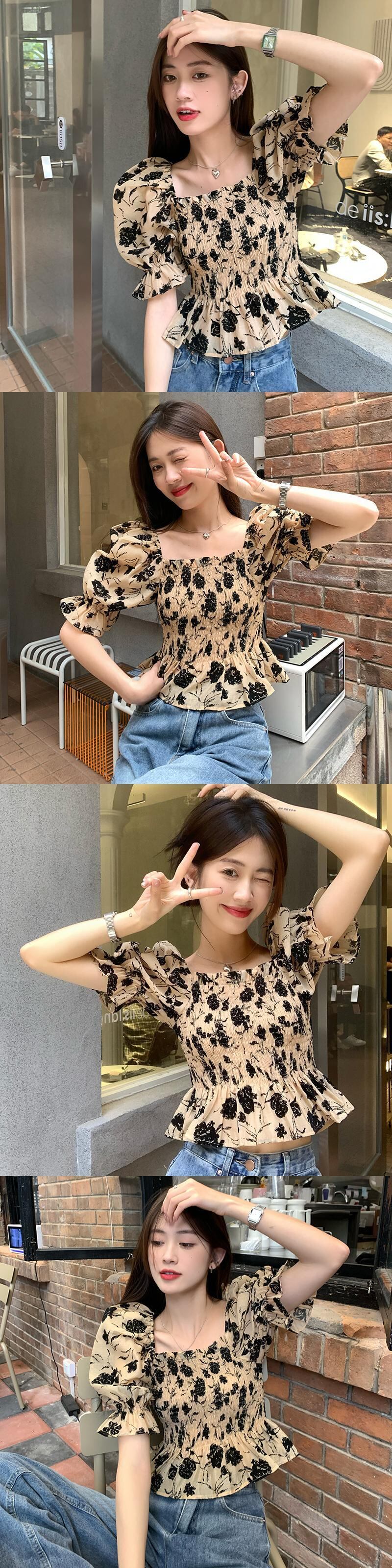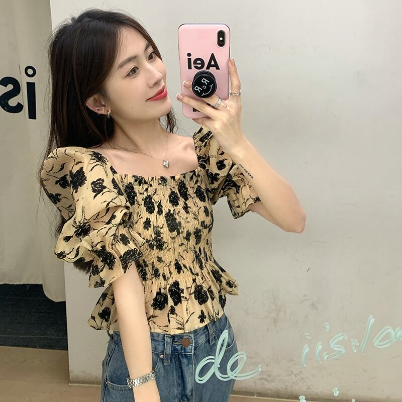 フレンチスクエアネックパフスリーブフローラル半袖シャツレディースサマーシフォンシャツプリーツショートトップデザインニッチ 夏物 花柄 スクウェア 746004001804539 | framboise21