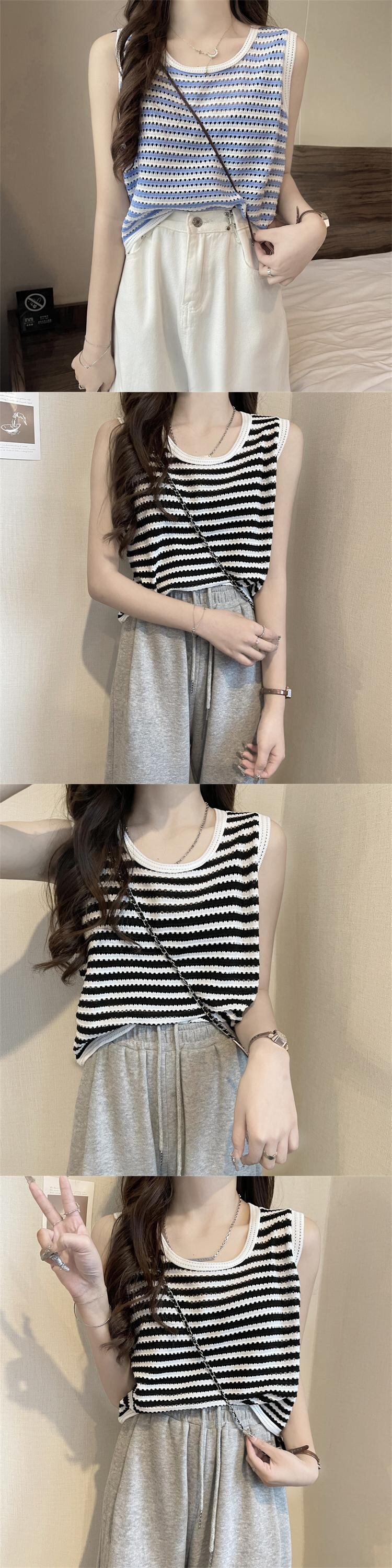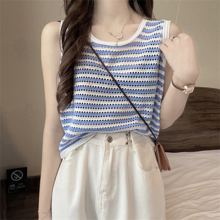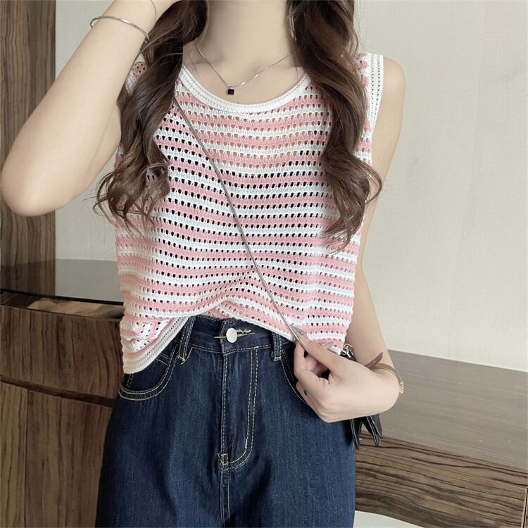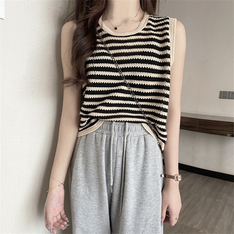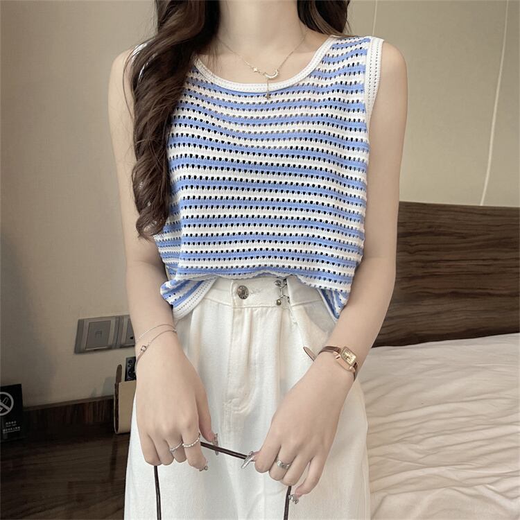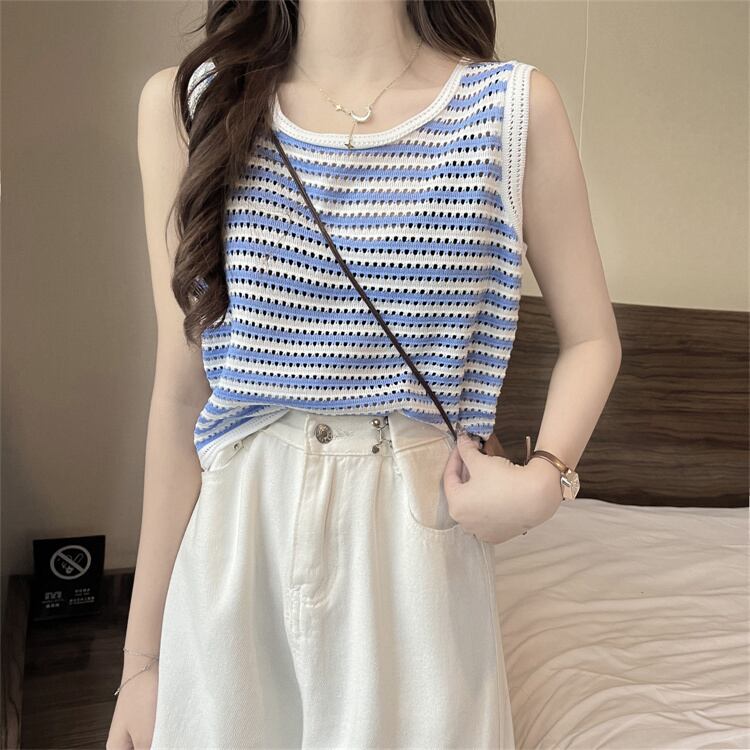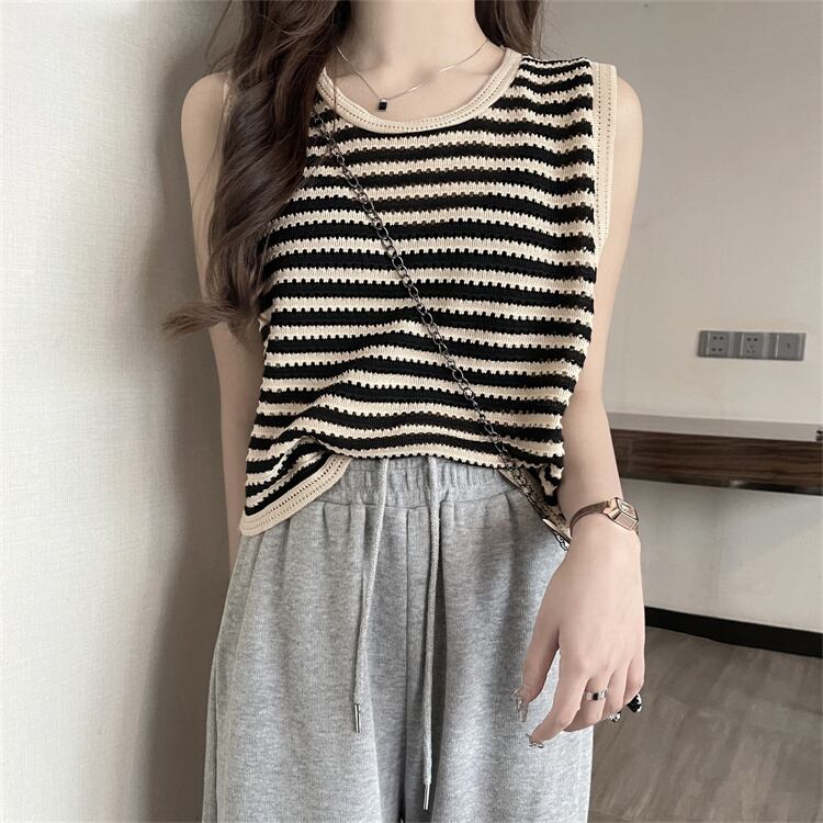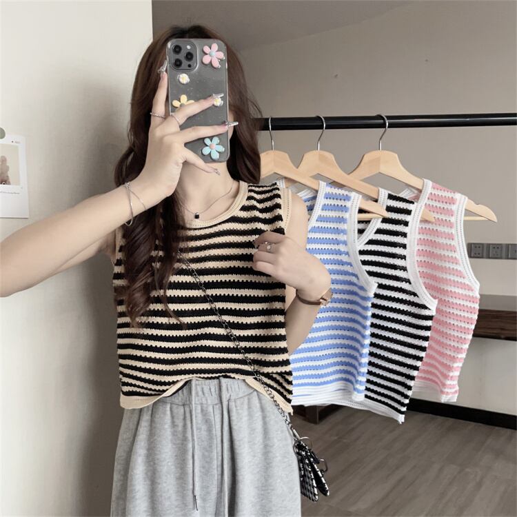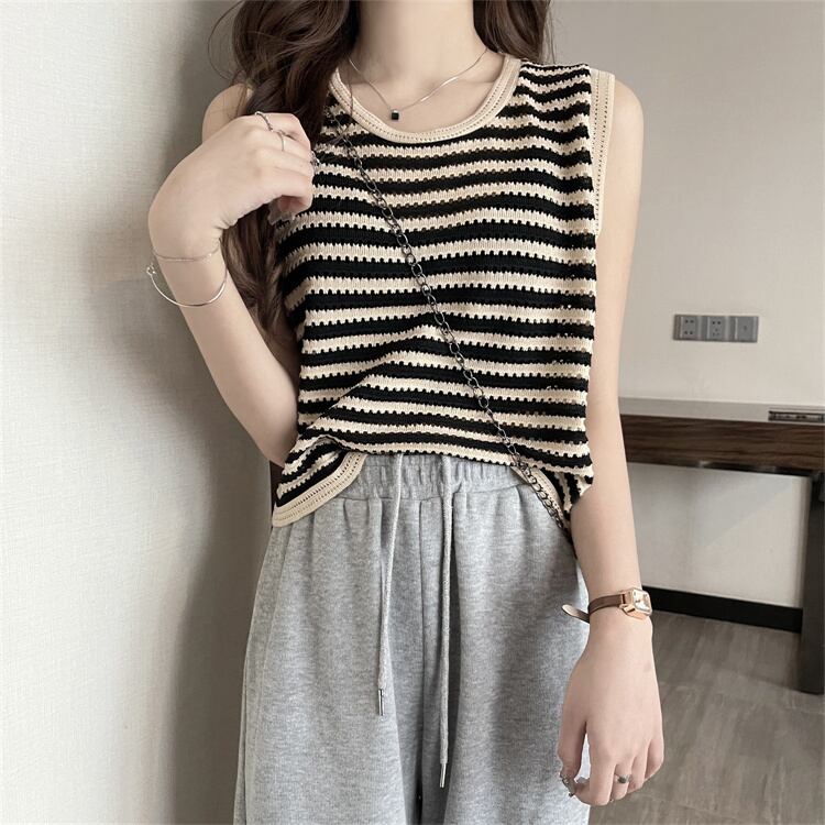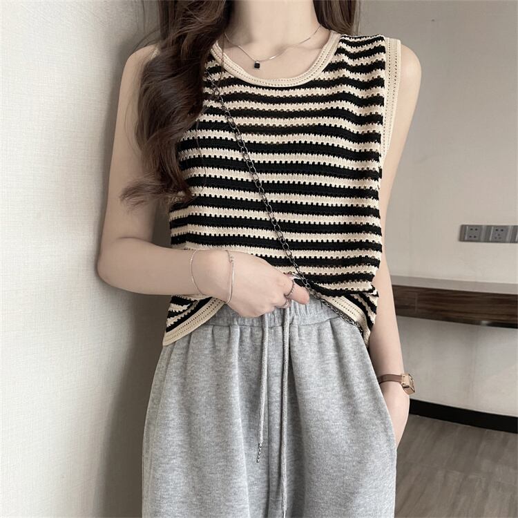 黒と白のストライプのアイスシルクニットサスペンダー中空ベスト女性のインナーとアウターウェアルーズショートベストノースリーブトップサマー ホワイト ブラック 夏物 7460065728738480 | framboise21