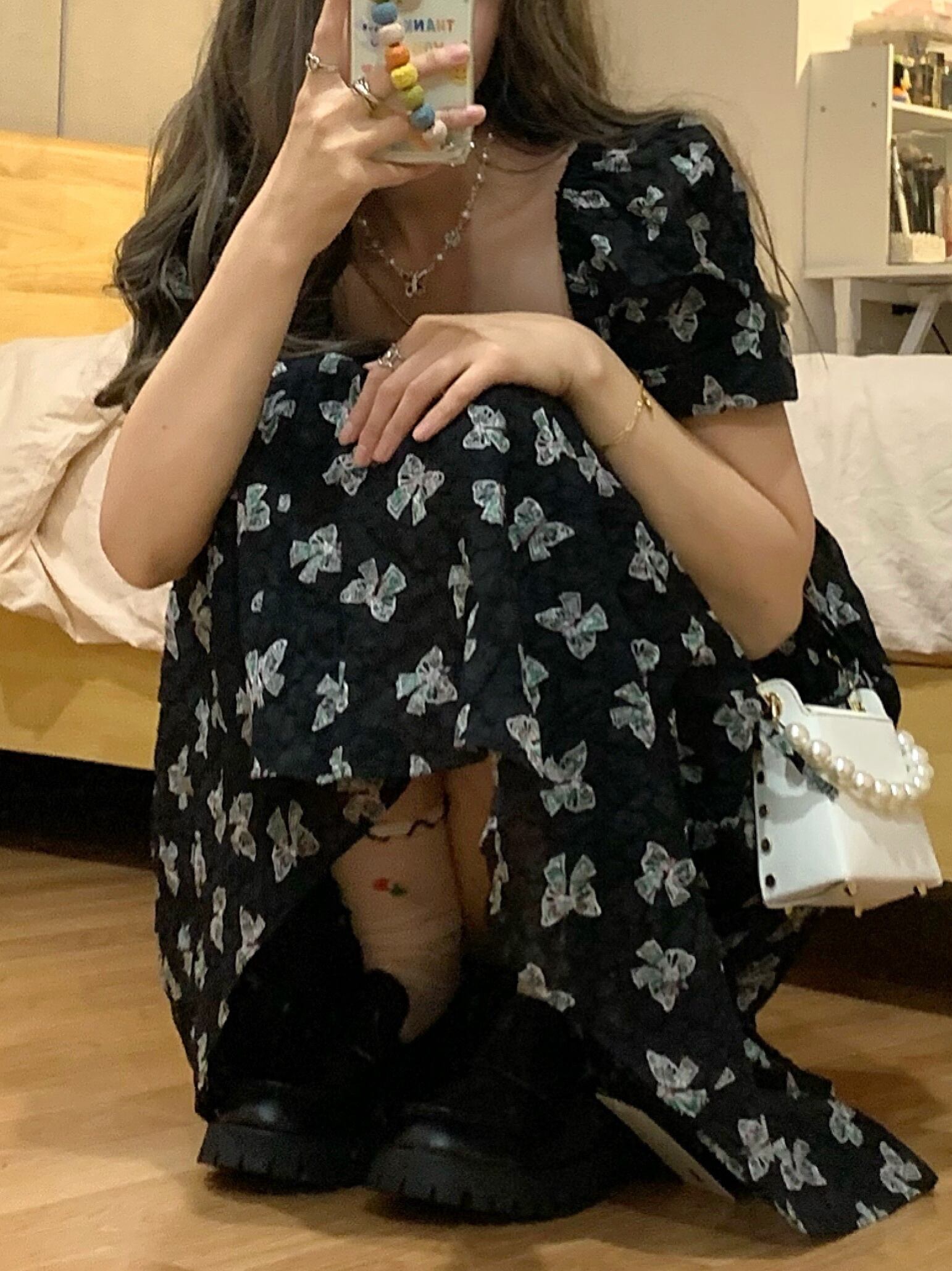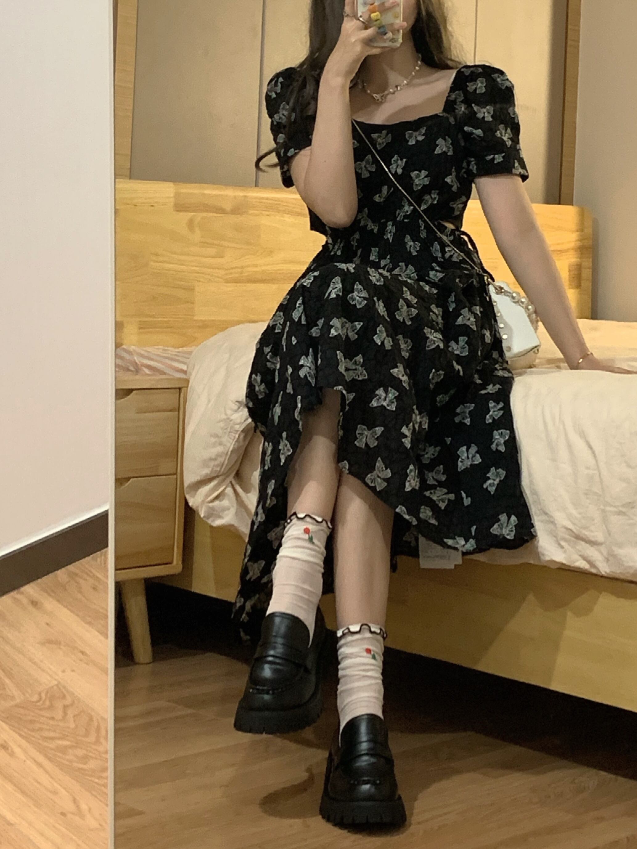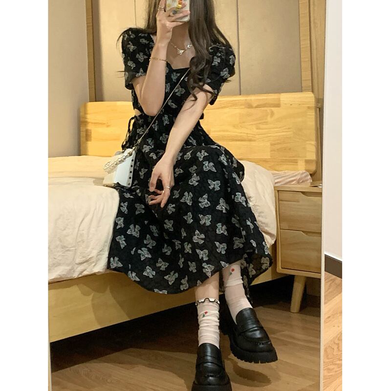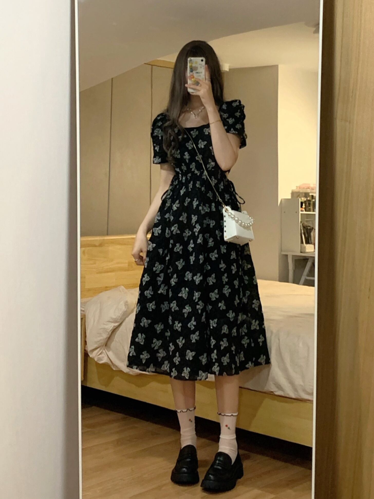 2022年春夏新作フレンチパフスリーブピンチウエストスカートブラックロングスカートウエストシンフローラルシフォンドレスメス スプリング 春物 サマー 夏物 花柄 7460082843824833 | framboise21