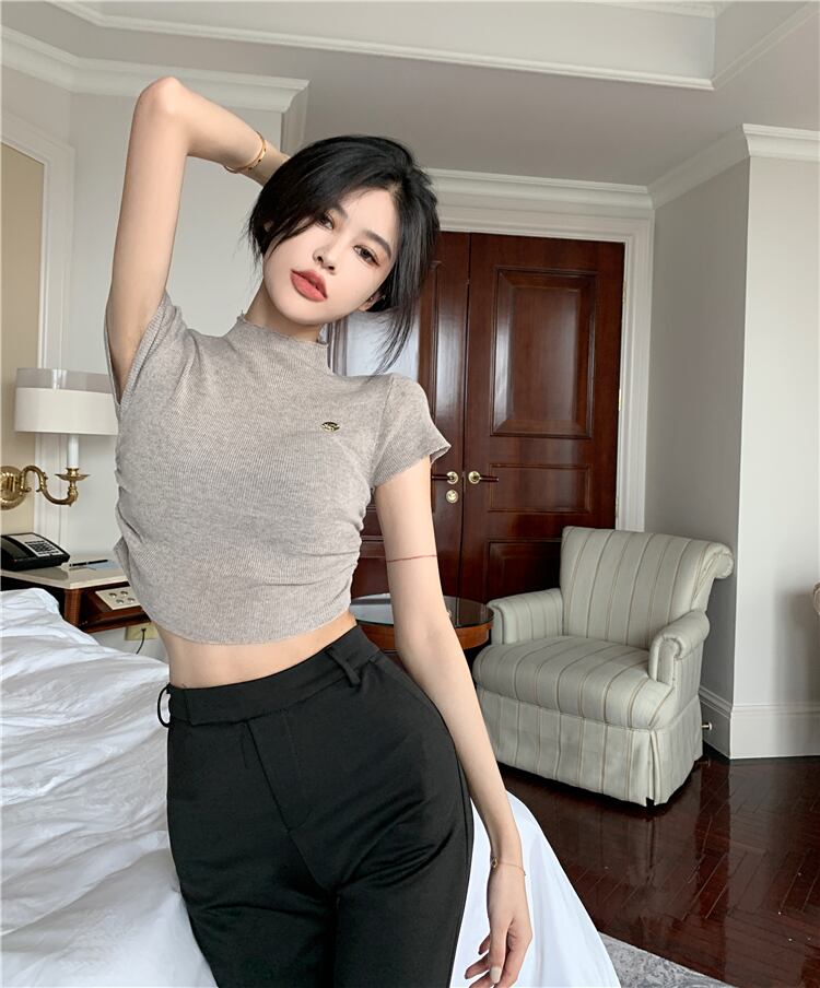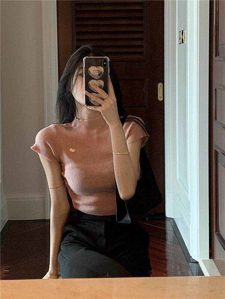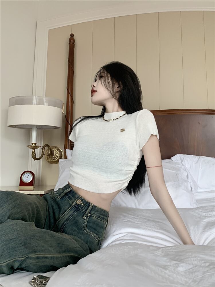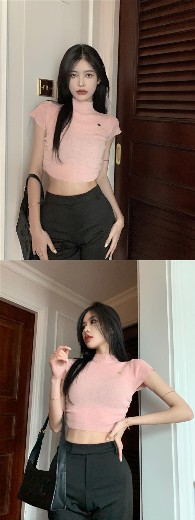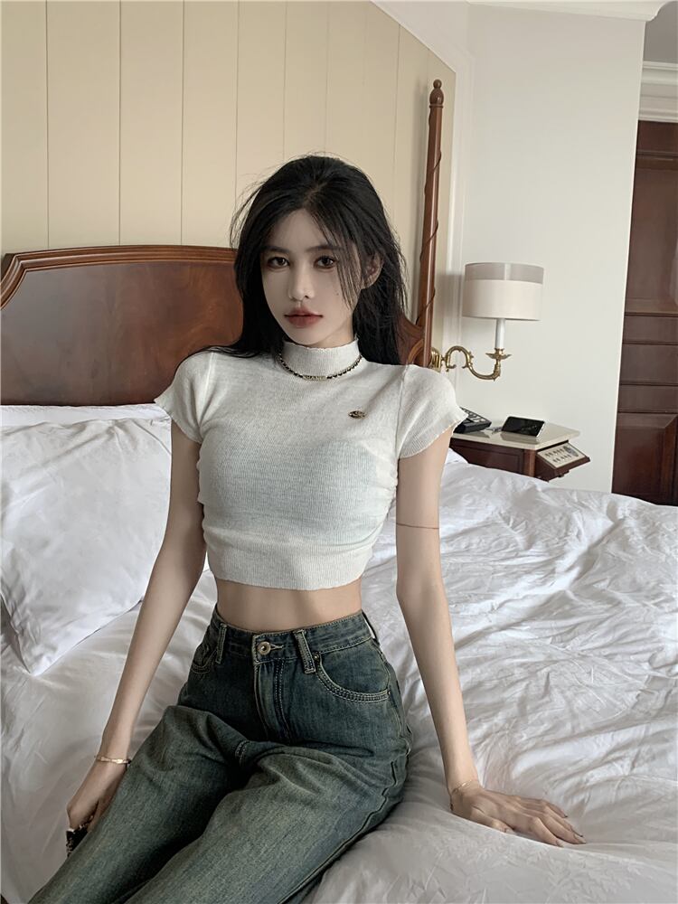アイスシルクニット薄手の半袖Tシャツレディースデザインセンスニッチ純粋な欲望セクシーなショートハーフタートルネックトップ夏 サマー 夏物 ピュア 7460096044567614 | framboise21