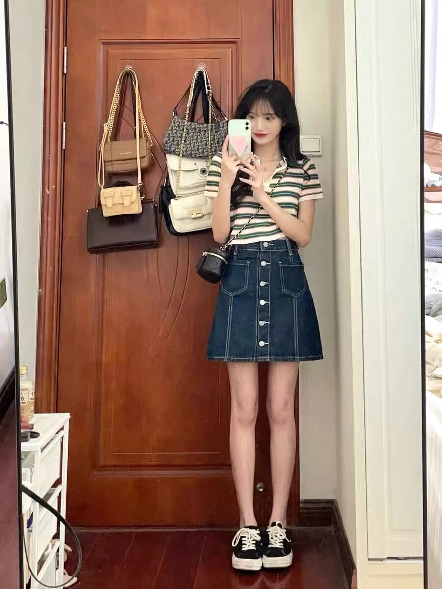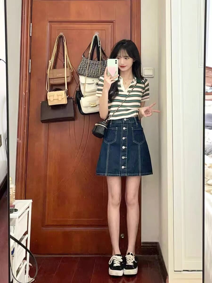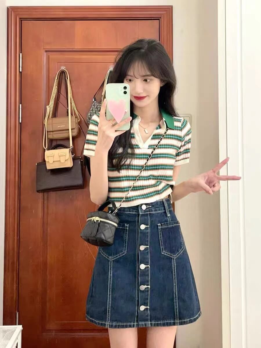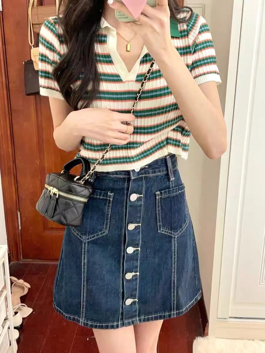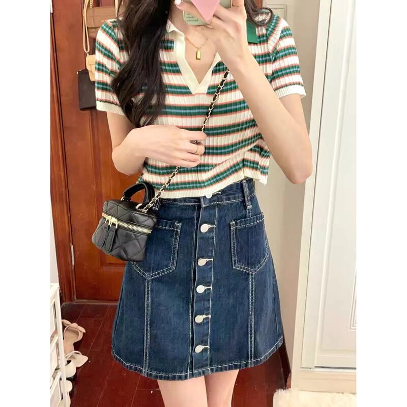 グリーンストライプTシャツレディース半袖夏アメリカンレトロデザインショートアイスシルクニットセーターポロカラートップ ハーフスリーブ サマー 夏物 7460011072965062 | framboise21