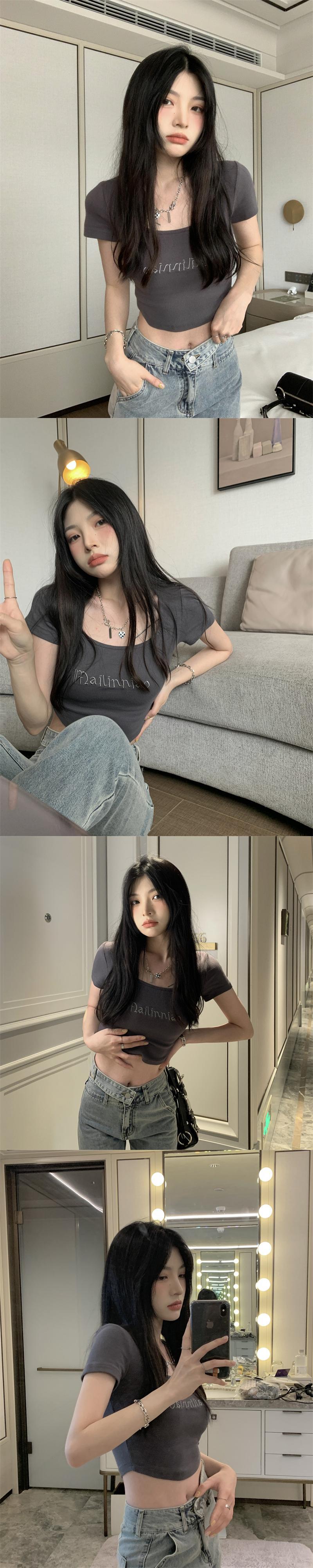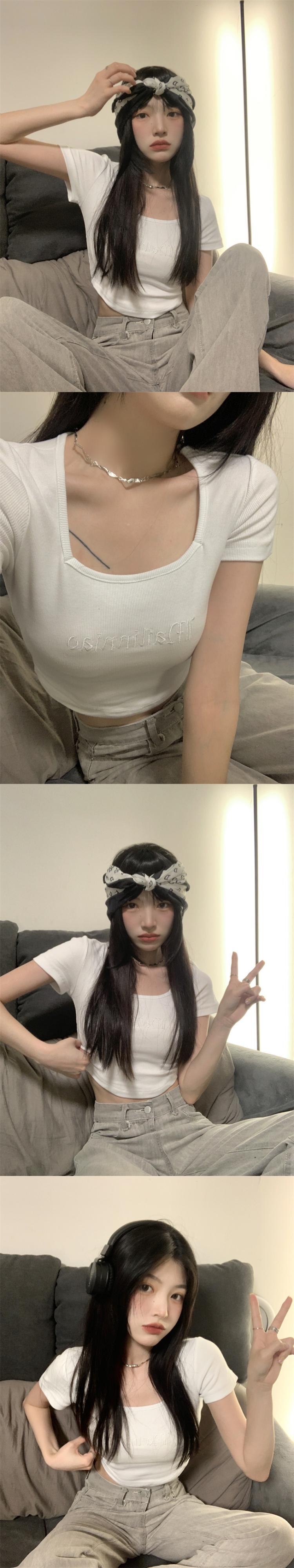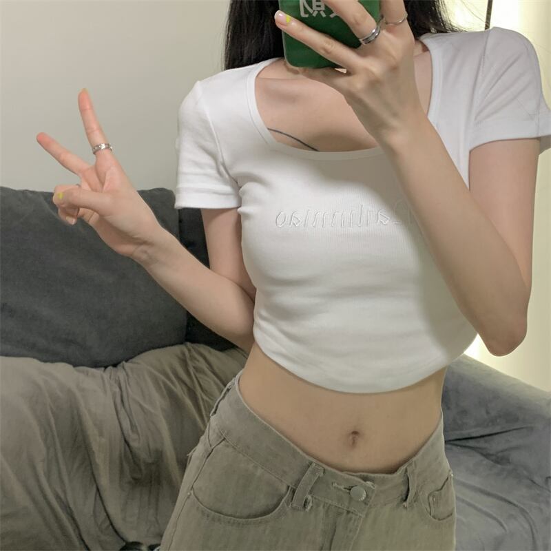 アメリカンレトロフロントショルダー半袖Tシャツレディースサマーデザインニッチシックスウィートスクエアカラーショートトップイン 大人ガーリー キュート カジュアル 夏物 スクウェア 746007225743590 | framboise21