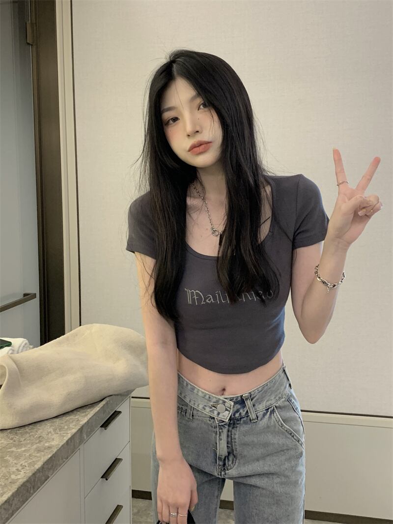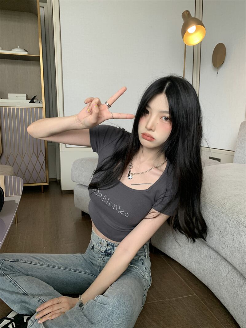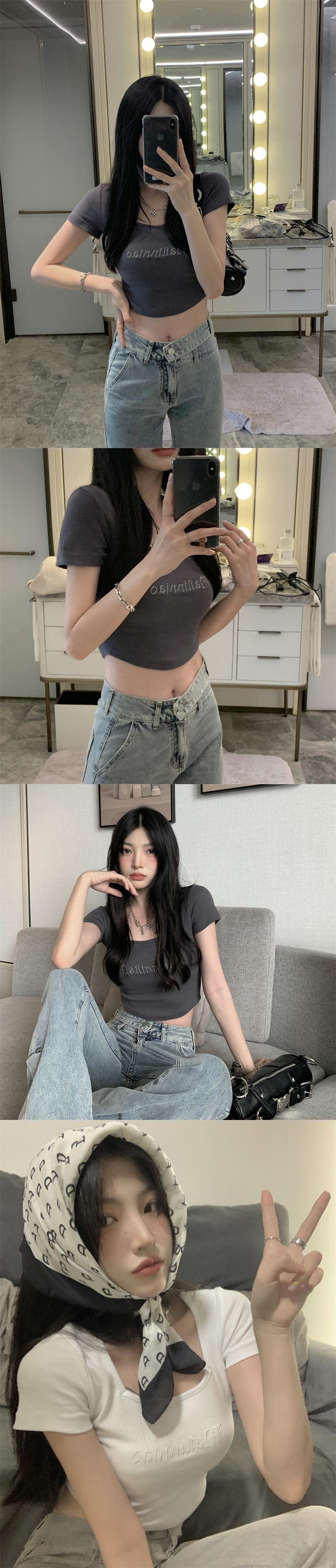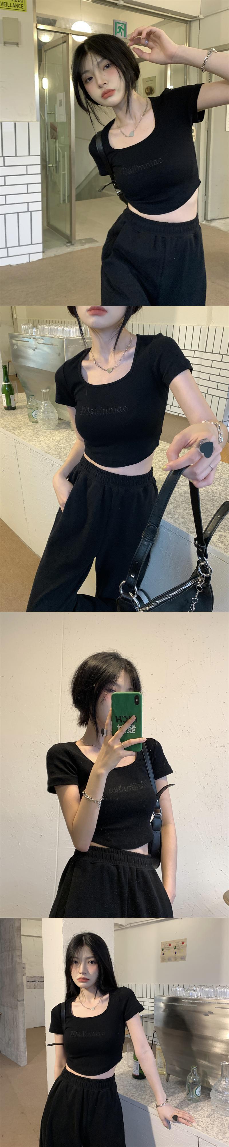 アメリカンレトロフロントショルダー半袖Tシャツレディースサマーデザインニッチシックスウィートスクエアカラーショートトップイン 大人ガーリー キュート カジュアル 夏物 スクウェア 746007225743590 | framboise21