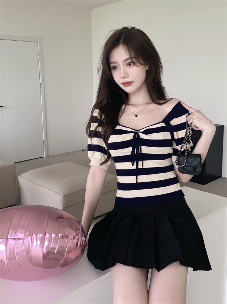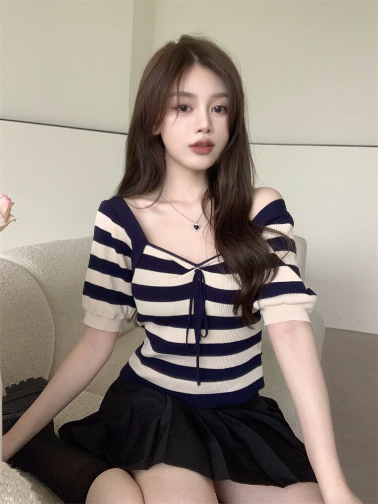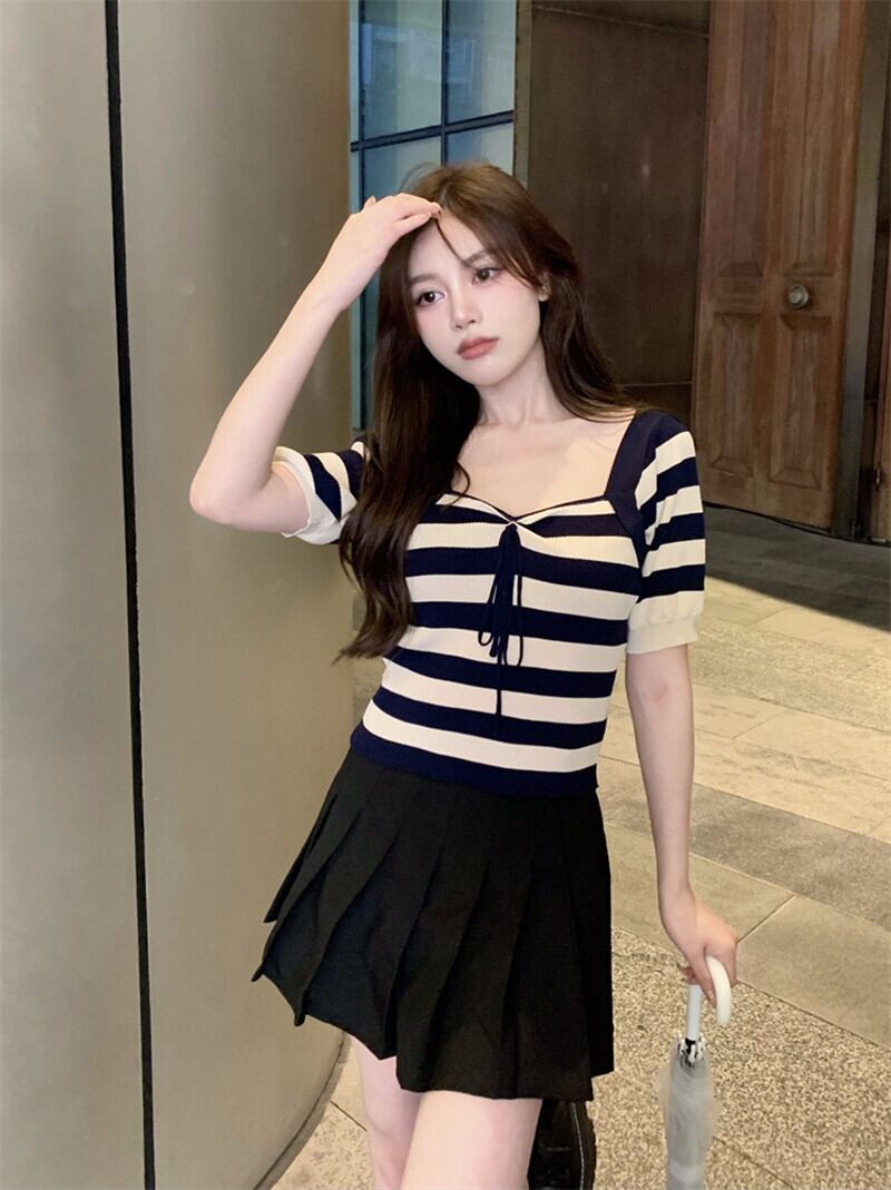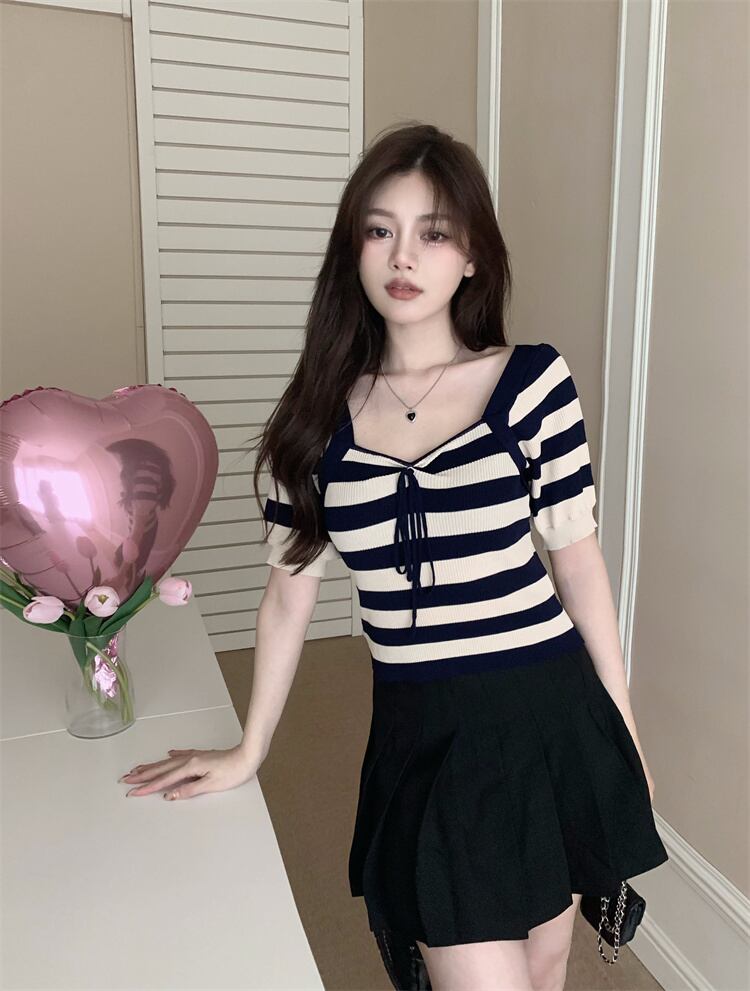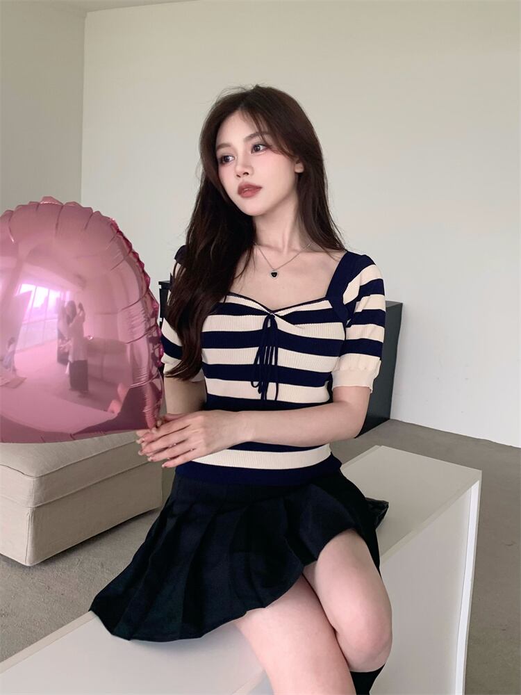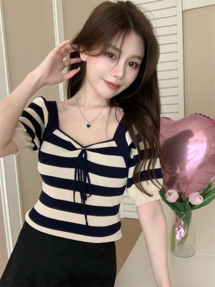 純粋な欲望セクシーなスクエアカラー露出カラーボーンストライプニットTシャツ女性の夏のハイウエスト薄くてシックなアイスシルクショートトップ ハイウェスト サマー 夏物 スクウェア 7460013002779551 | framboise21