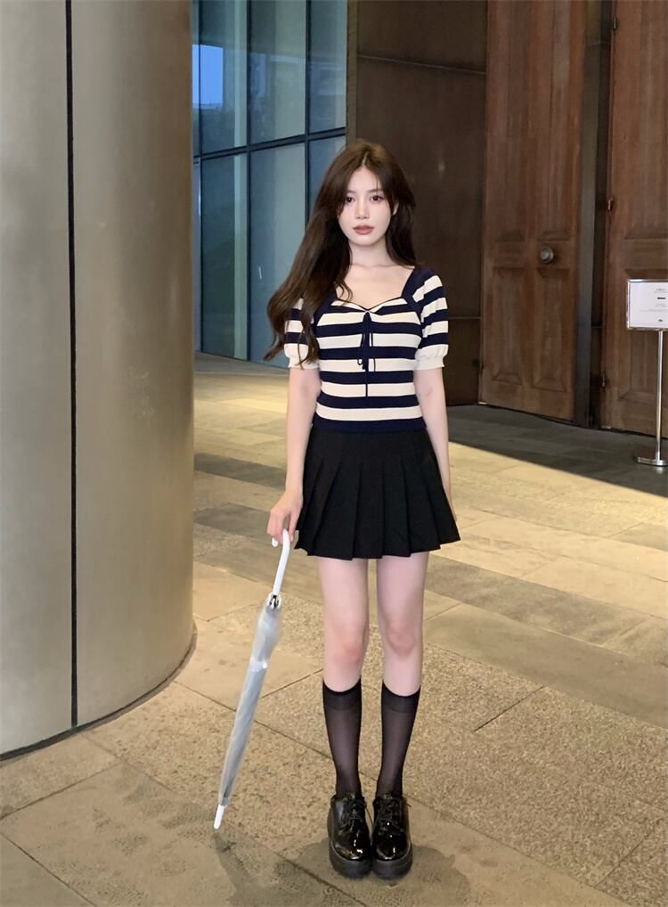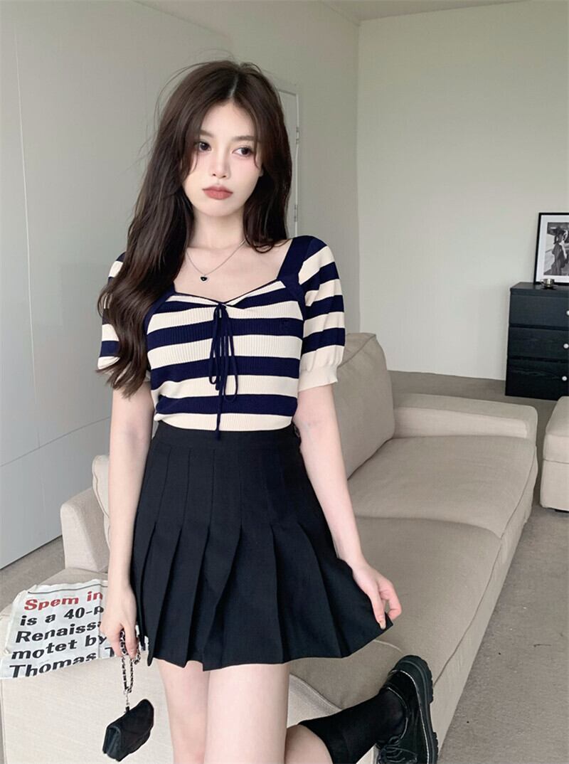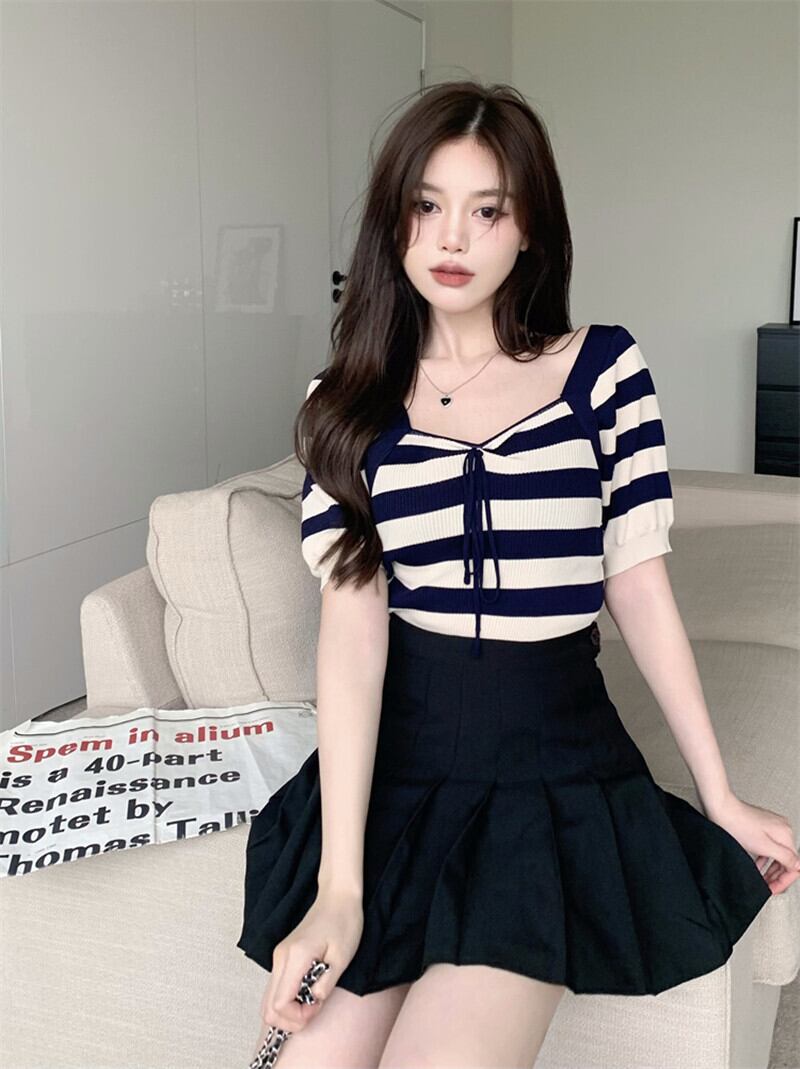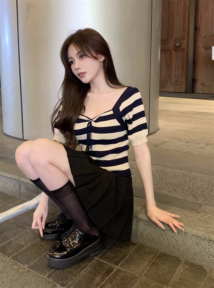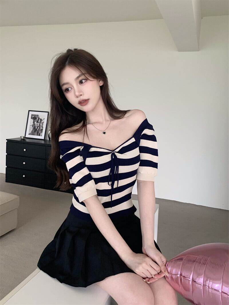 純粋な欲望セクシーなスクエアカラー露出カラーボーンストライプニットTシャツ女性の夏のハイウエスト薄くてシックなアイスシルクショートトップ ハイウェスト サマー 夏物 スクウェア 7460013002779551 | framboise21