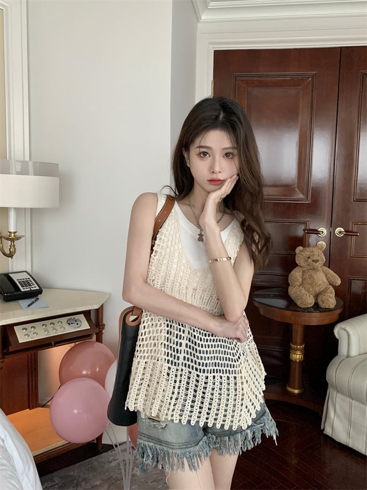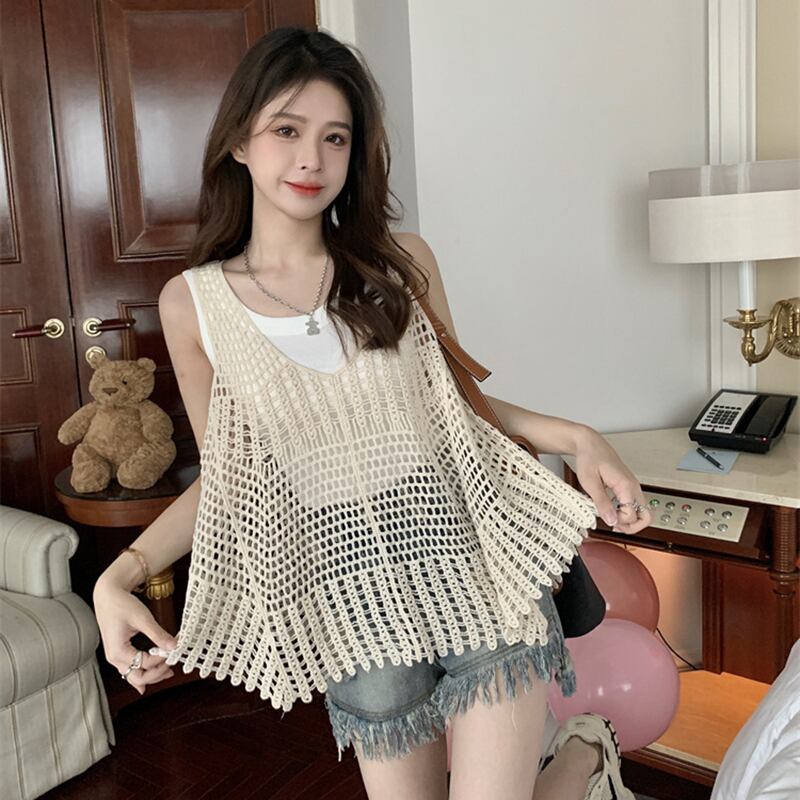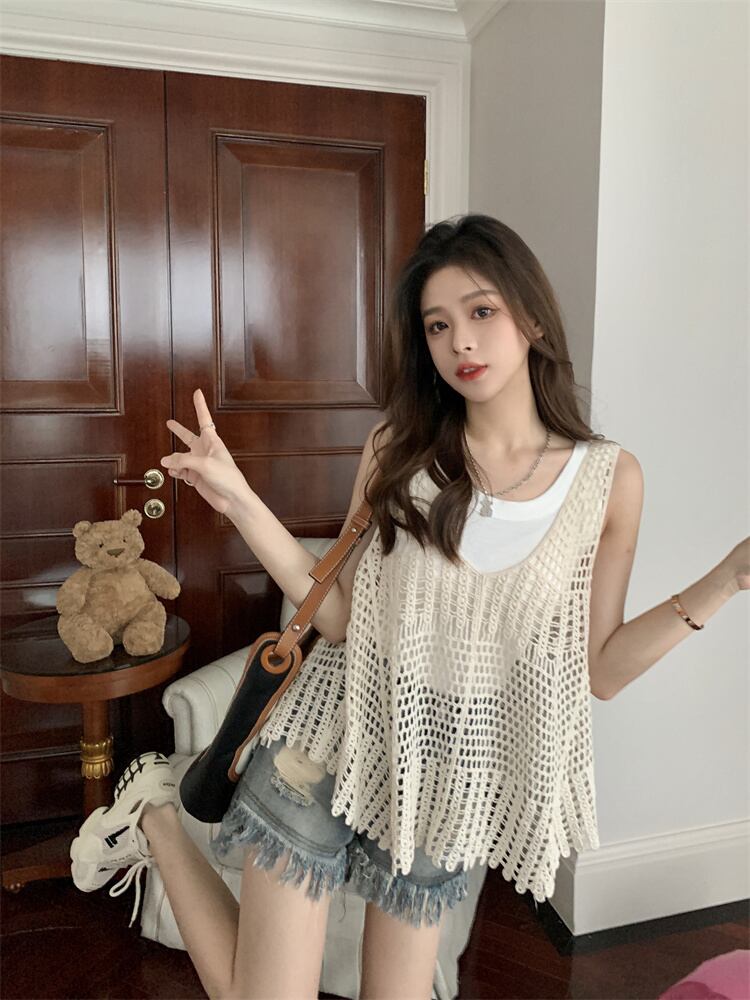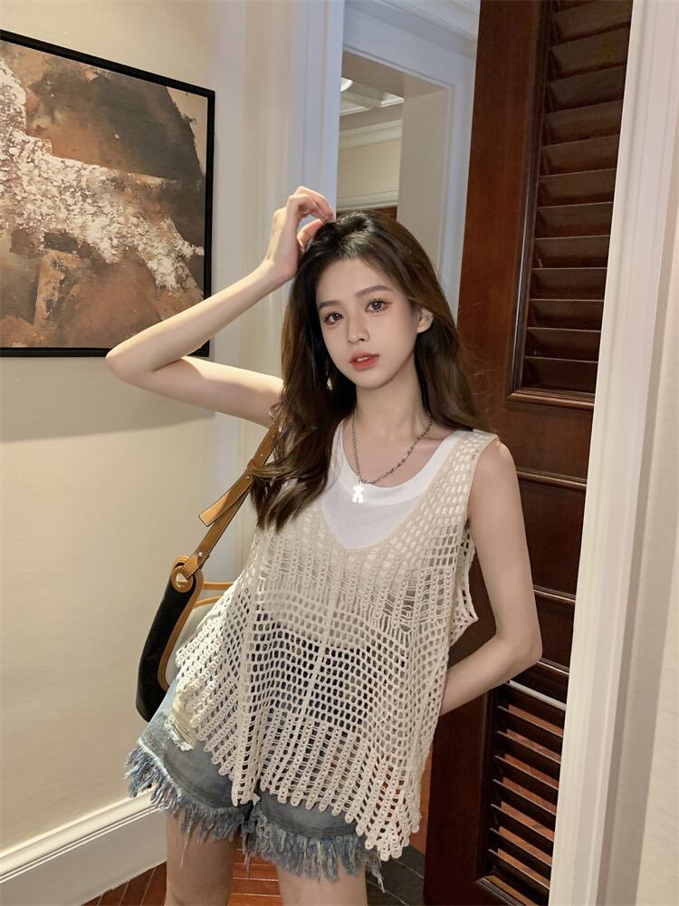 ショートノースリーブトップ女性サマーデザイントレンディな中空スモールシャツサスペンダーアウターブラウスニットベストベスト 半袖 ハーフスリーブ 夏物 7460036494139347 | framboise21