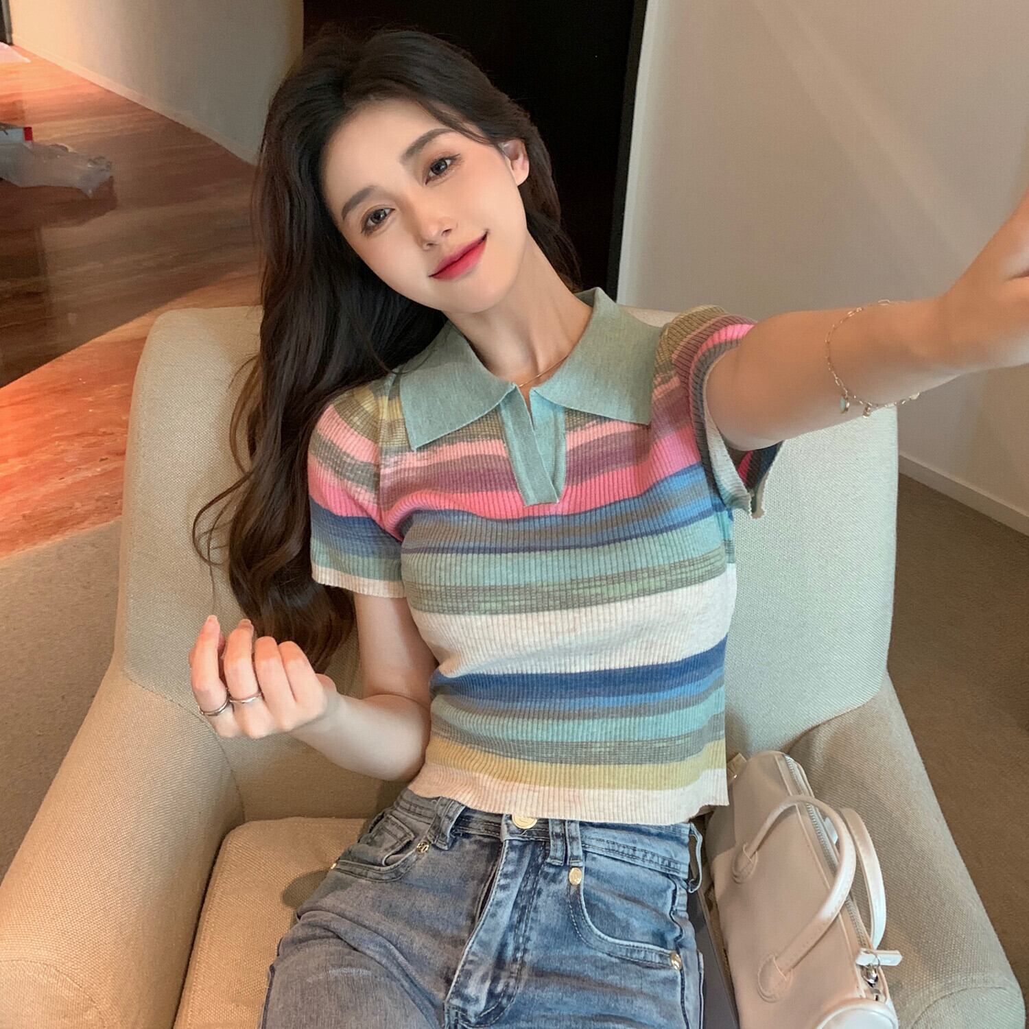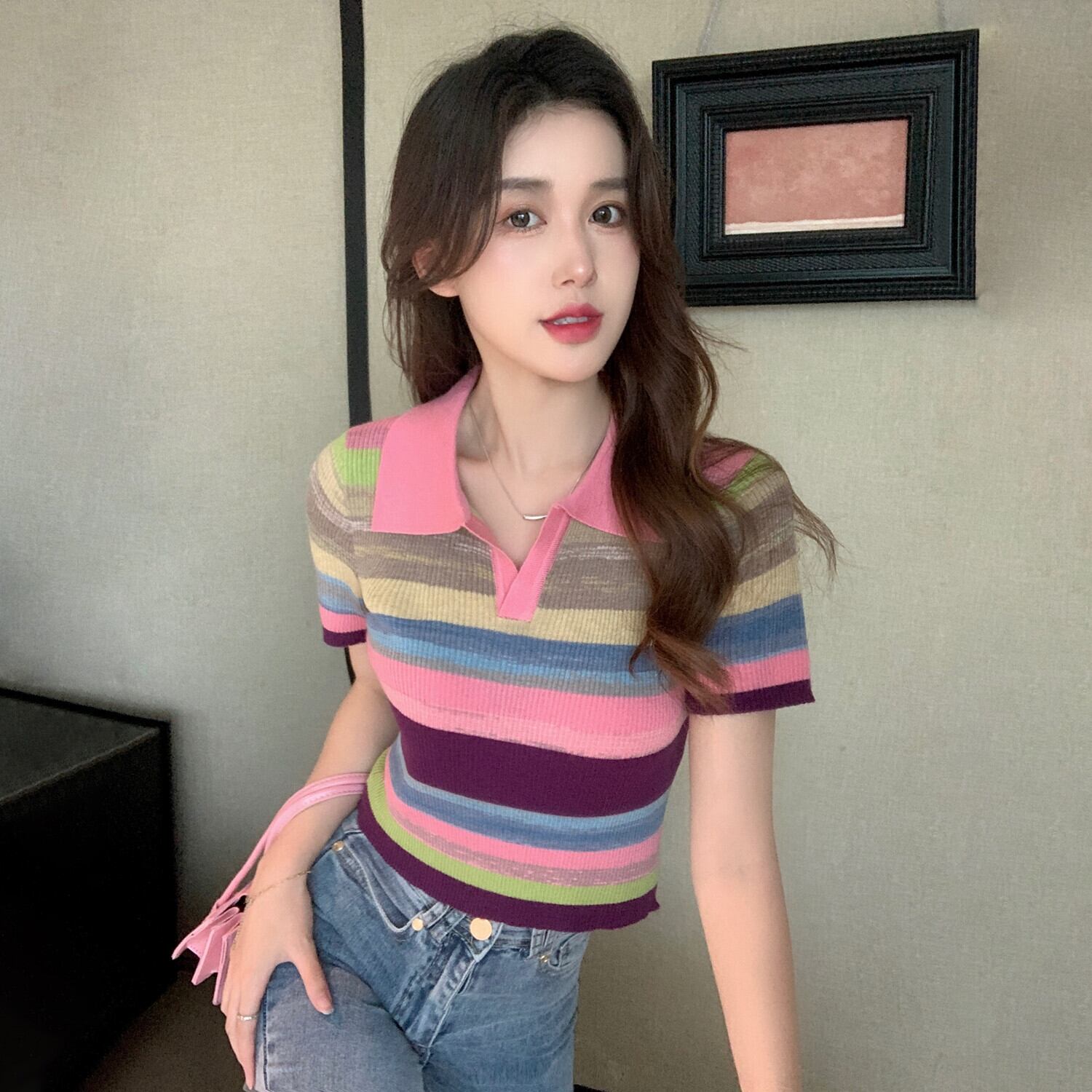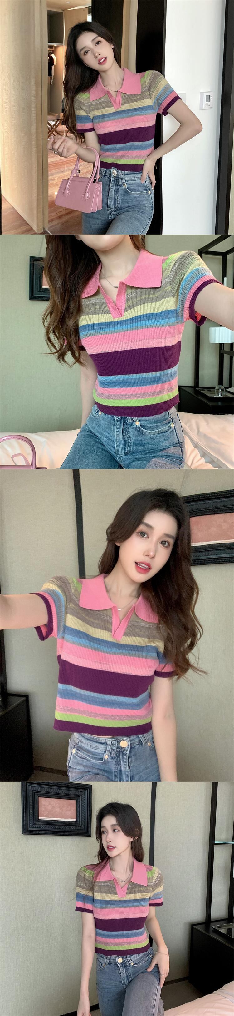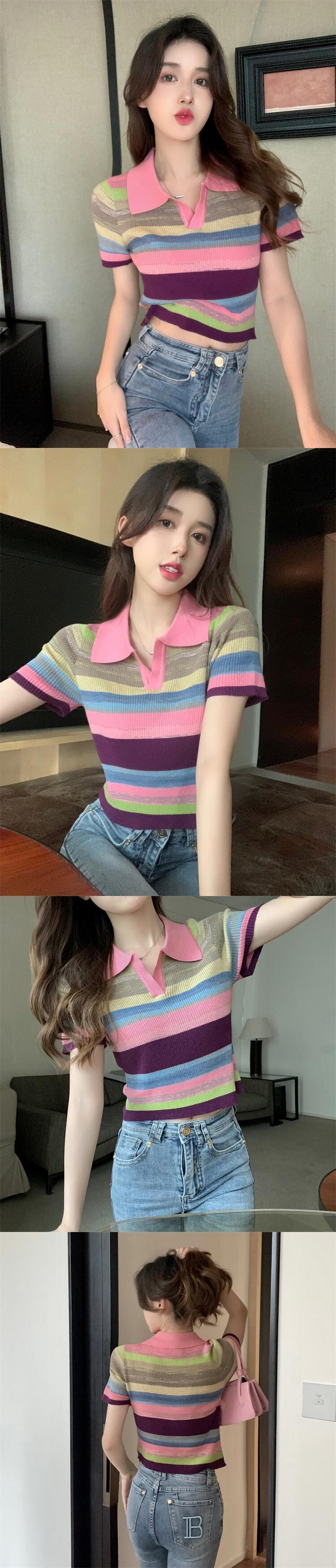 2022年夏の新しいポロカラーショートトップレインボー半袖シックでユニークなデザインのフロントショルダーTシャツの女性 ハーフスリーブ サマー 夏物 7460055645229133 | framboise21