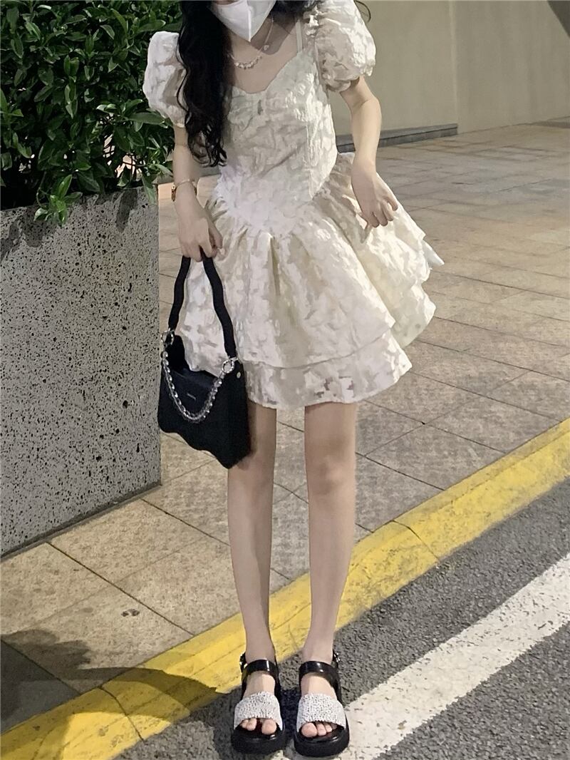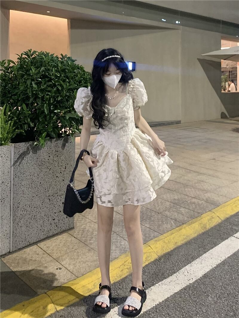 白い人形のドレス女性の夏フレンチスウィートデザインセンスパフスリーブふくらんでいるプリンセススカートスクエアネックショートスカート ホワイト 大人ガーリー キュート カジュアル サマー 夏物 スクウェア 7460064182482843 | framboise21