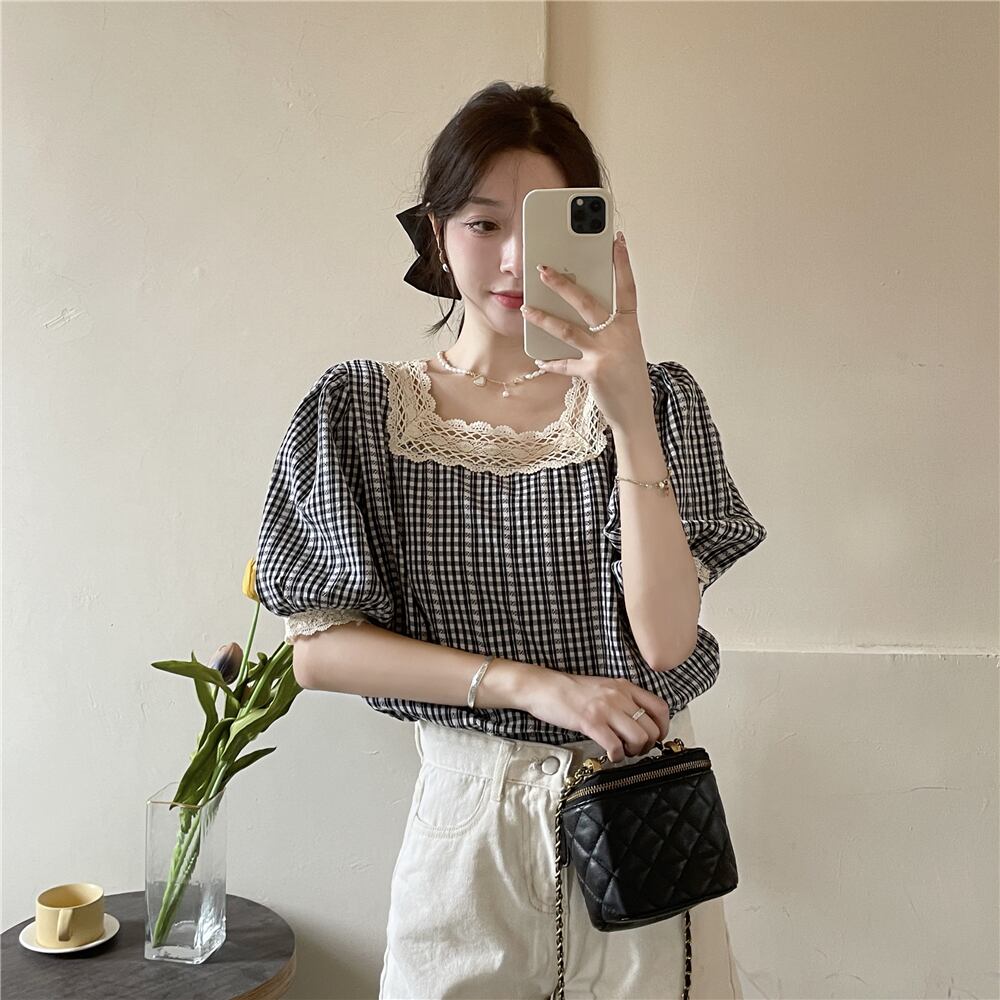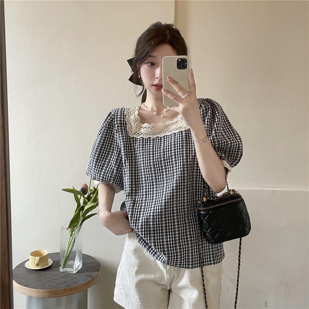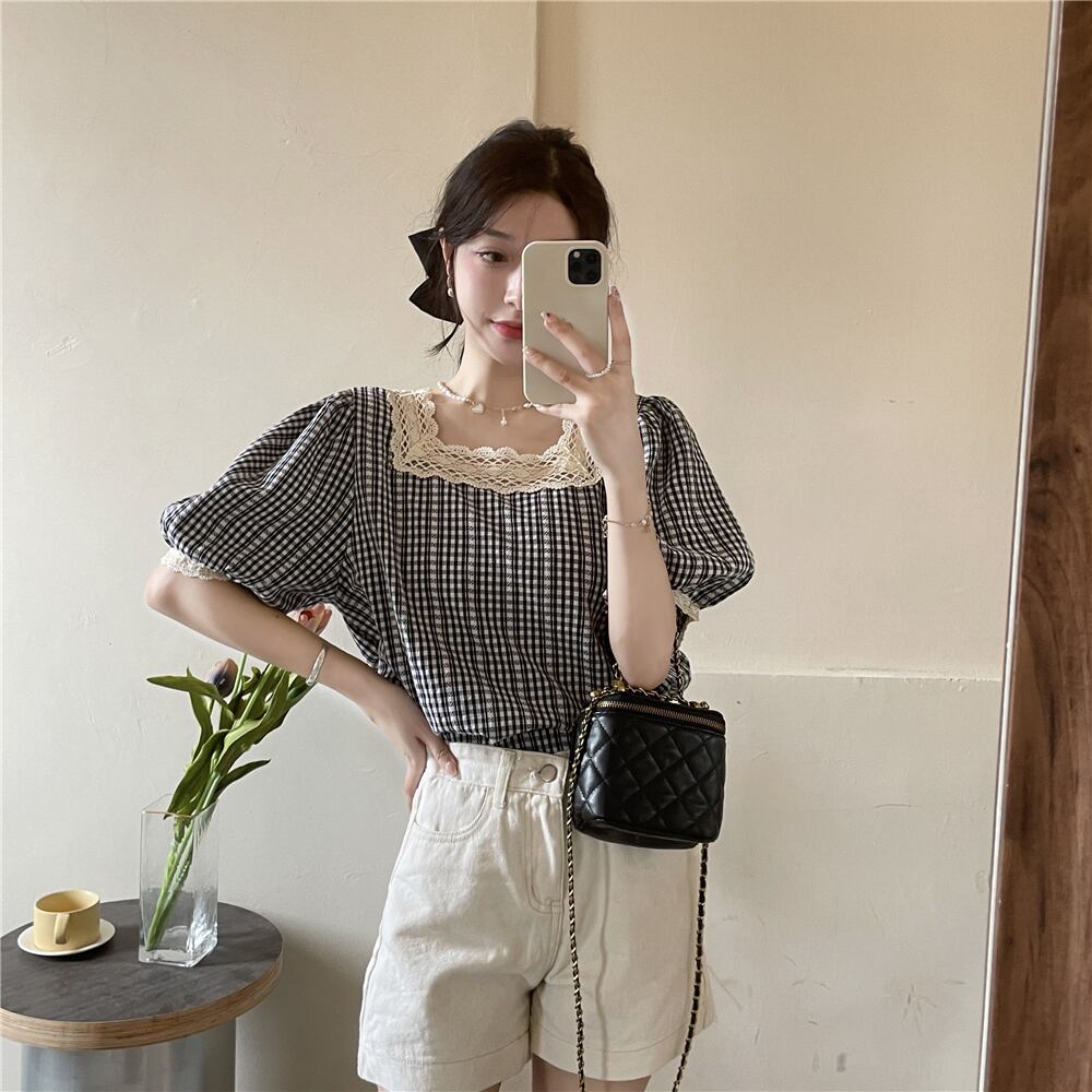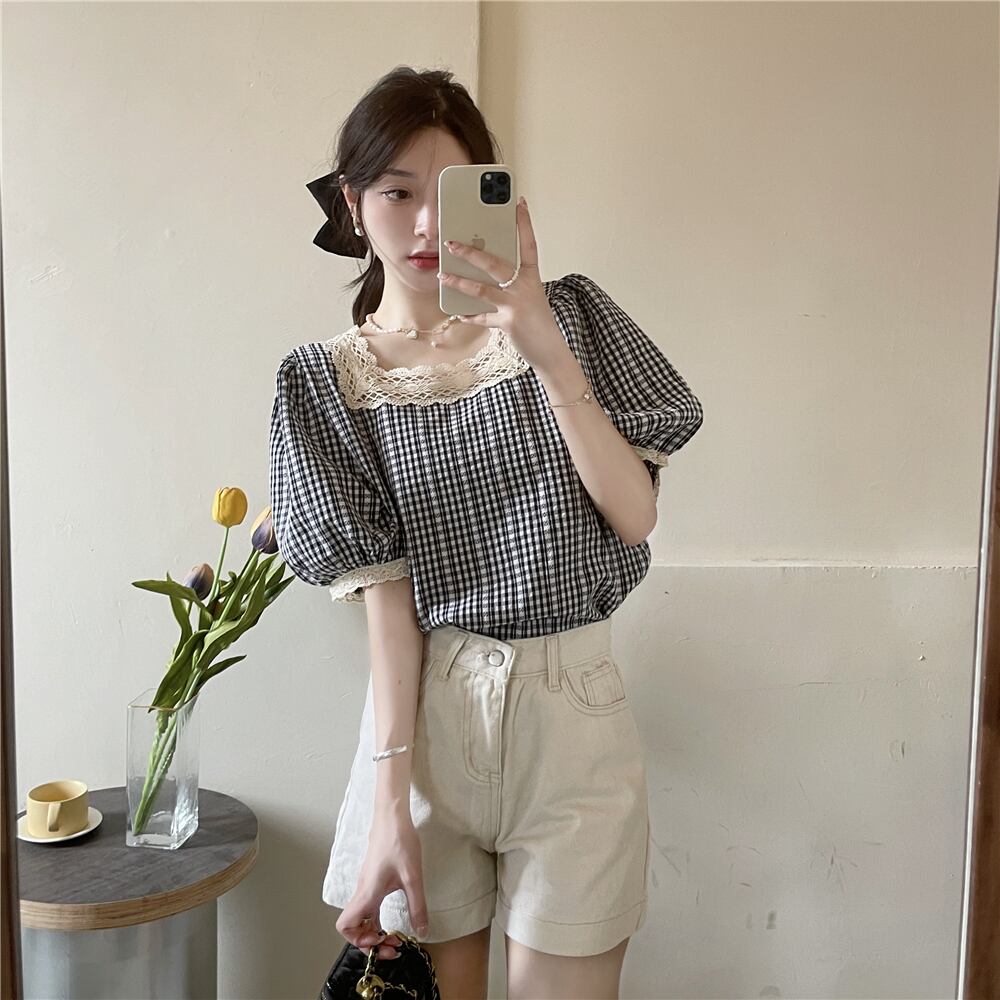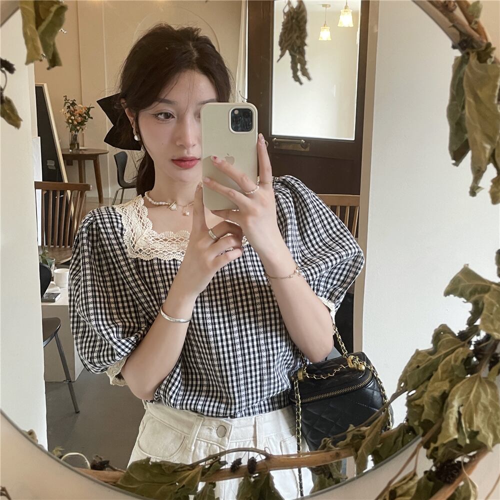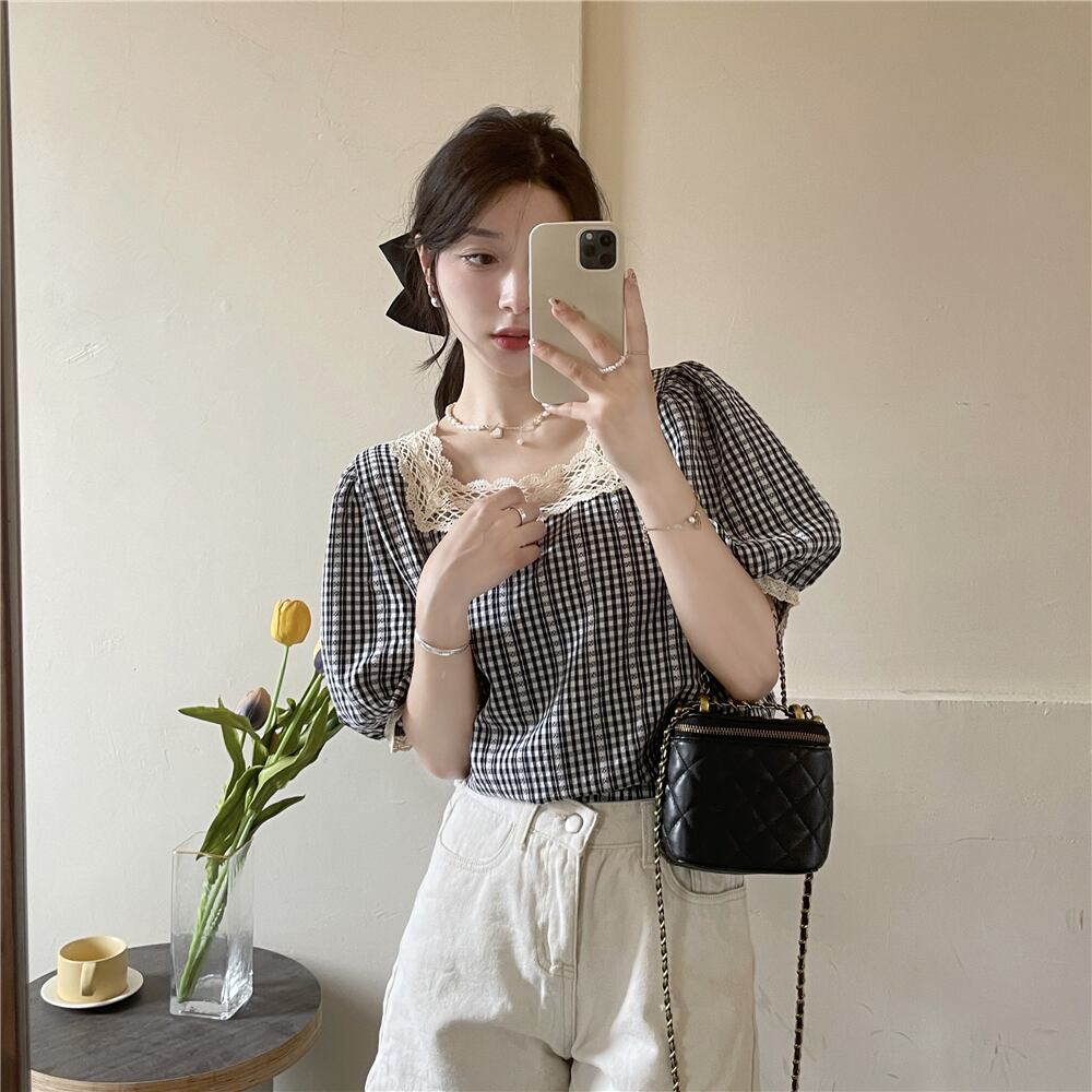 フレンチデザインバブル半袖チェック柄シャツレディースサマーシックで美しいスモールシャツレーススクエアカラートップTシャツ 夏物 スクウェア 7460034740772317 | framboise21