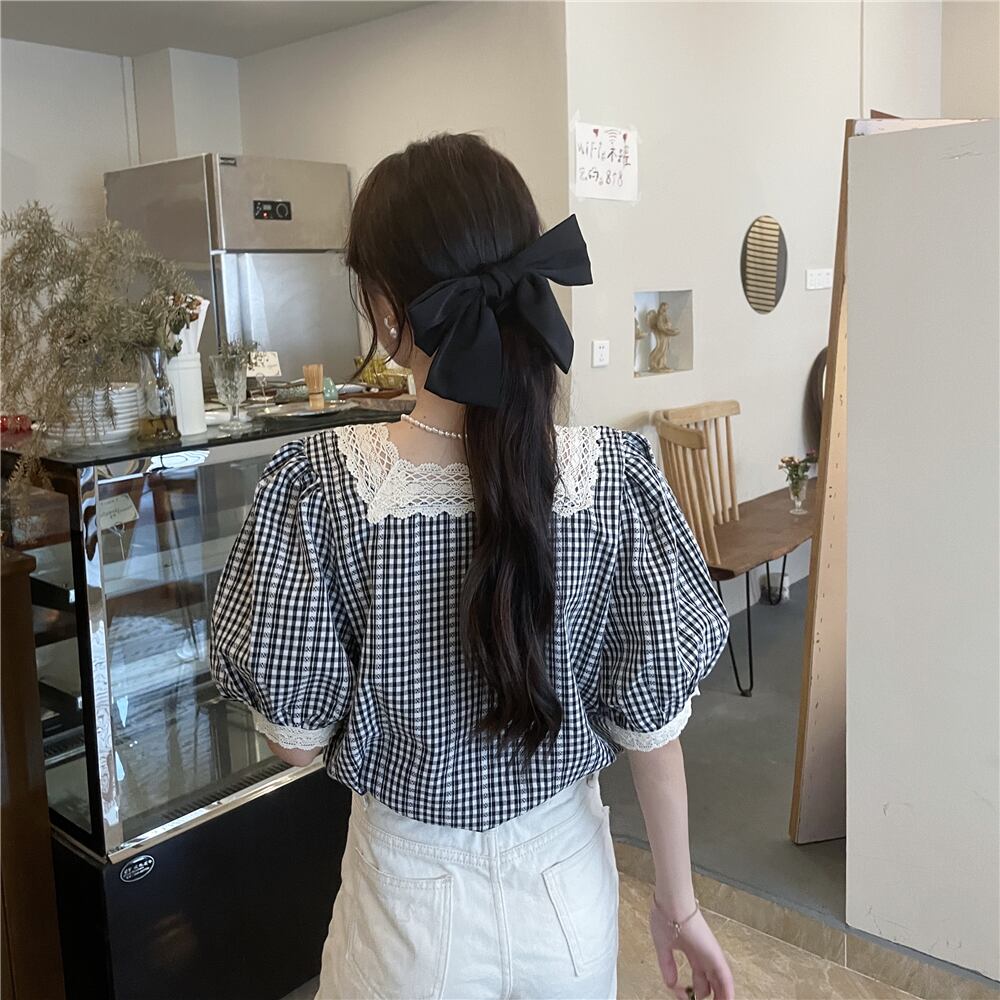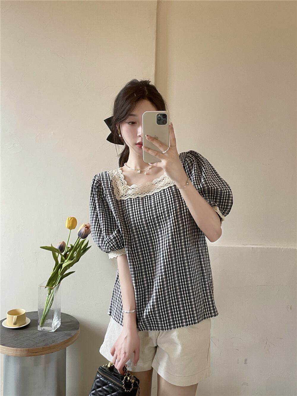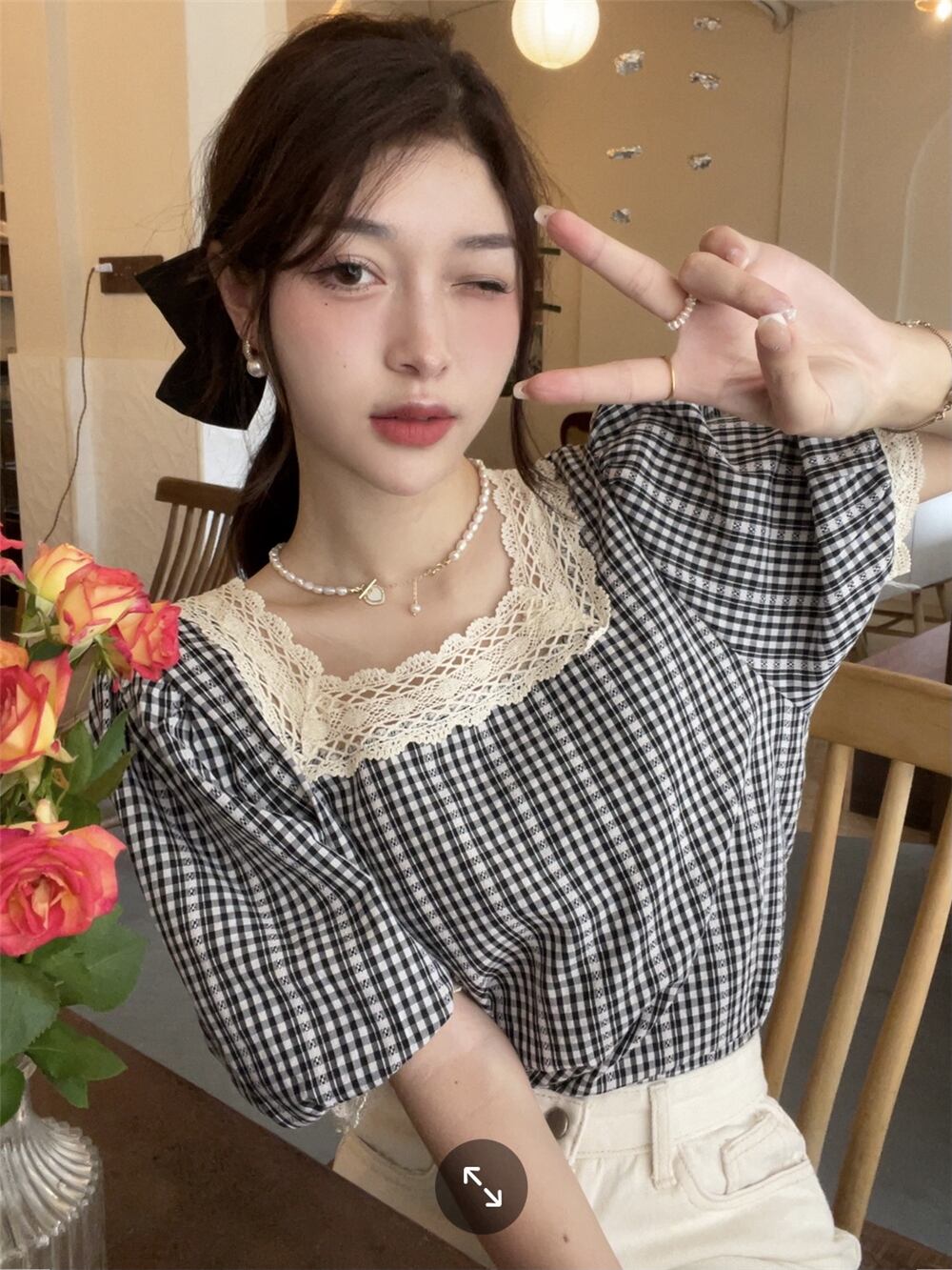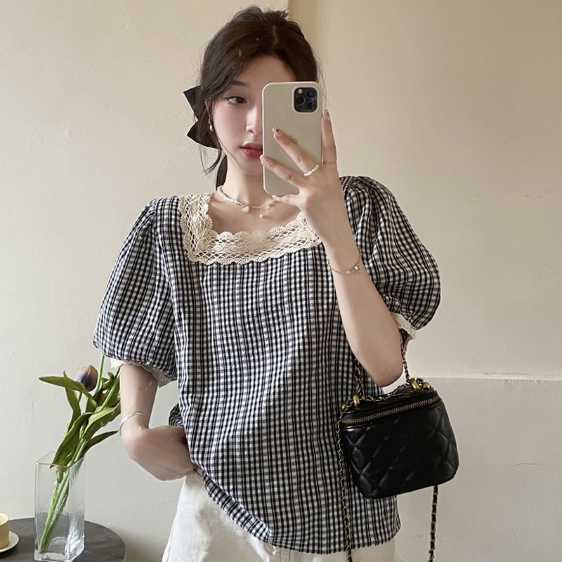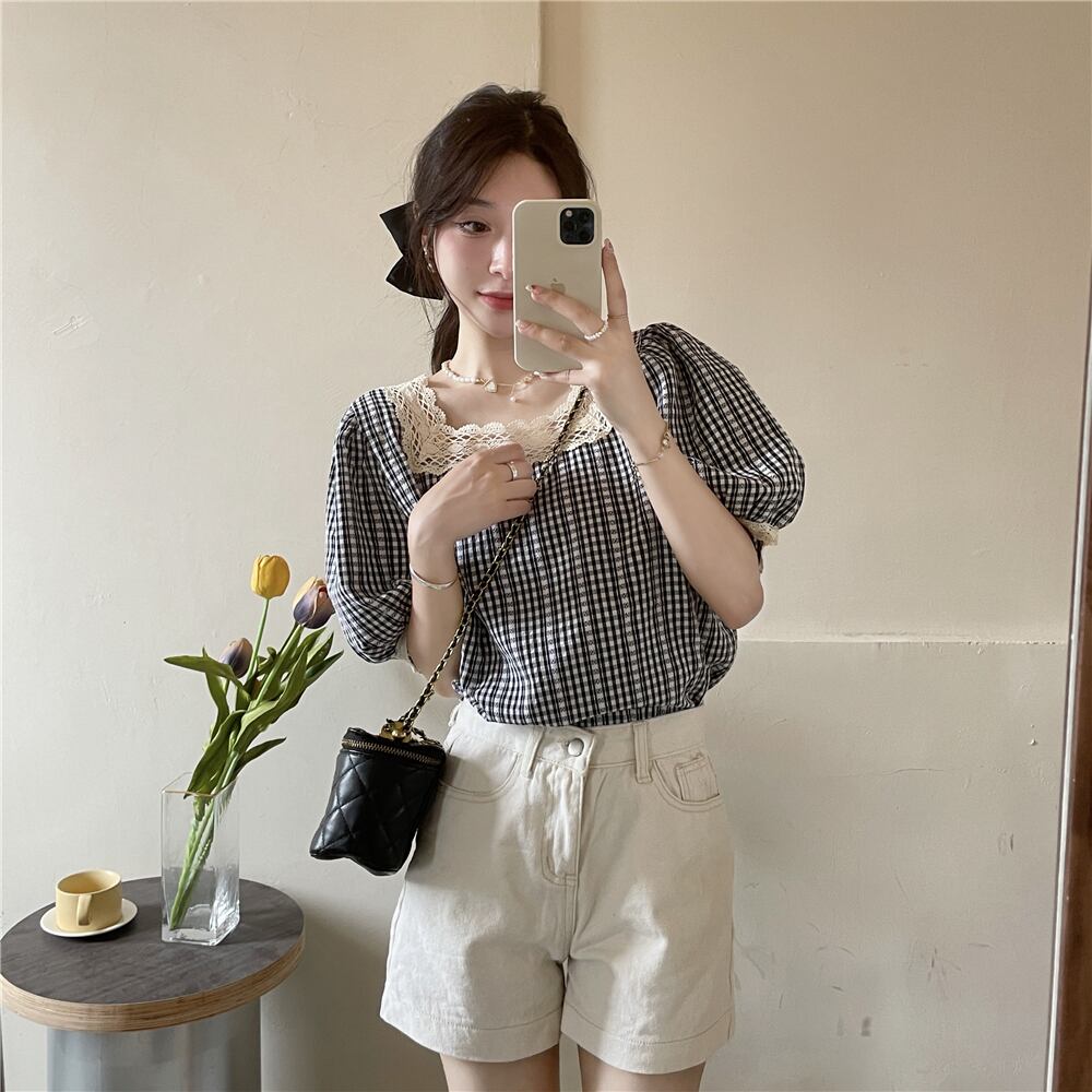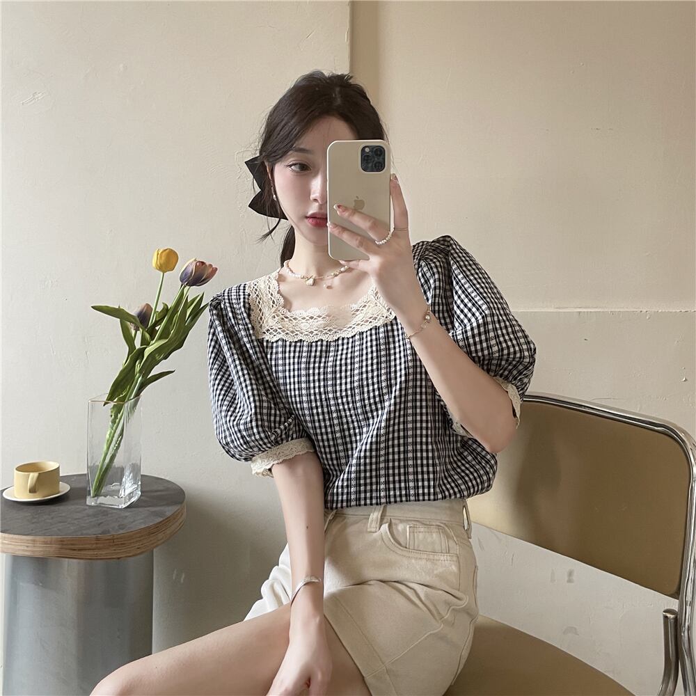 フレンチデザインバブル半袖チェック柄シャツレディースサマーシックで美しいスモールシャツレーススクエアカラートップTシャツ 夏物 スクウェア 7460034740772317 | framboise21