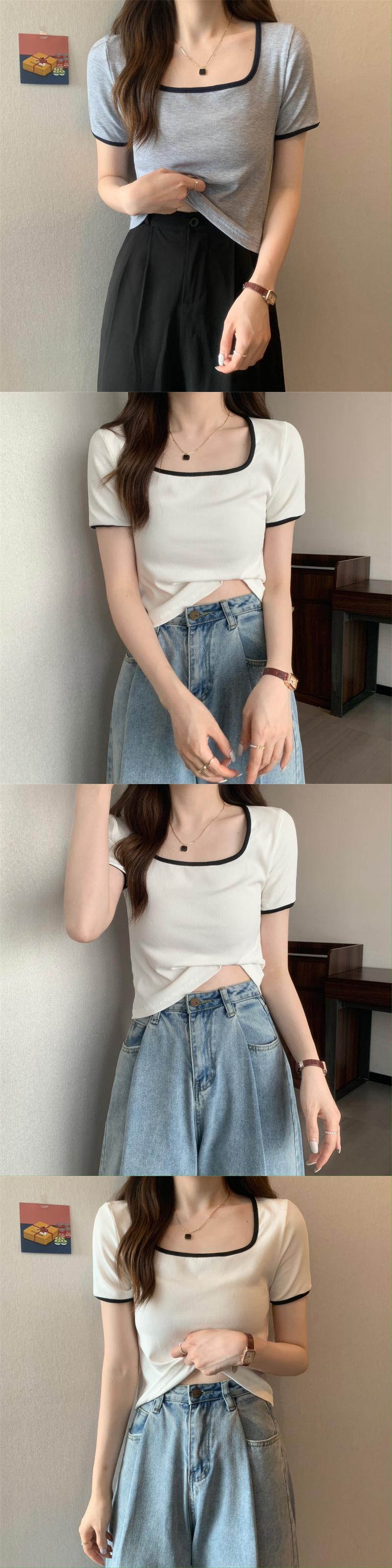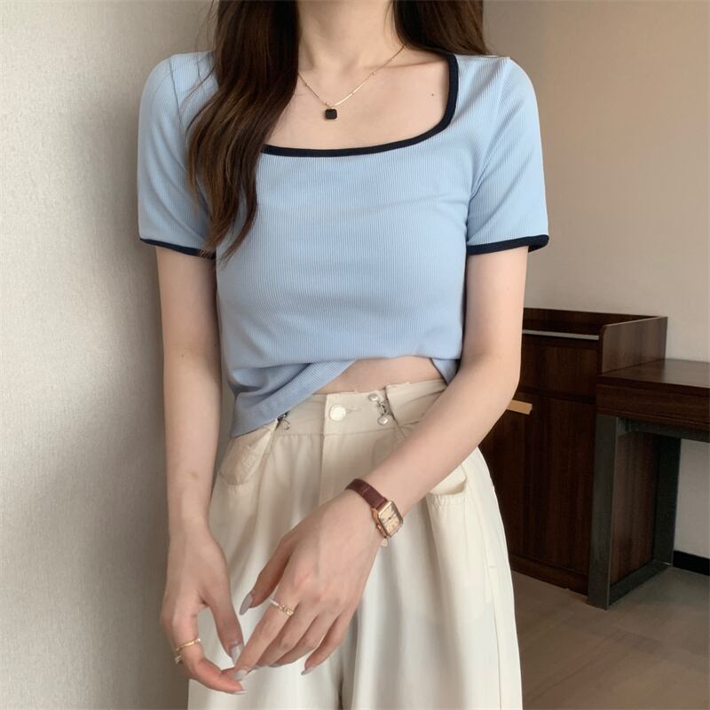 スクエアネックショルダー半袖Tシャツレディースサマーフレンチ鎖骨甘くてスパイシーなスリムスリムピンクショートトップスモールマン 大人ガーリー スウィート キュート カジュアル 夏物 スクウェア 7460025424968631 | framboise21