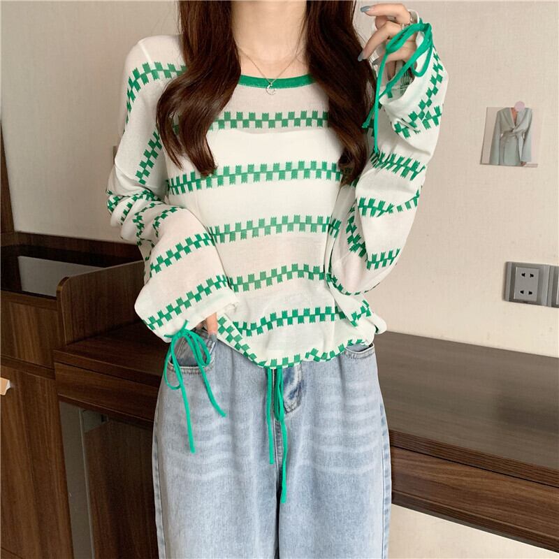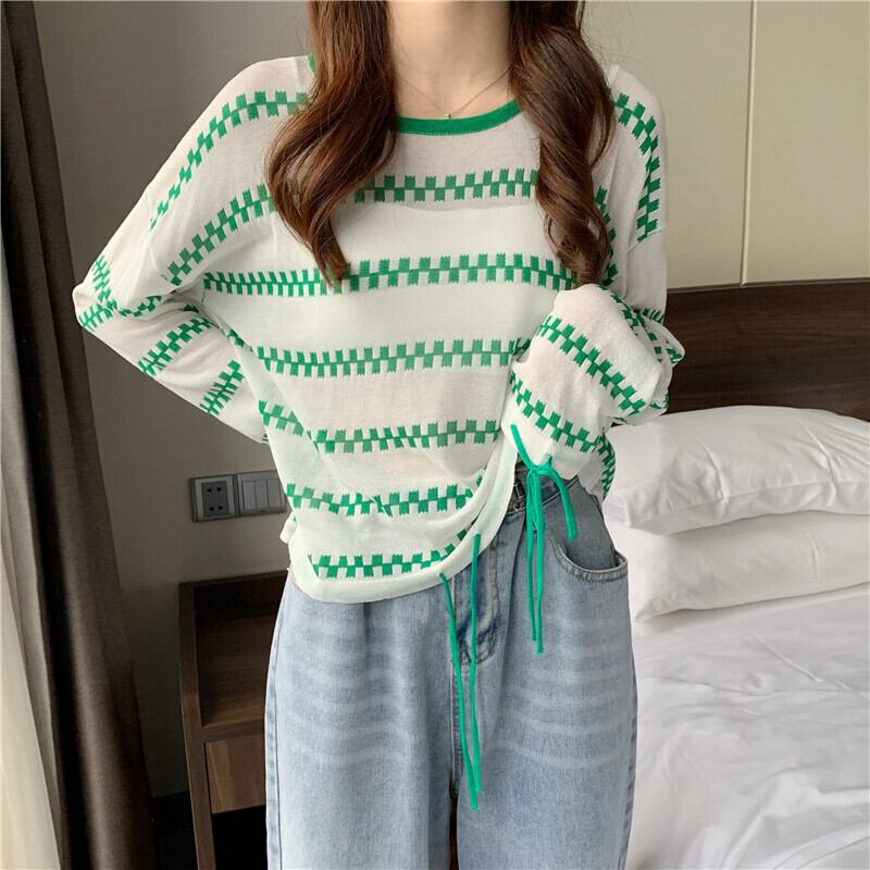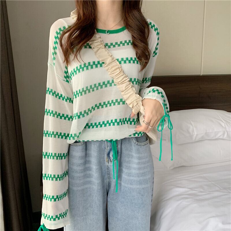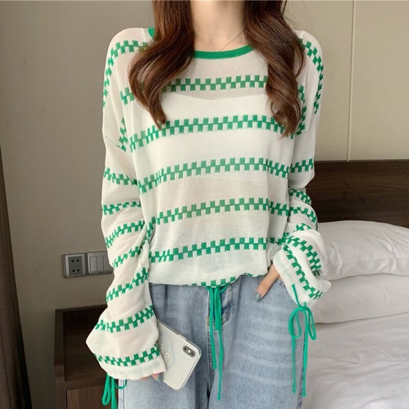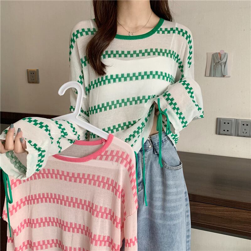 夏の薄手のアイスシルクニットサンスクリーンブラウストップレディースルーズアウターウェア薄潮巾着ストライプ長袖Tシャツ ロング サマー 夏物 7460015548269616 | framboise21