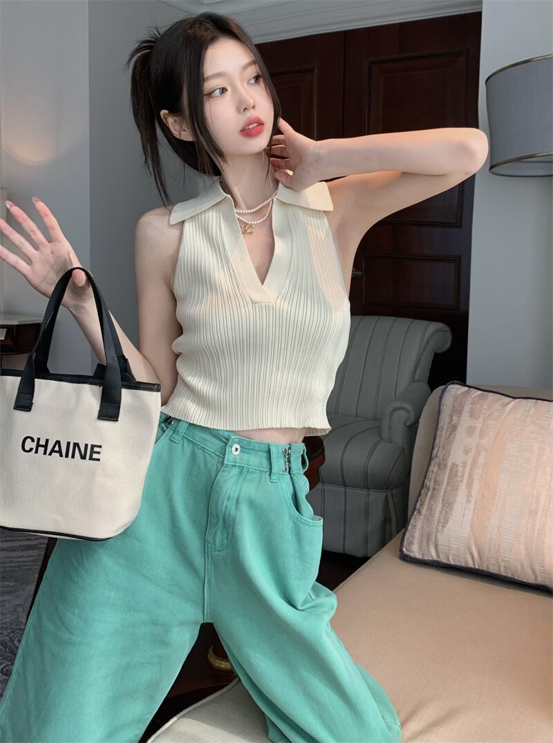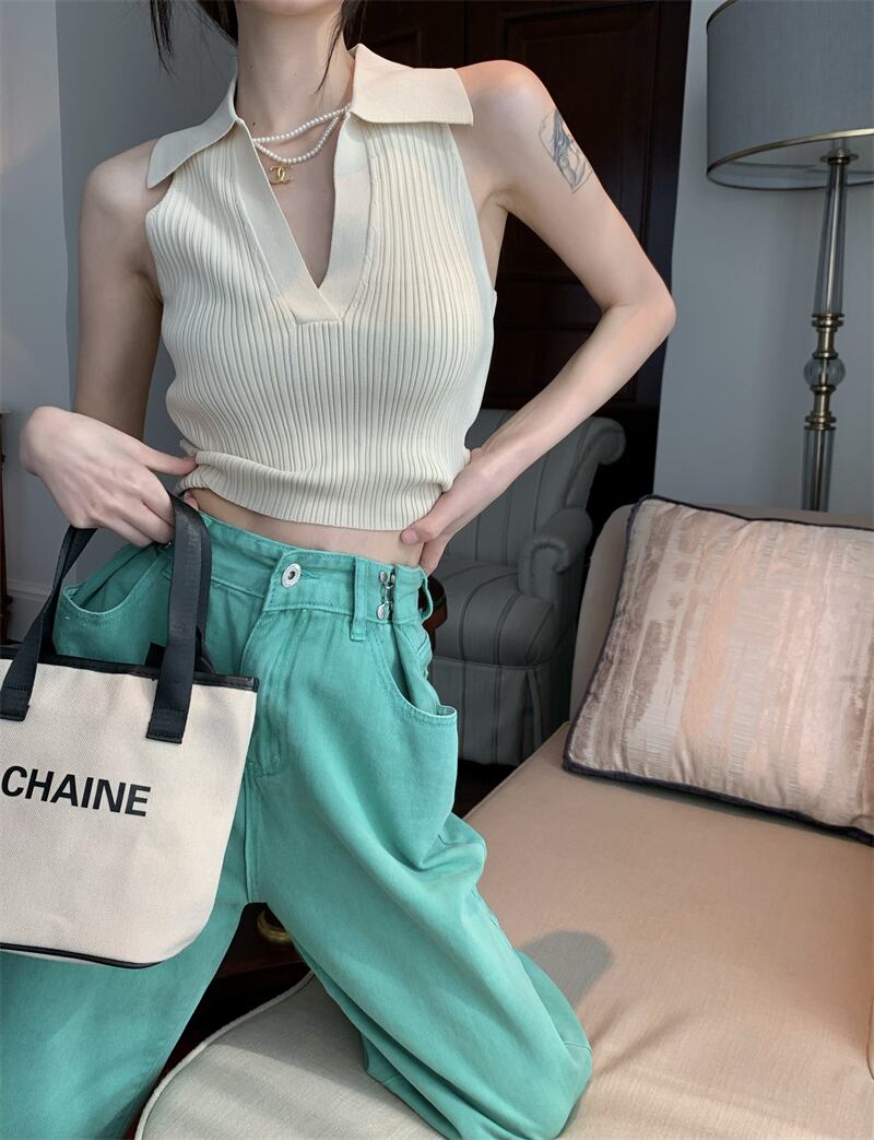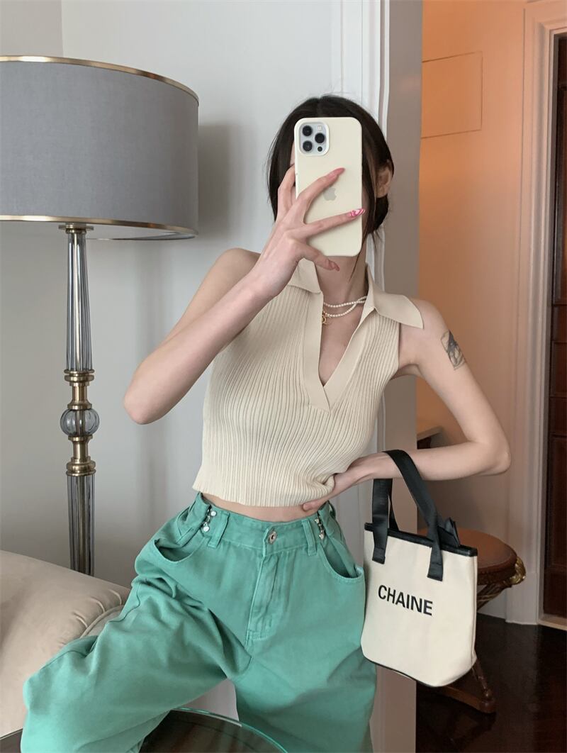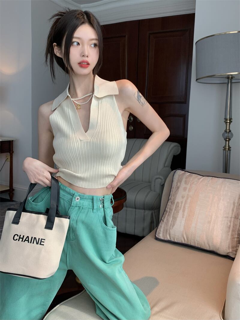 ニットベストレディースサマーノースリーブサスペンダーアウターウェアPOLOカラーピュアデザイアスタイル美しいバックセクシーインナーショートホルタートップ 夏物 7460013660419913 | framboise21