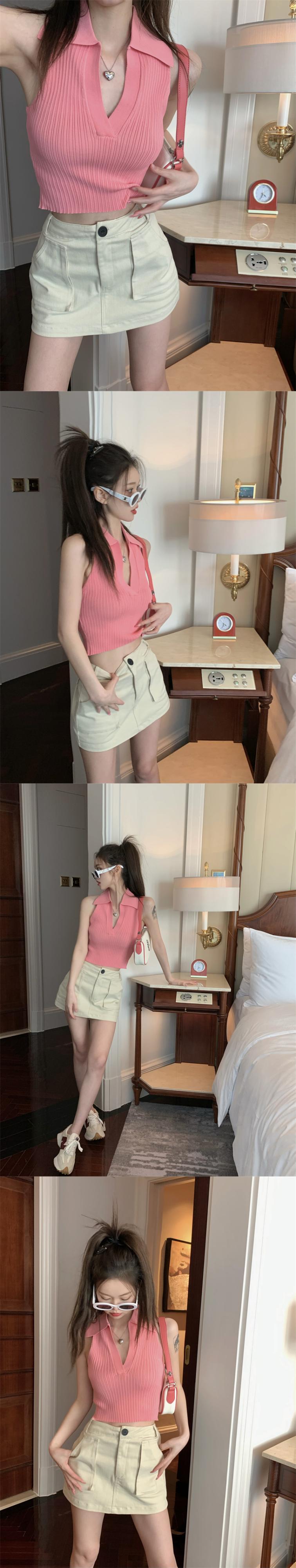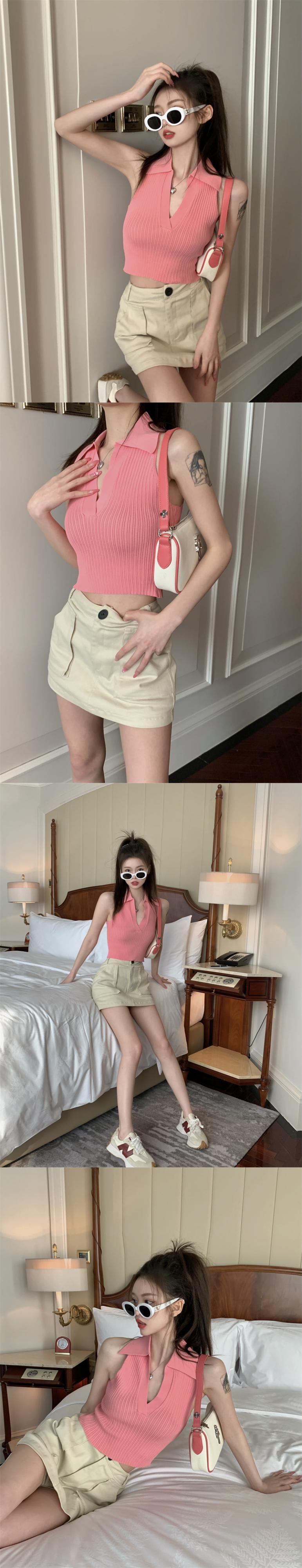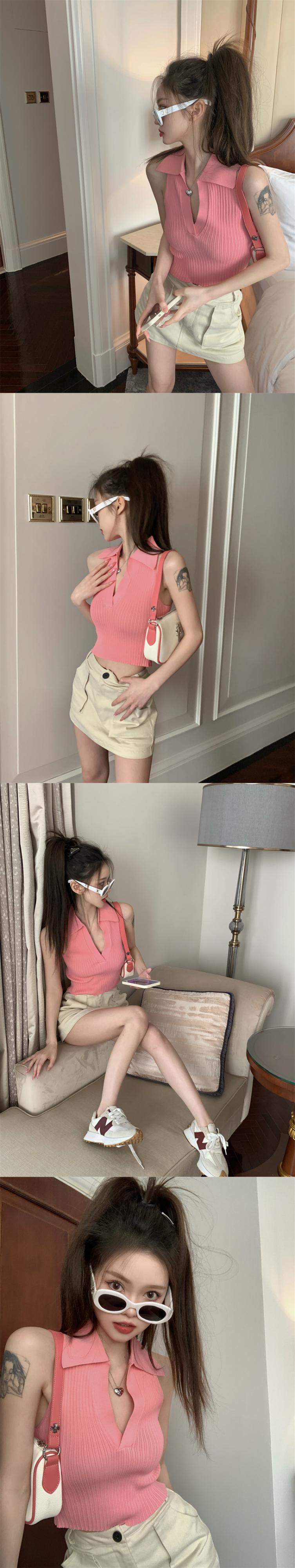 ニットベストレディースサマーノースリーブサスペンダーアウターウェアPOLOカラーピュアデザイアスタイル美しいバックセクシーインナーショートホルタートップ 夏物 7460013660419913 | framboise21