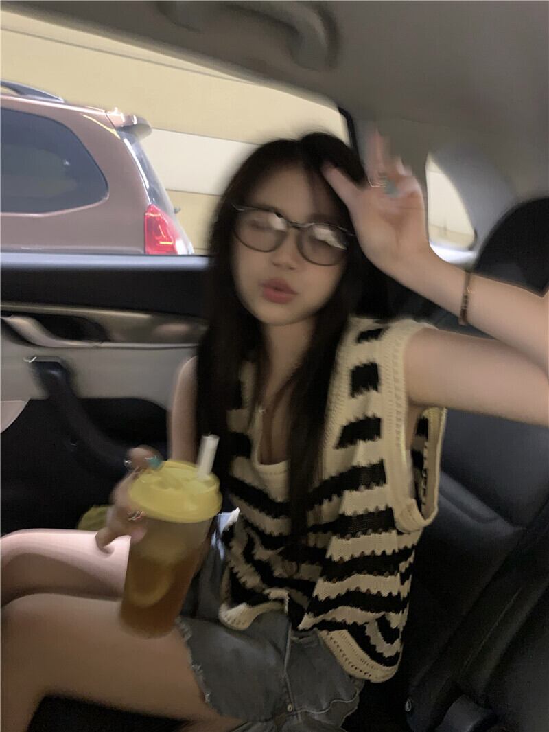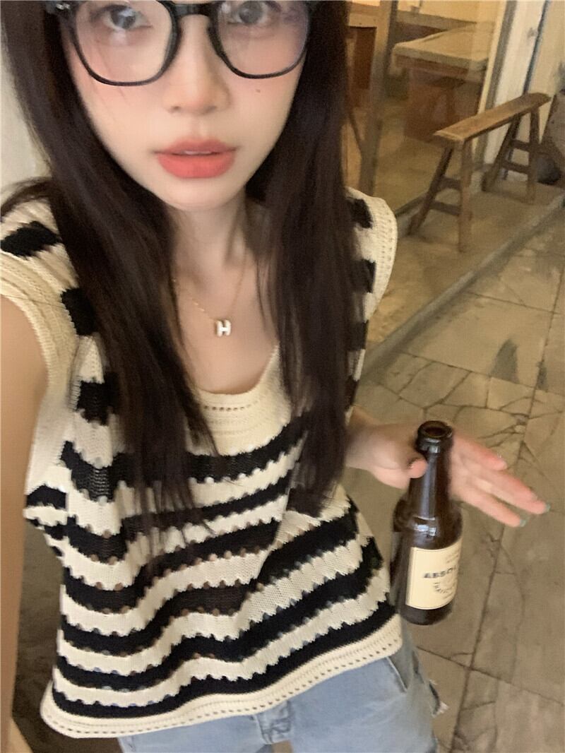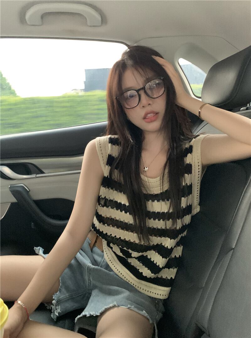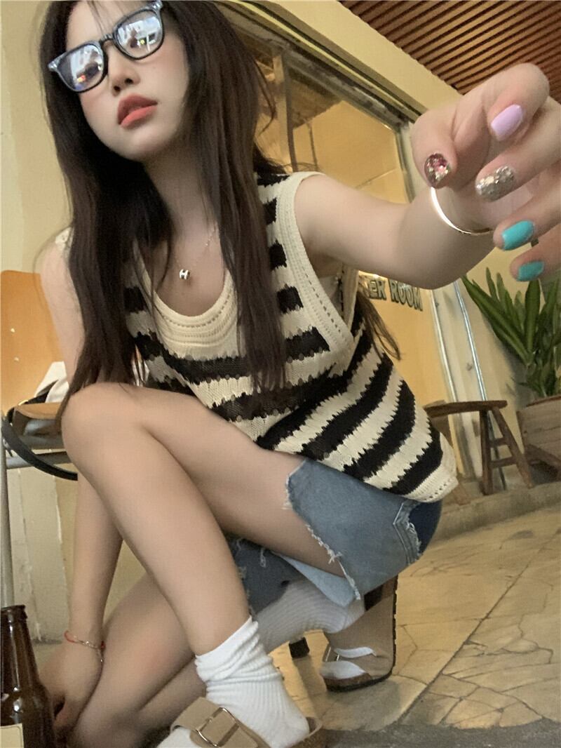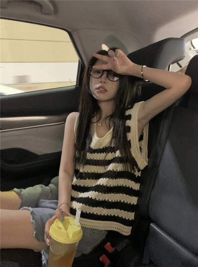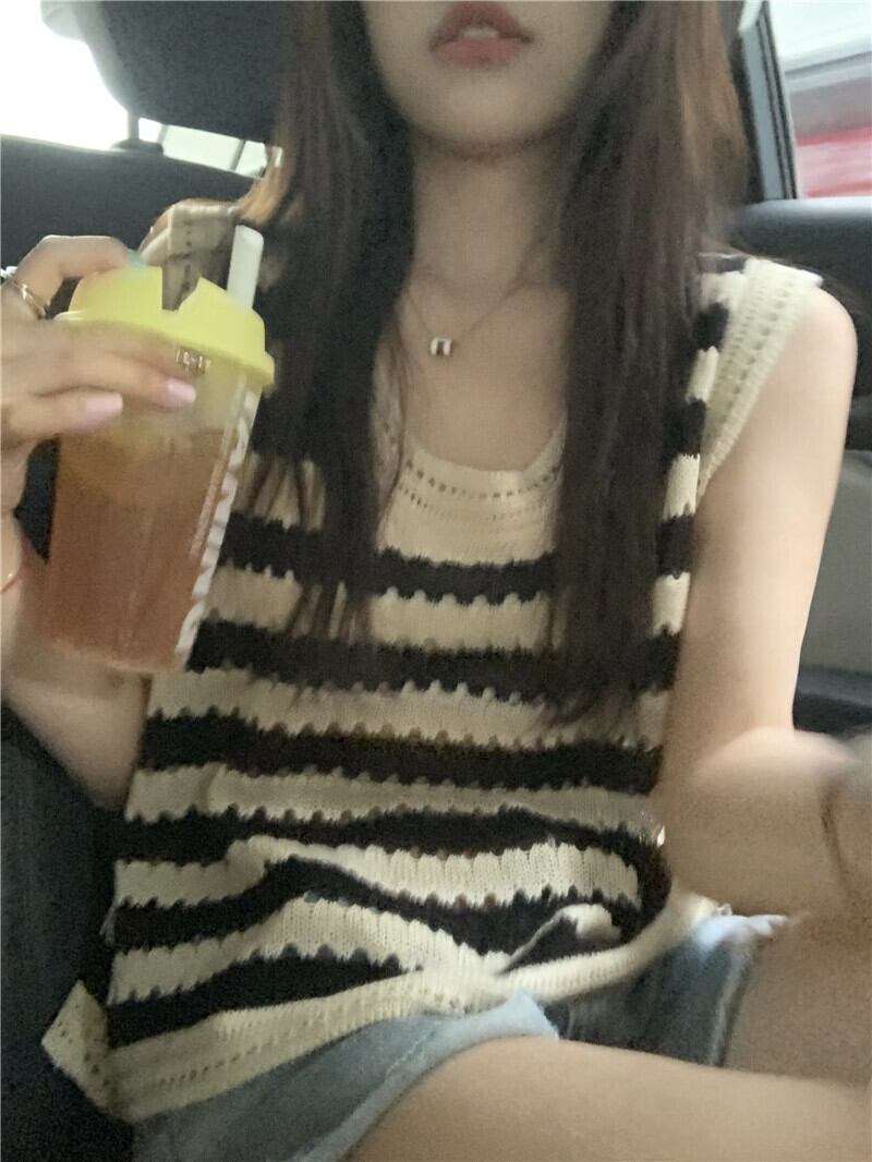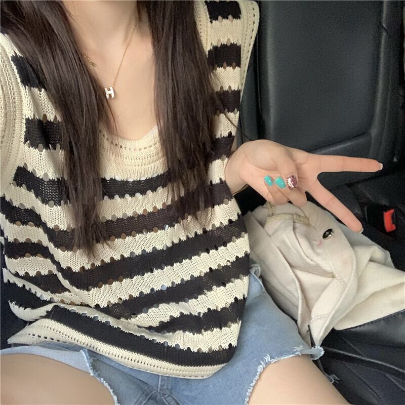 アメリカンストライプニット中空キャミソールレディースサマーアウターウェアルーズノースリーブ甘くてスパイシーなベストTシャツトップレディース 大人ガーリー スウィート キュート カジュアル 夏物 7460063902790517 | framboise21