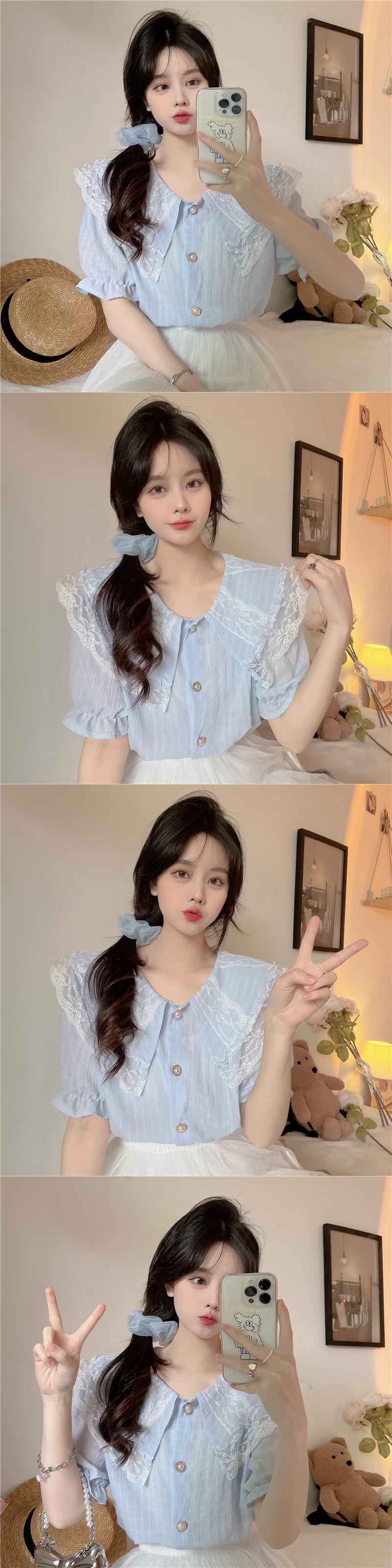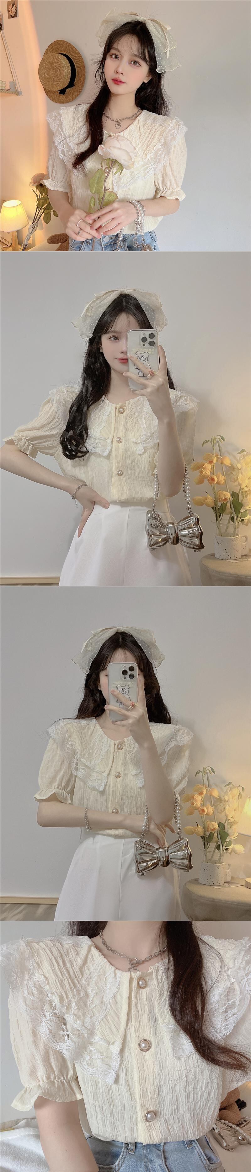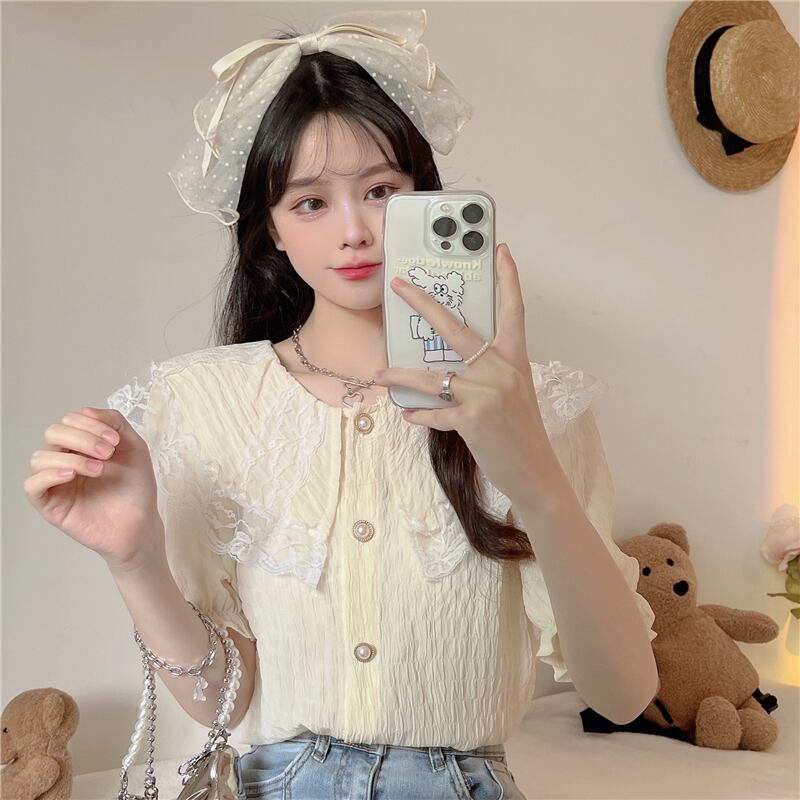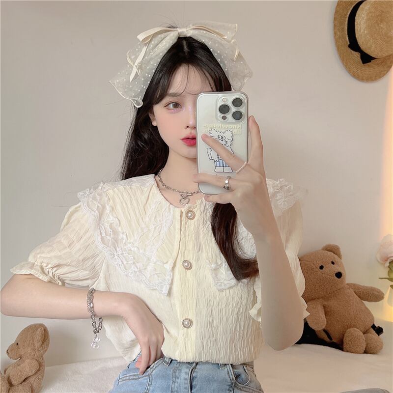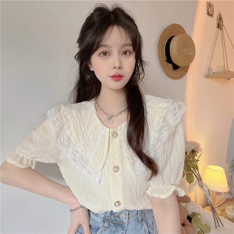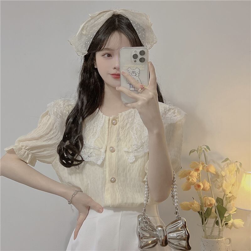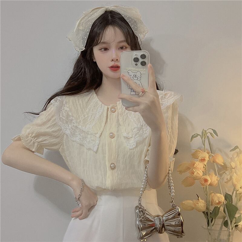 レースドールカラー半袖シャツレディースサマーフレンチスモールフレグランスパフスリーブシャツ品質のピュアスウィートトップ ショート ハーフスリーブ 大人ガーリー キュート カジュアル 夏物 7460040276560480 | framboise21