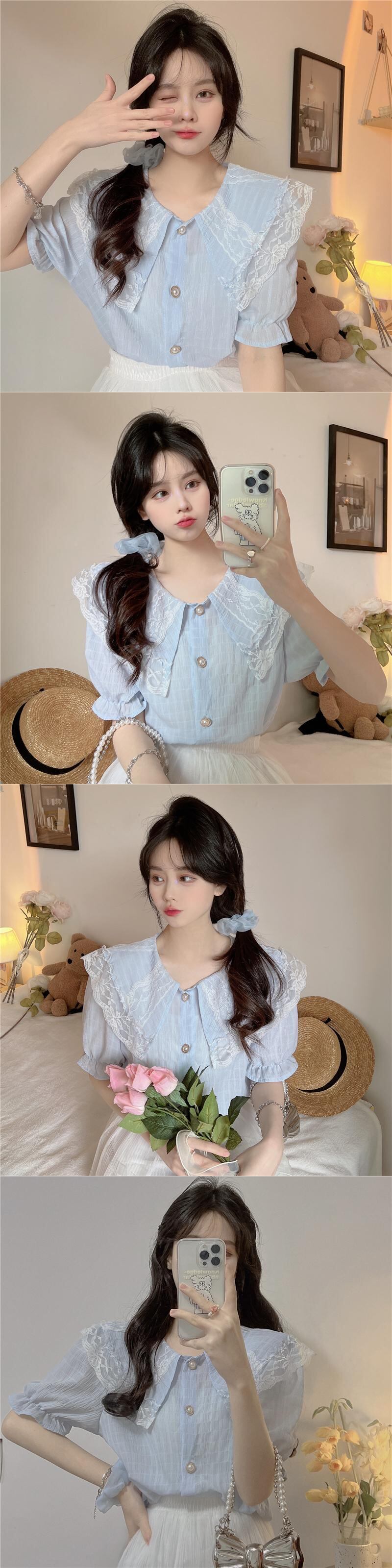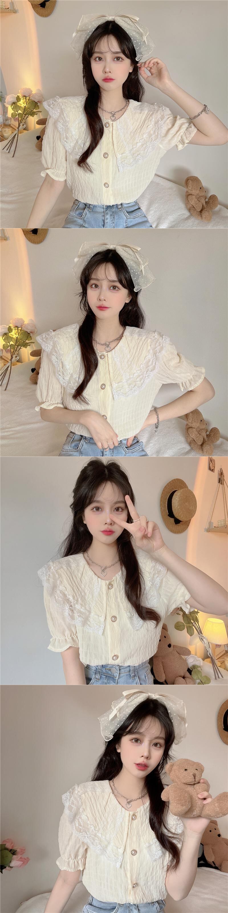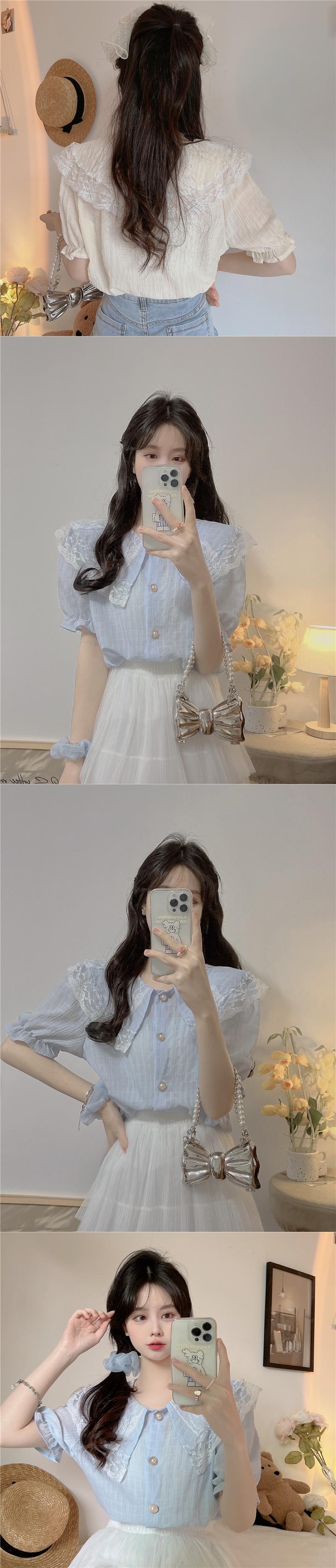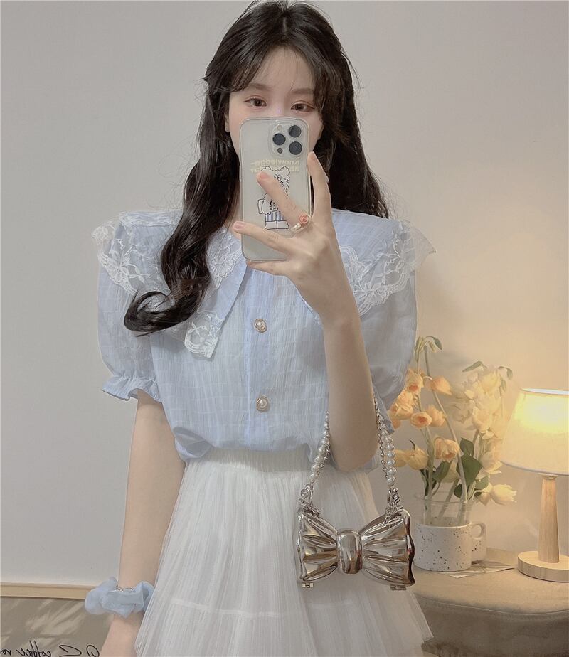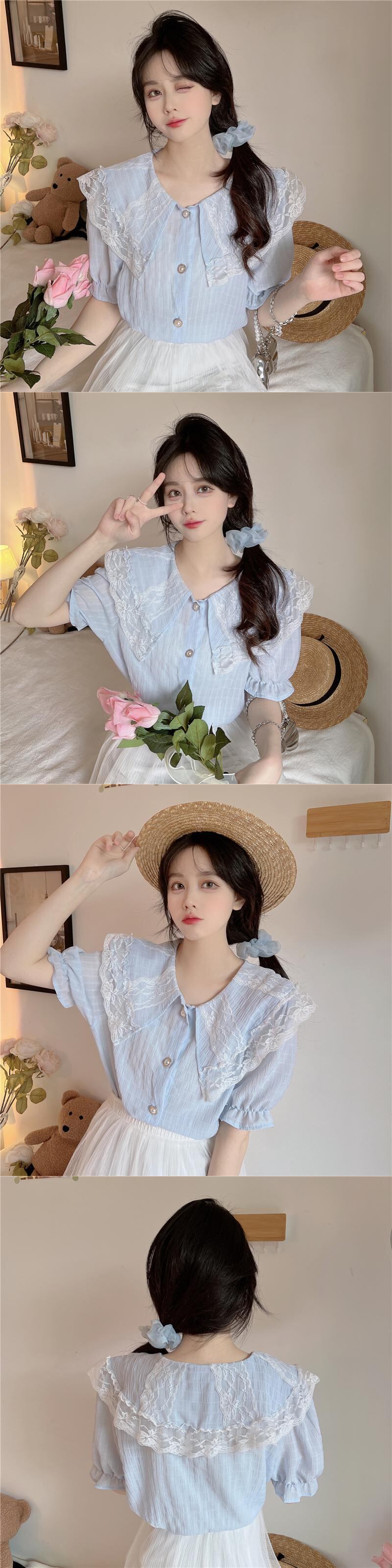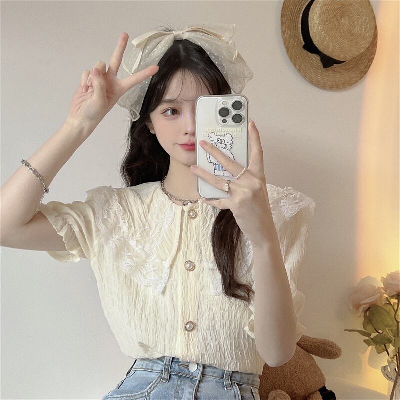 レースドールカラー半袖シャツレディースサマーフレンチスモールフレグランスパフスリーブシャツ品質のピュアスウィートトップ ショート ハーフスリーブ 大人ガーリー キュート カジュアル 夏物 7460040276560480 | framboise21