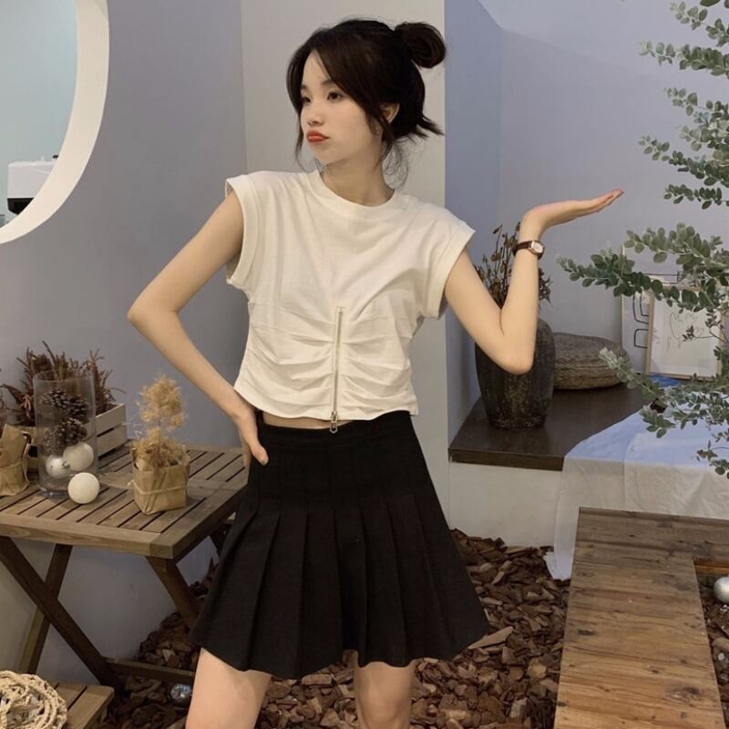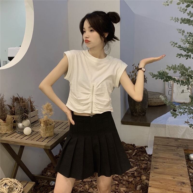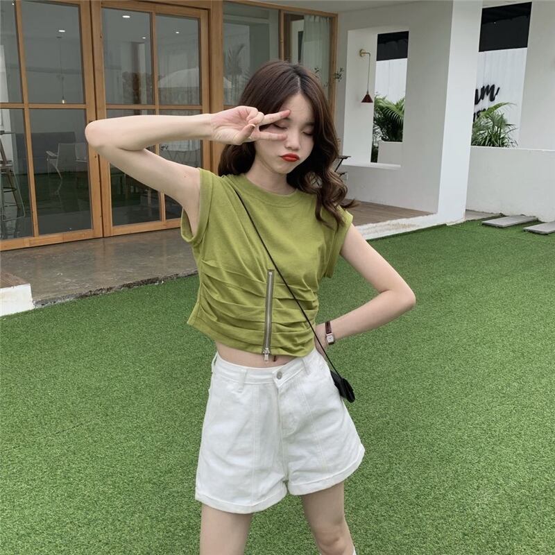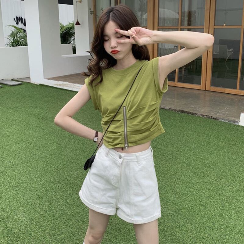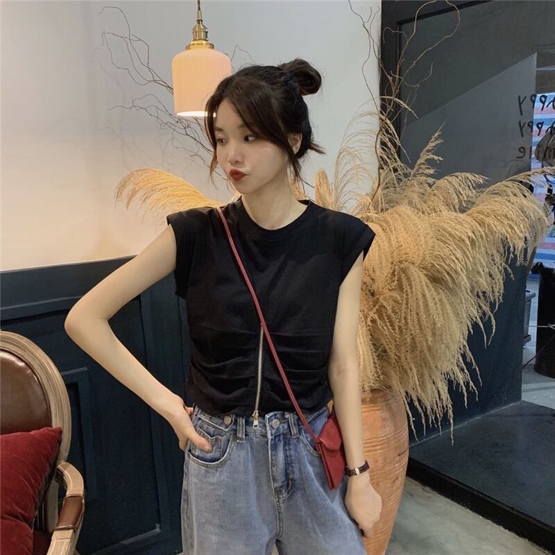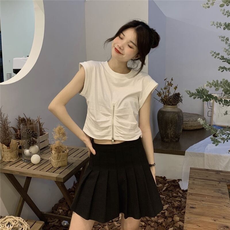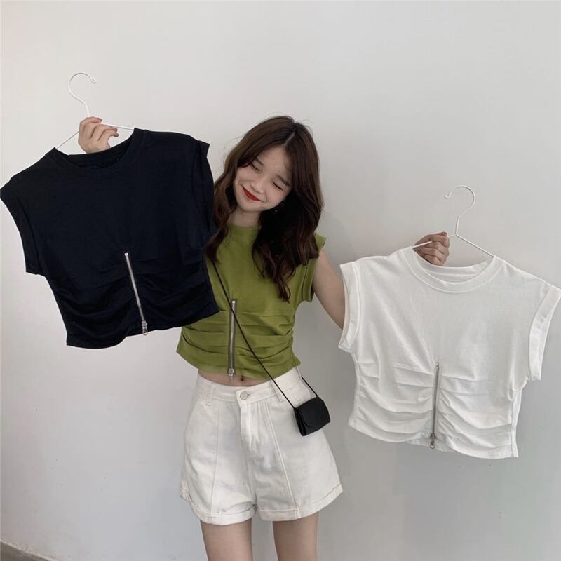 シックなトップスの女性の夏のラウンドネック半袖イントレンディなデザインセンスニッチジッパーノースリーブプリーツへそショートTシャツ ハーフスリーブ サマー 夏物 Oネック 7460028742351223 | framboise21